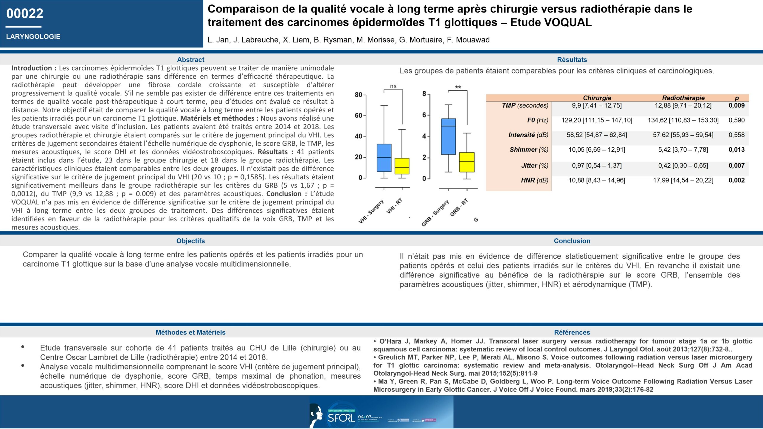 Comparaison de la qualité vocale à long terme après chirurgie versus radiothérapie dans le traitement des carcinomes épidermoïdes T1 glottiques – Etude VOCAL