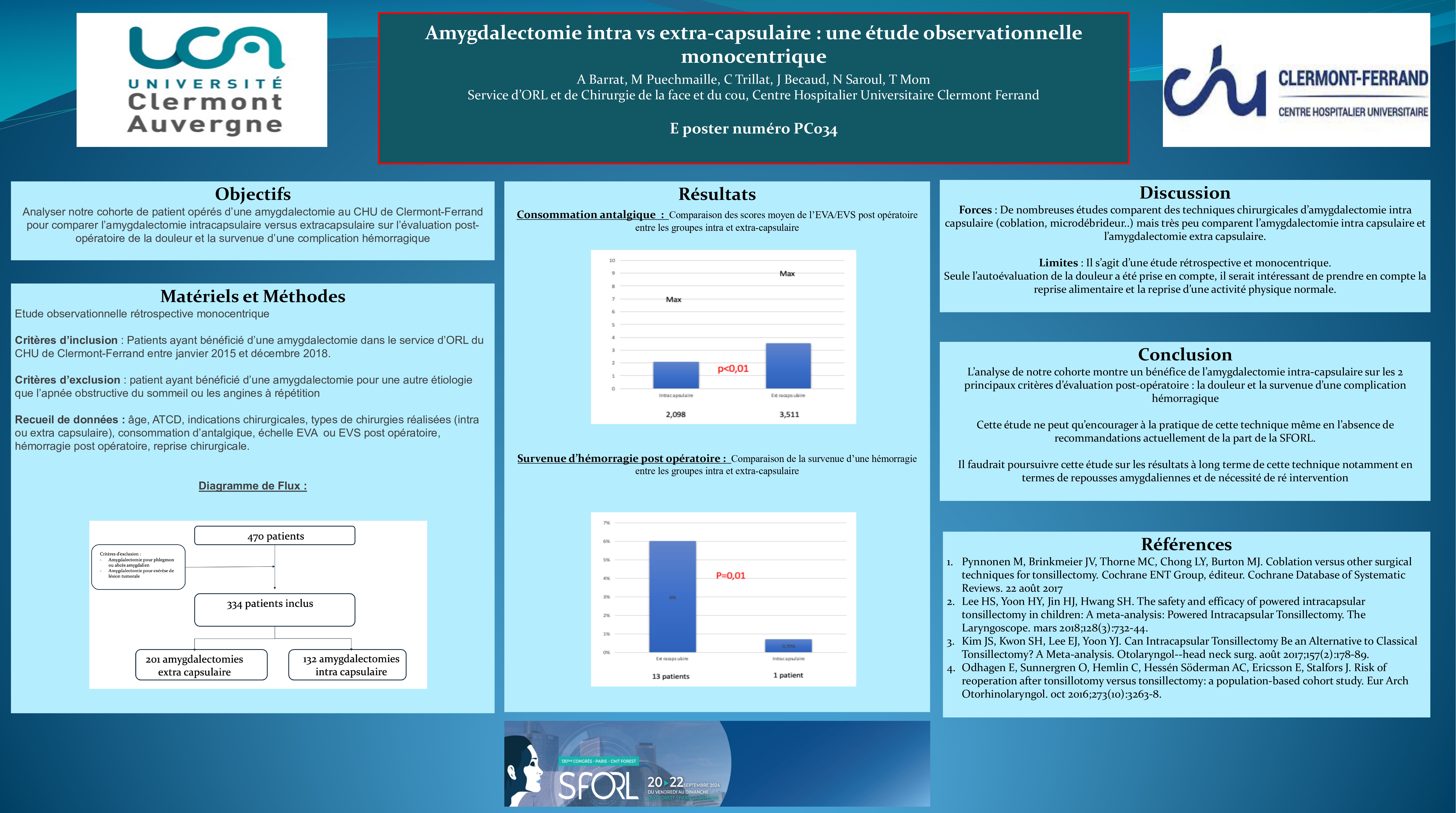 | PC034 – Amygdalectomie intra ou extra-capsulaire : une étude observationnelle monocentrique | ORL Pédiatrique | orl-pediatrique | |