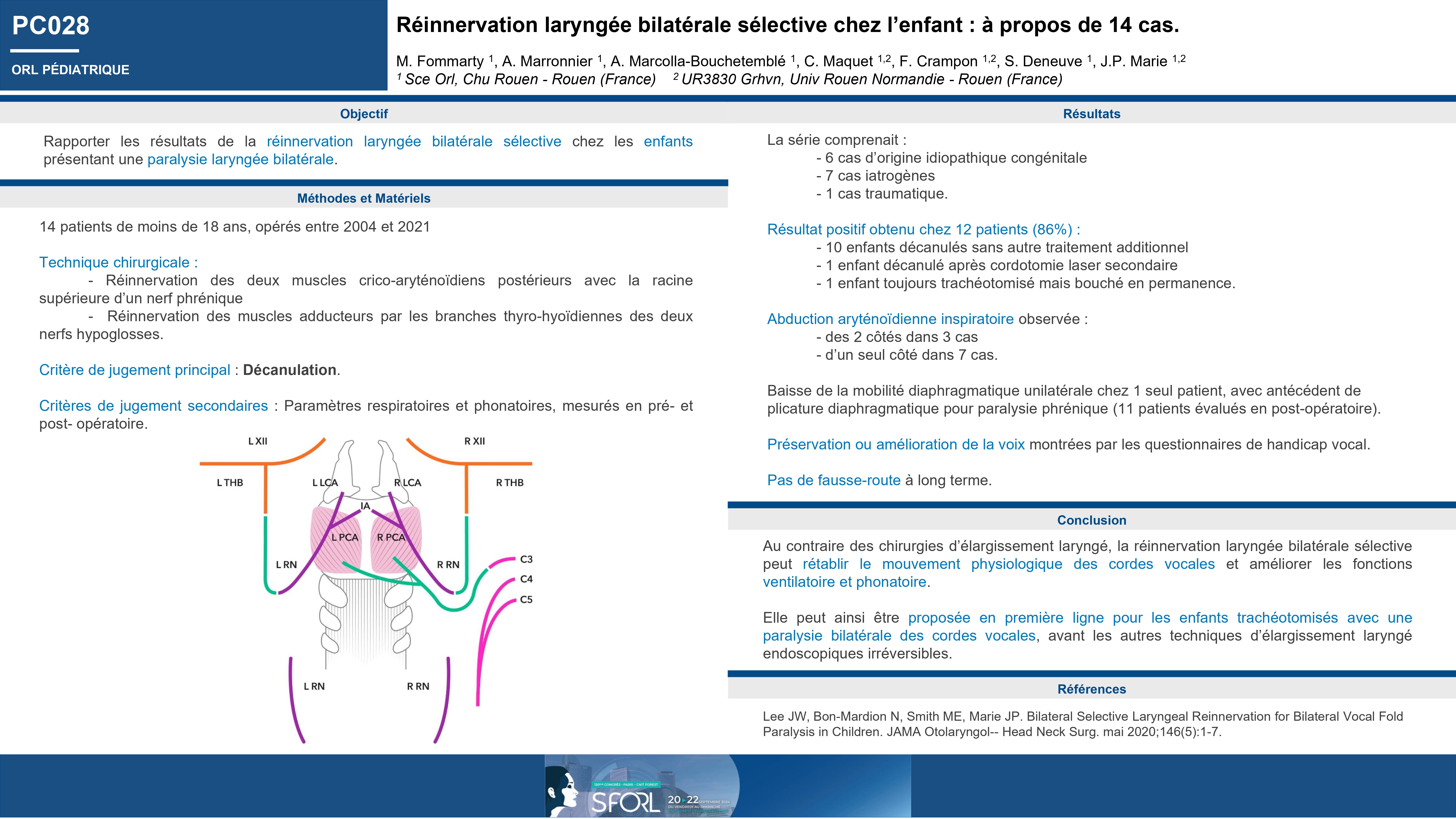 | PC028 – Réinnervation laryngée bilatérale sélective chez l’enfant: à propos de 14 cas. | ORL Pédiatrique | orl-pediatrique | |