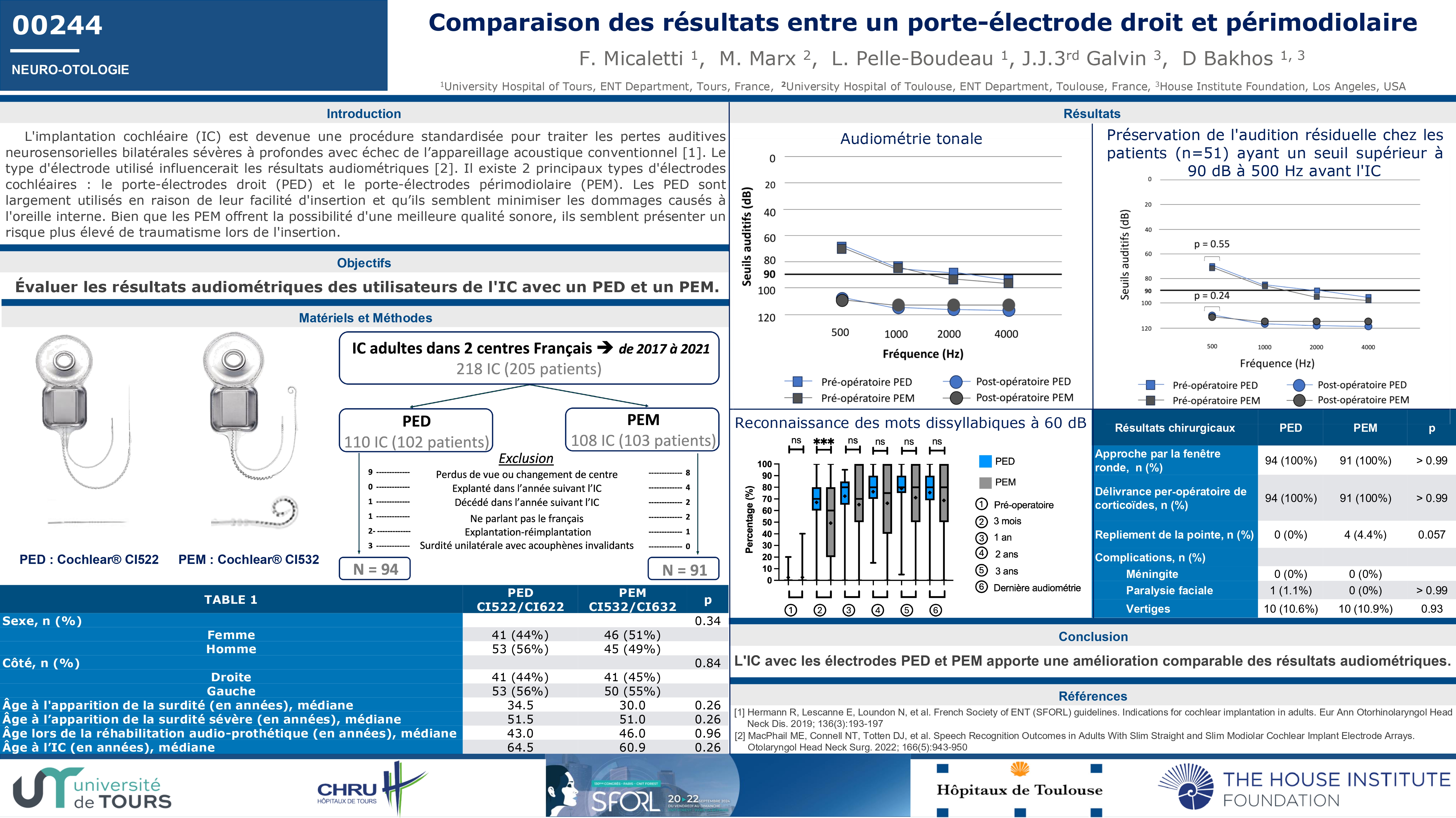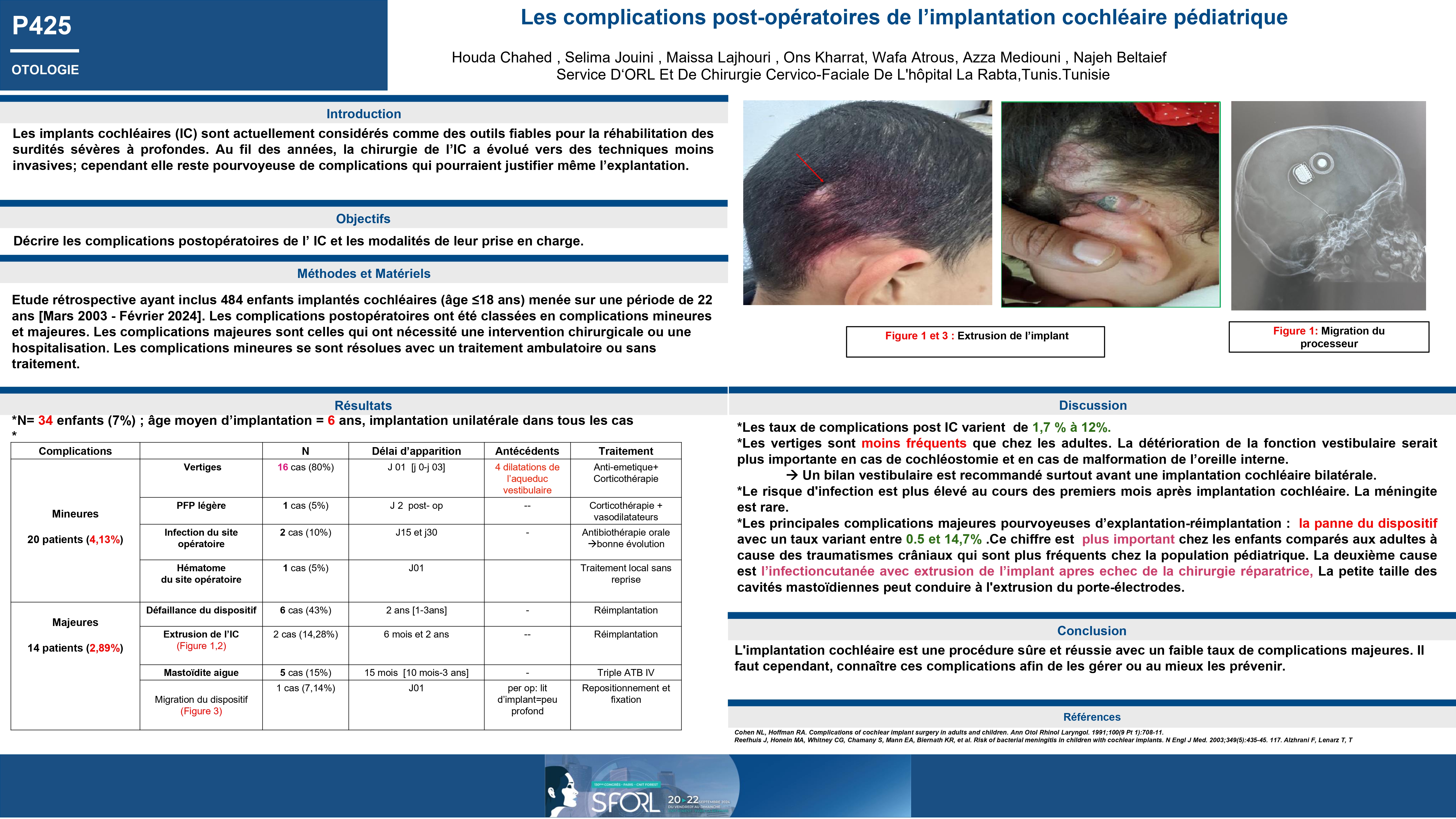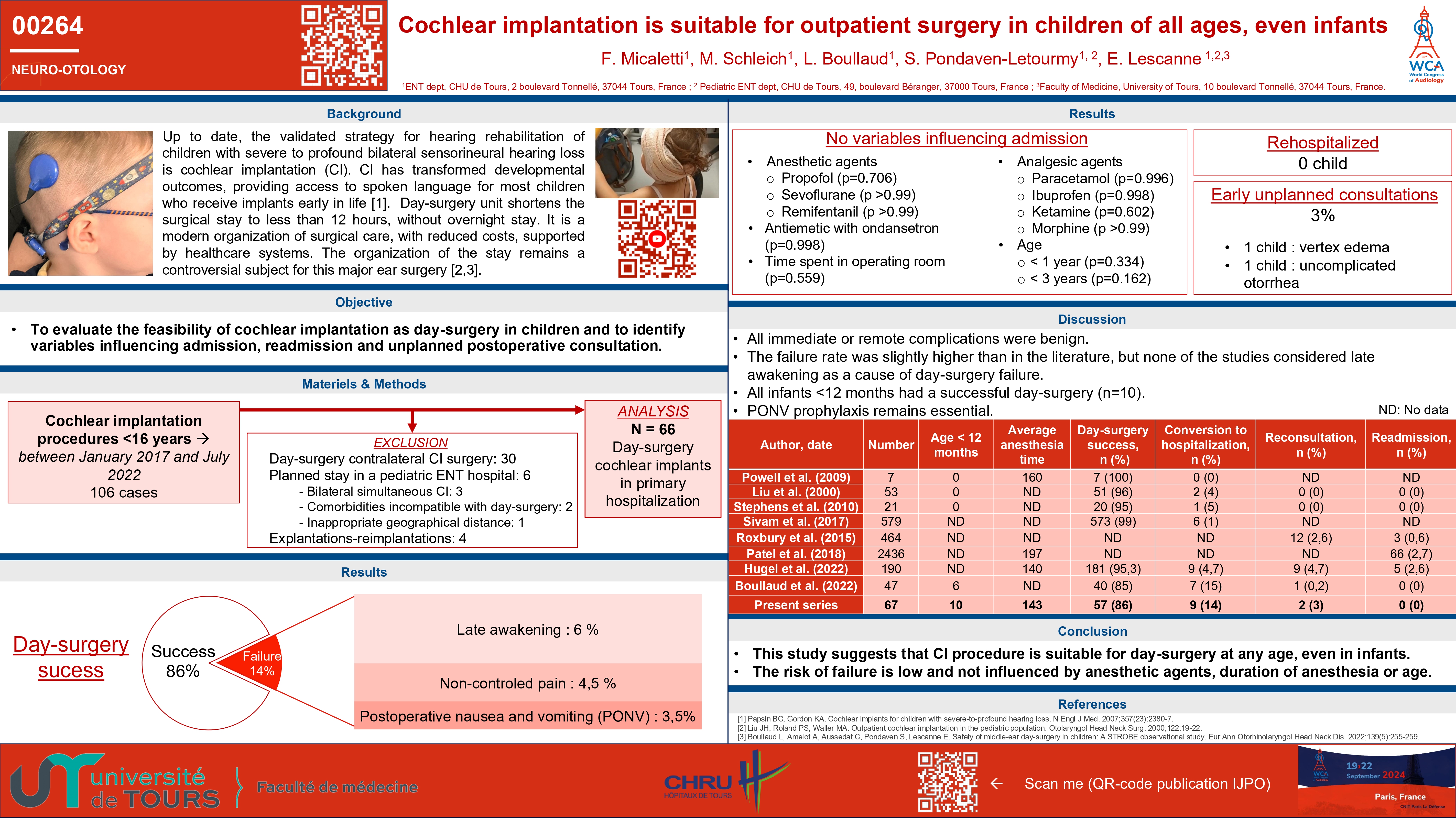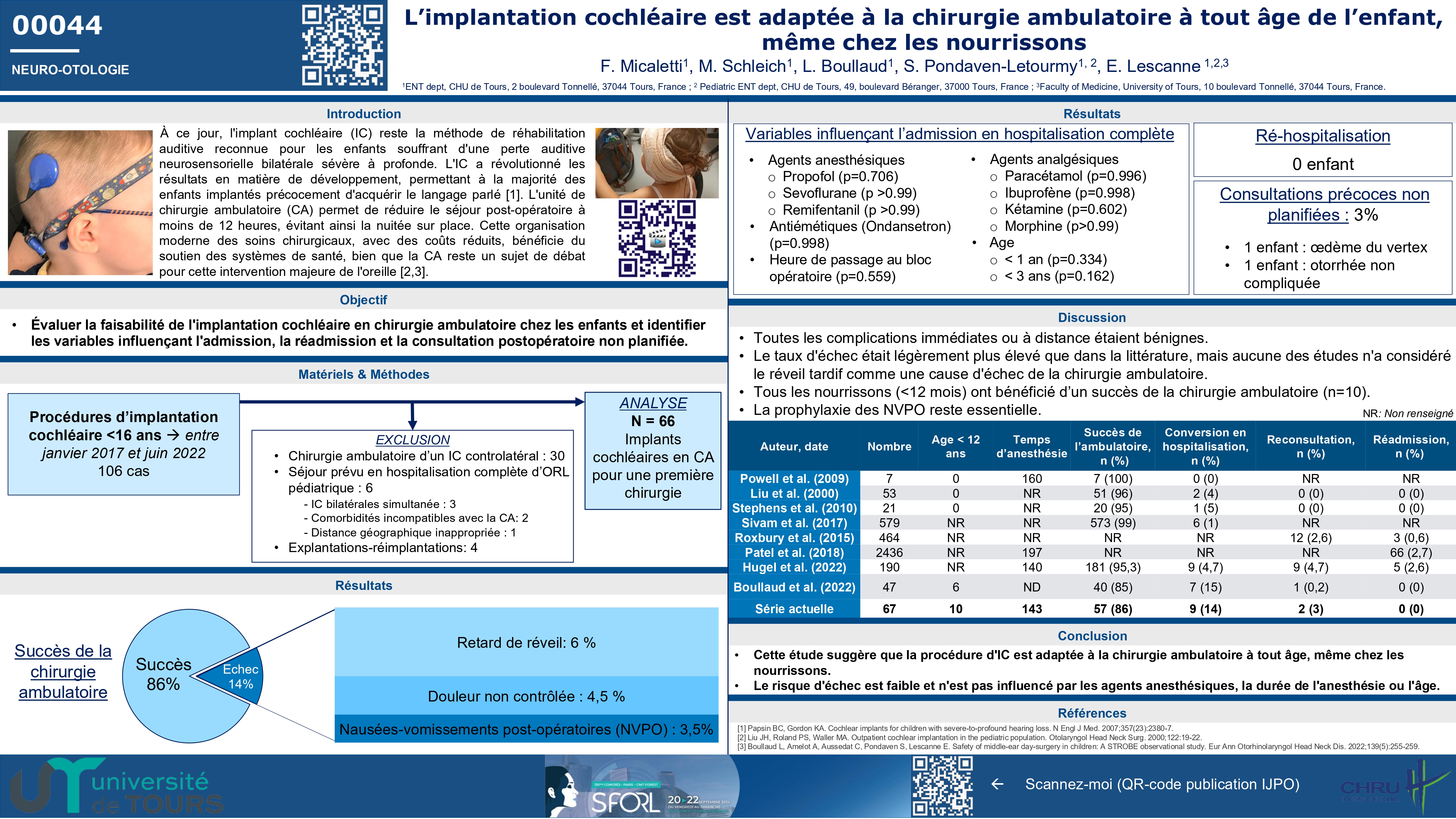 | PC047 – L’implantation cochléaire est adaptée à la chirurgie ambulatoire à tout âge de l’enfant, même chez les nourrissons | Otoneurologie et chirurgie de la base du crâne | otoneurologie-et-chirurgie-de-la-base-du-crane | |