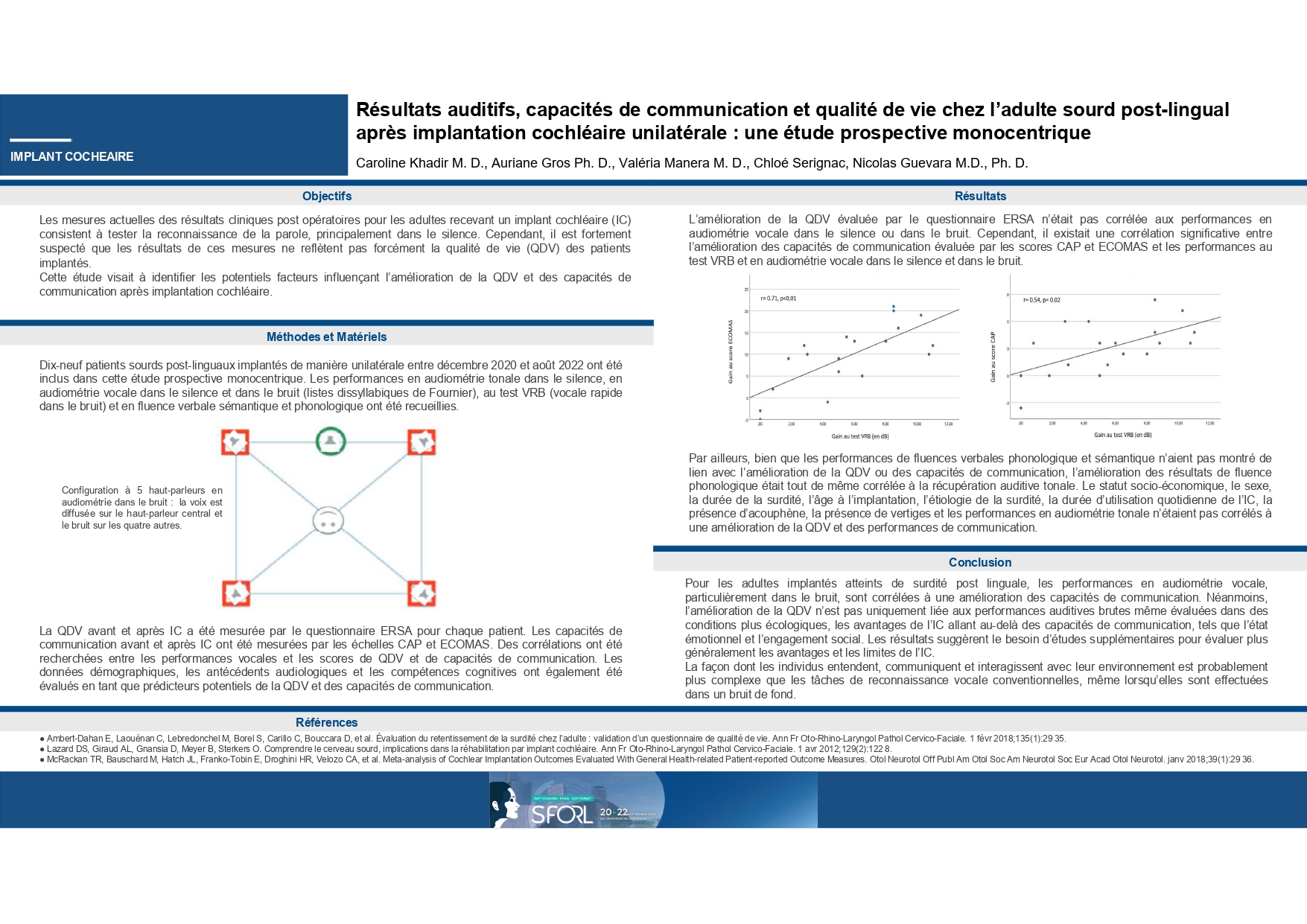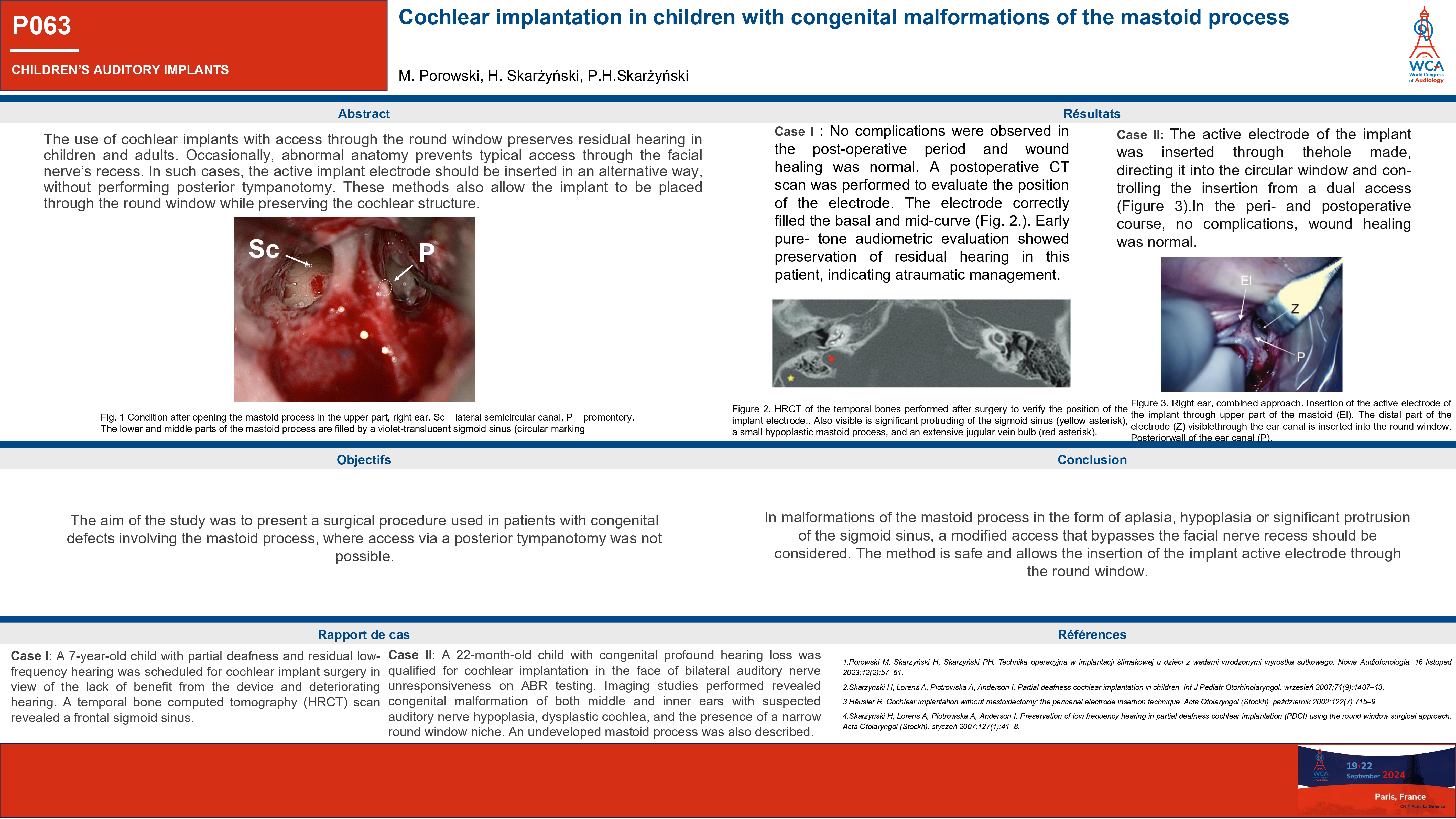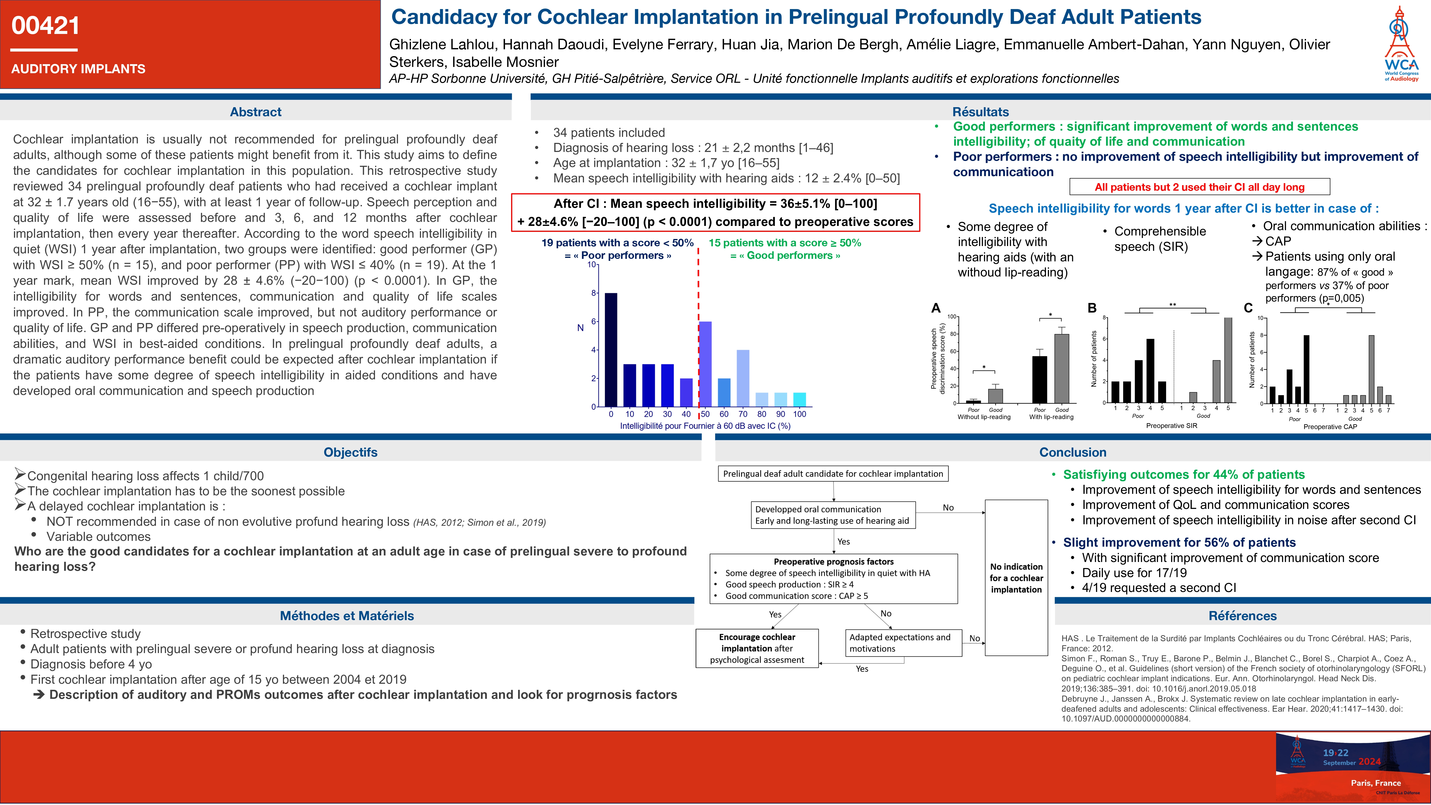 | PC047 – L’implantation cochléaire est adaptée à la chirurgie ambulatoire à tout âge de l’enfant, même chez les nourrissons | Otoneurologie et chirurgie de la base du crâne | otoneurologie-et-chirurgie-de-la-base-du-crane | |