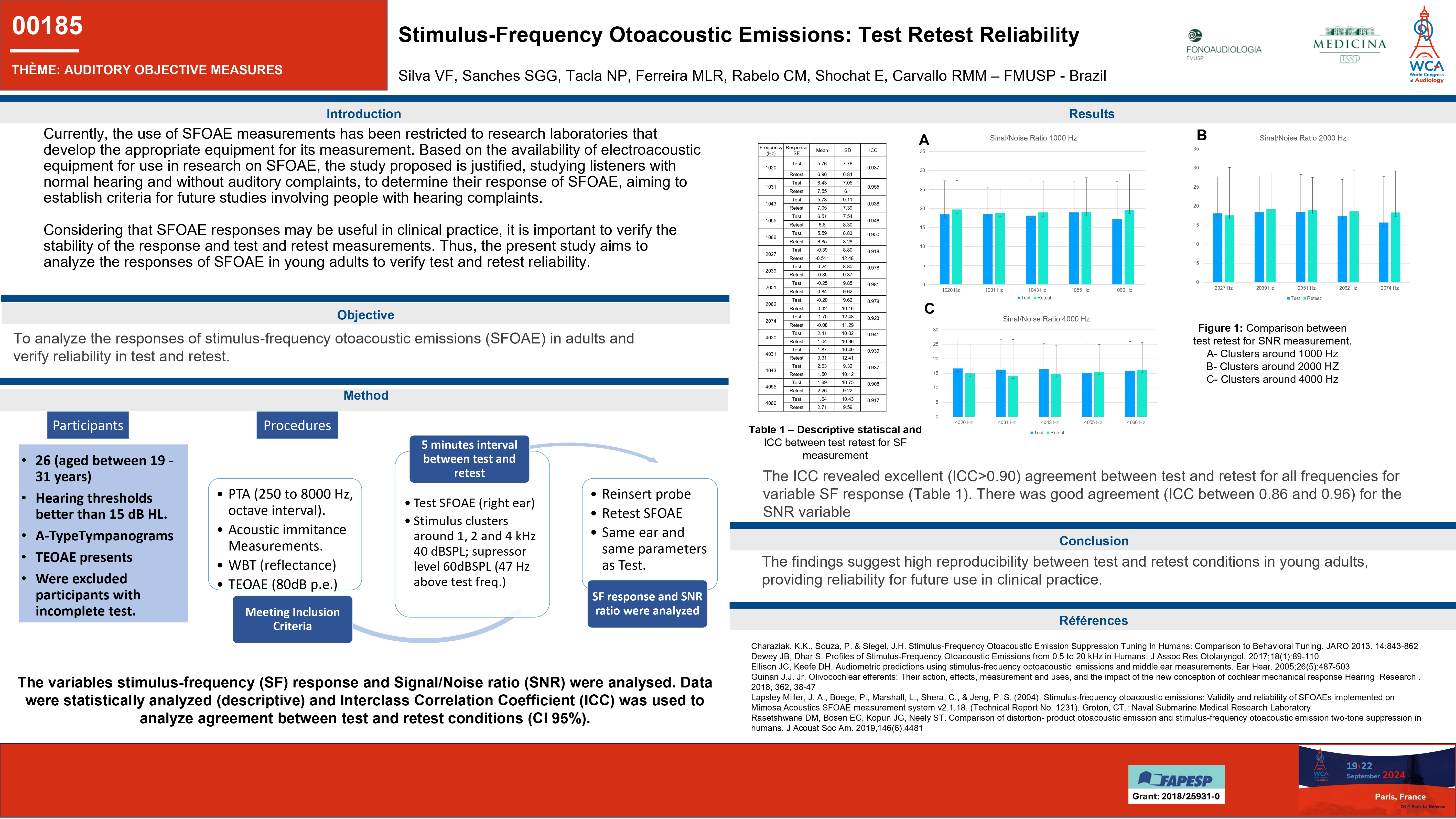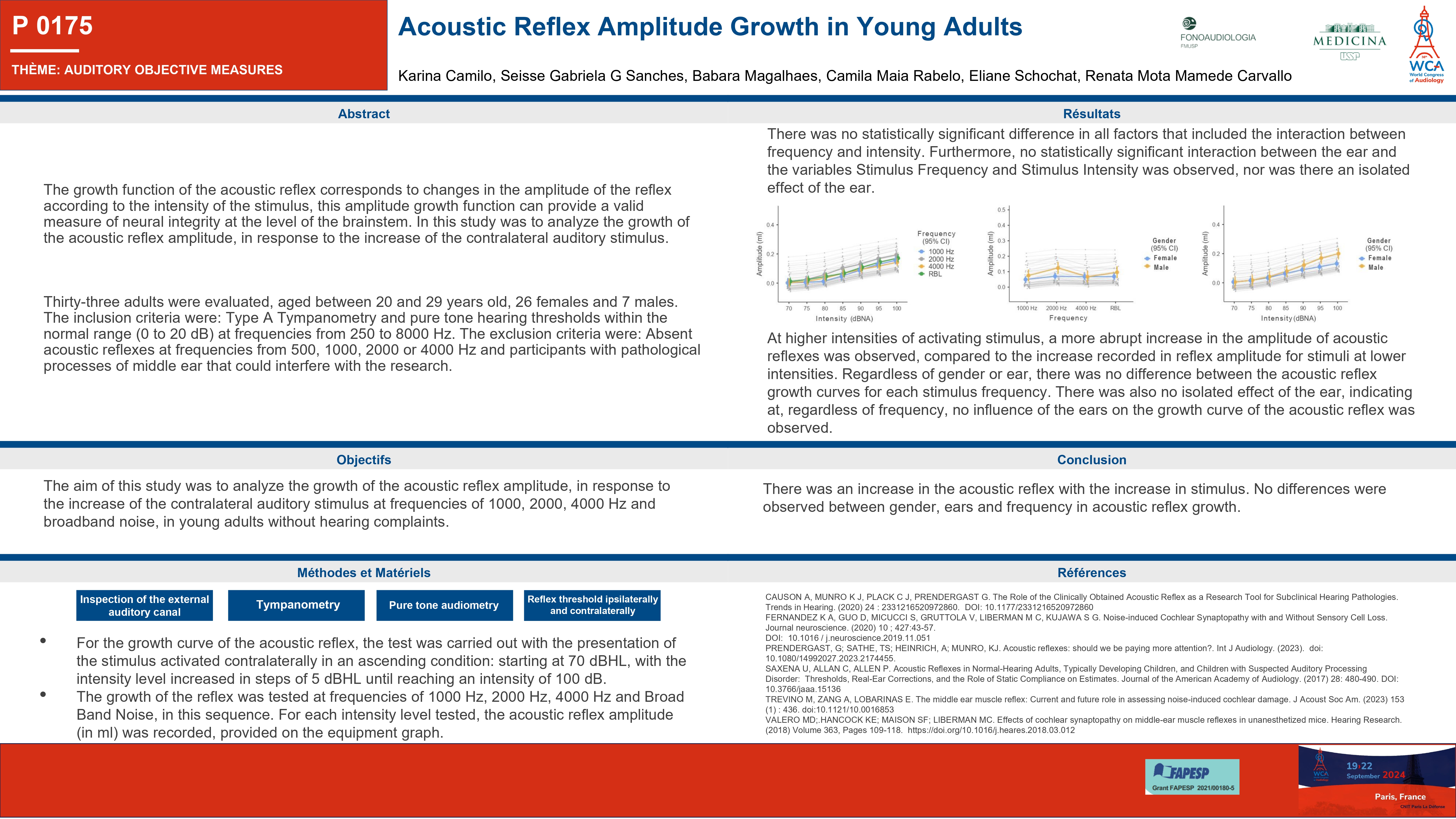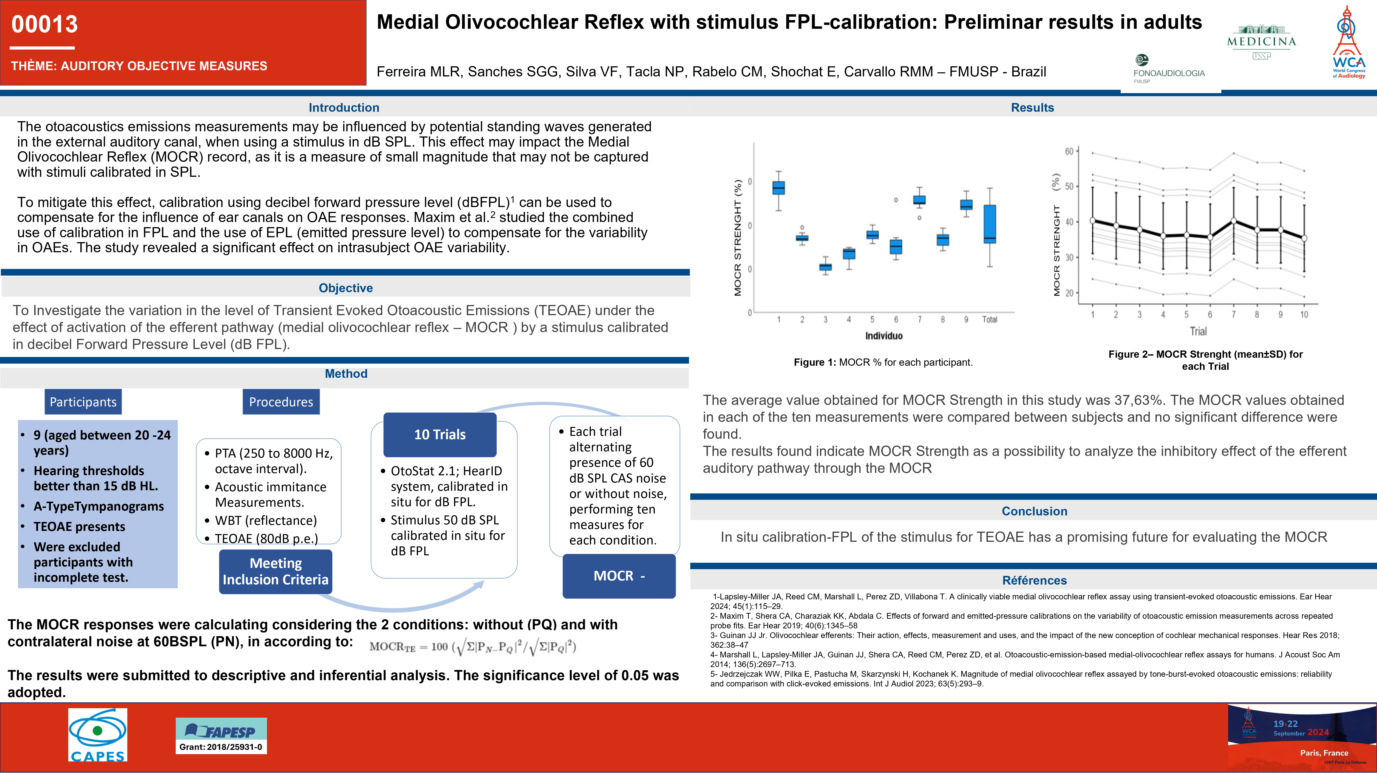 | P013 – Medial Olivocochlear Reflex with stimulus FPL-calibration: Preliminar results in adults | Auditory Objective Measures | auditory-objective-measures | |
