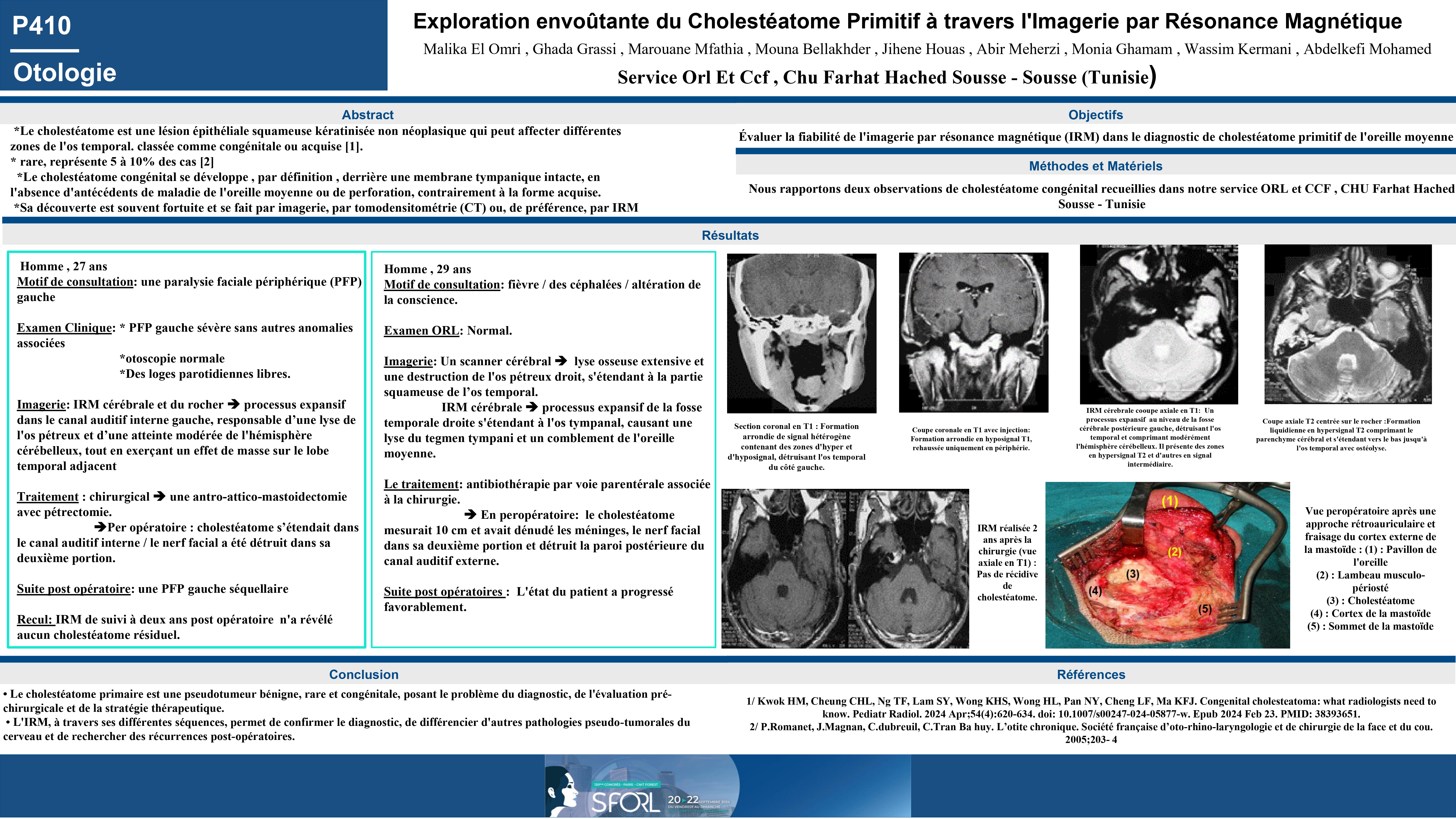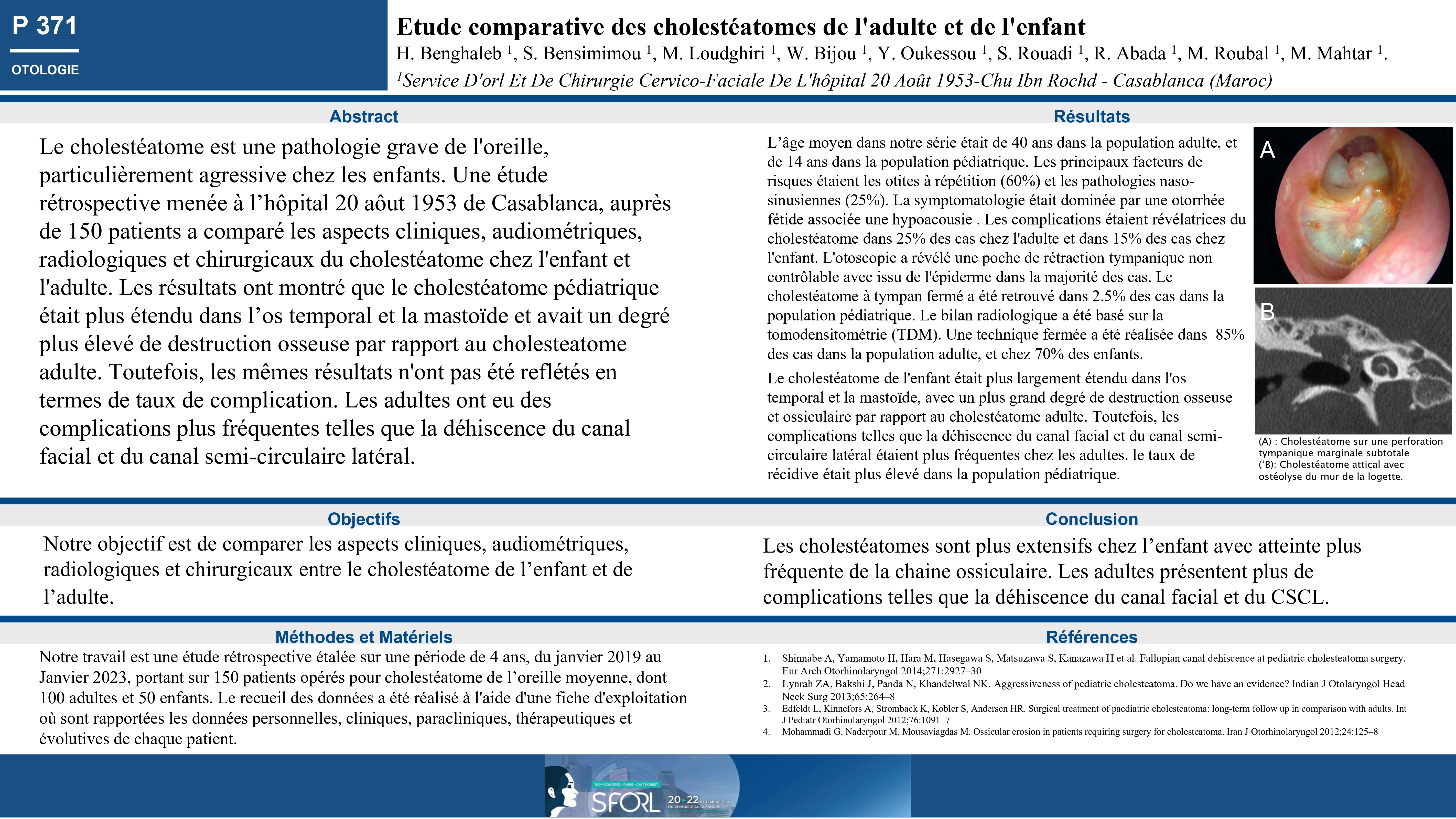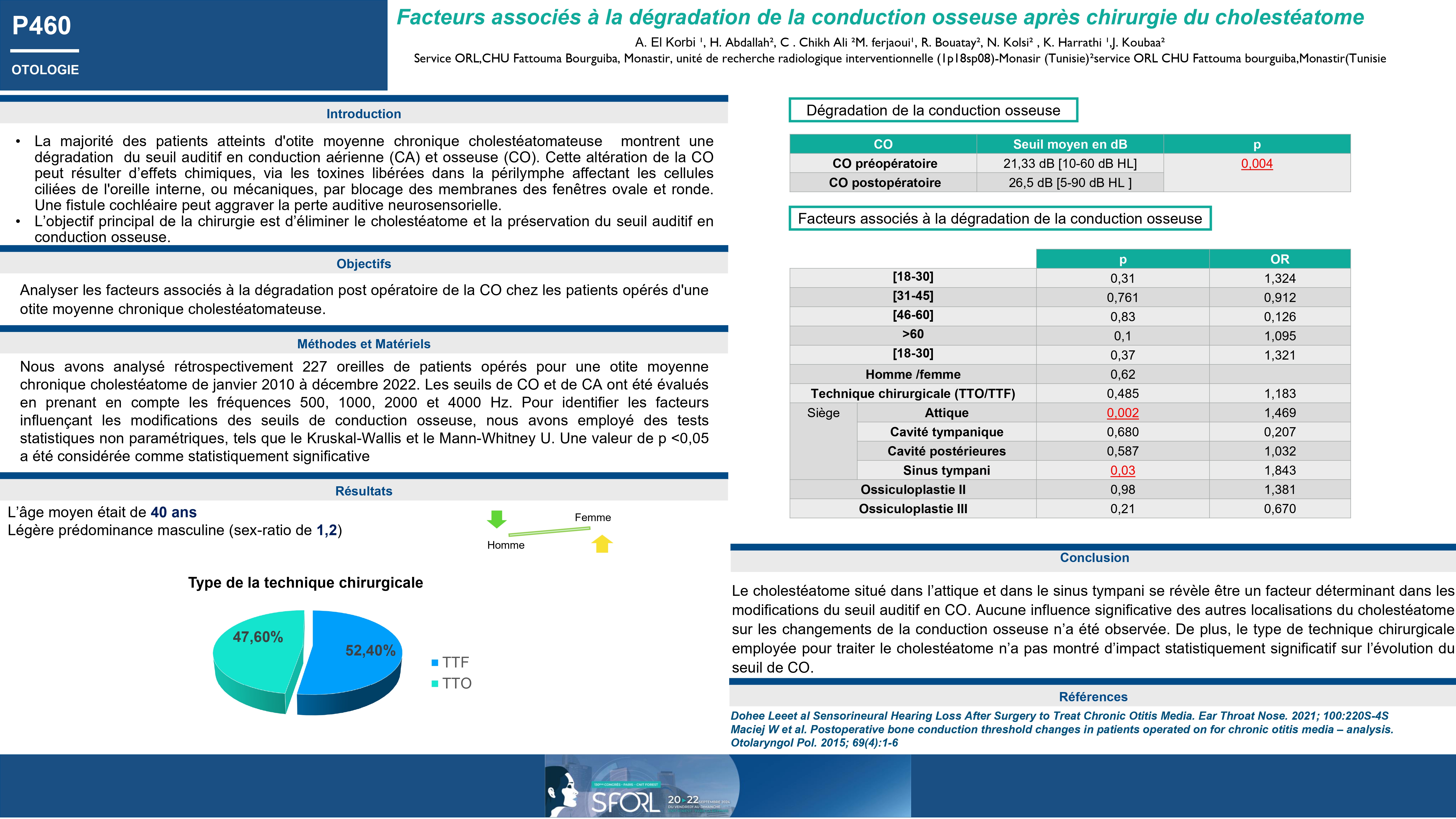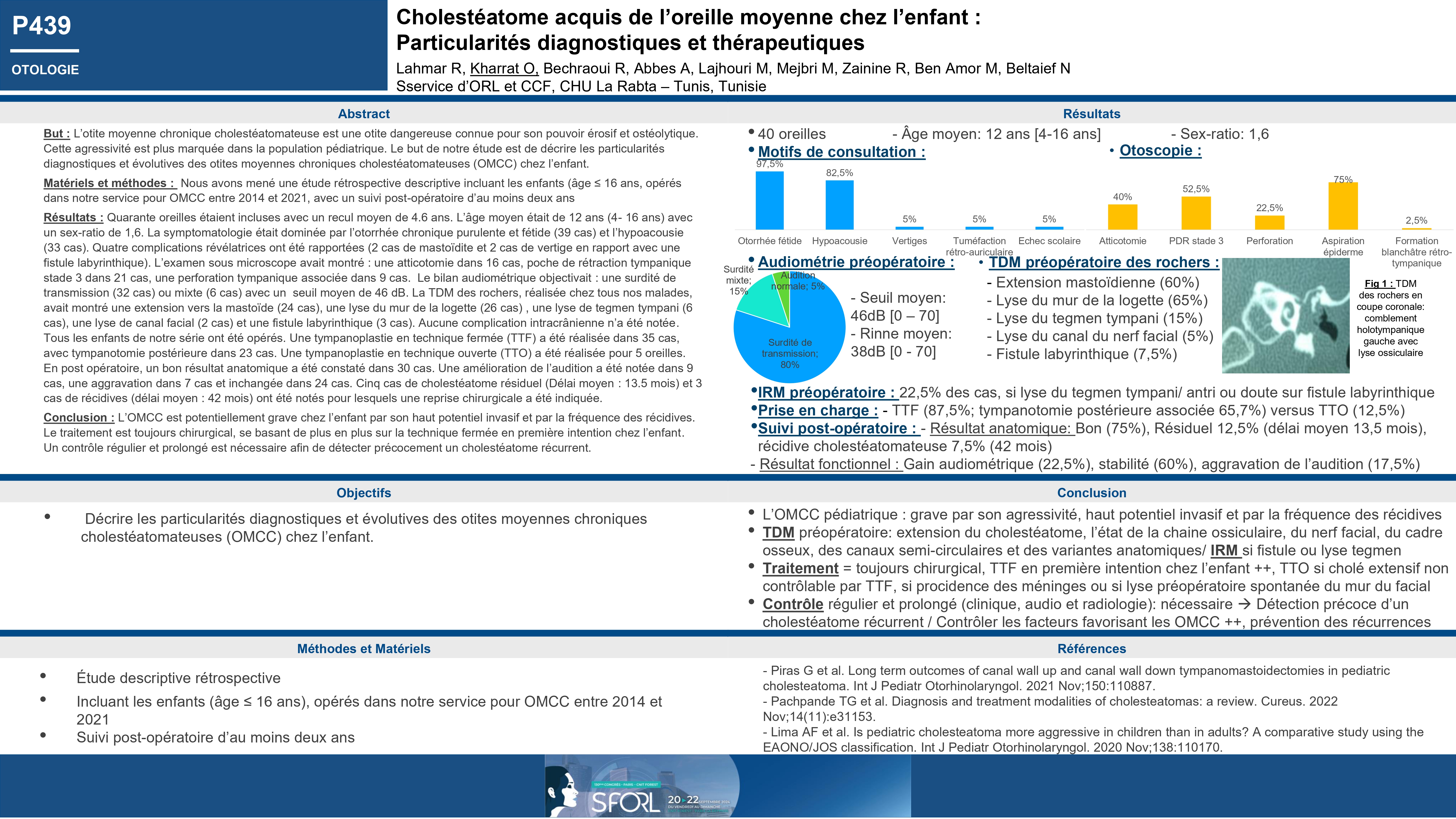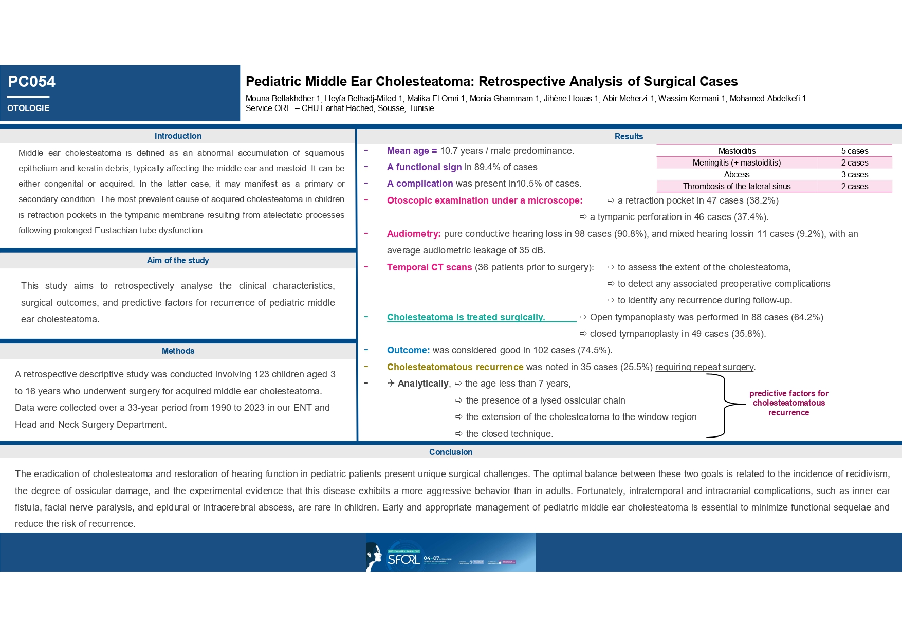 | PC054 – Pediatric Middle Ear Cholesteatoma: Retrospective Analysis of Surgical Cases | Otologie | otologie | |