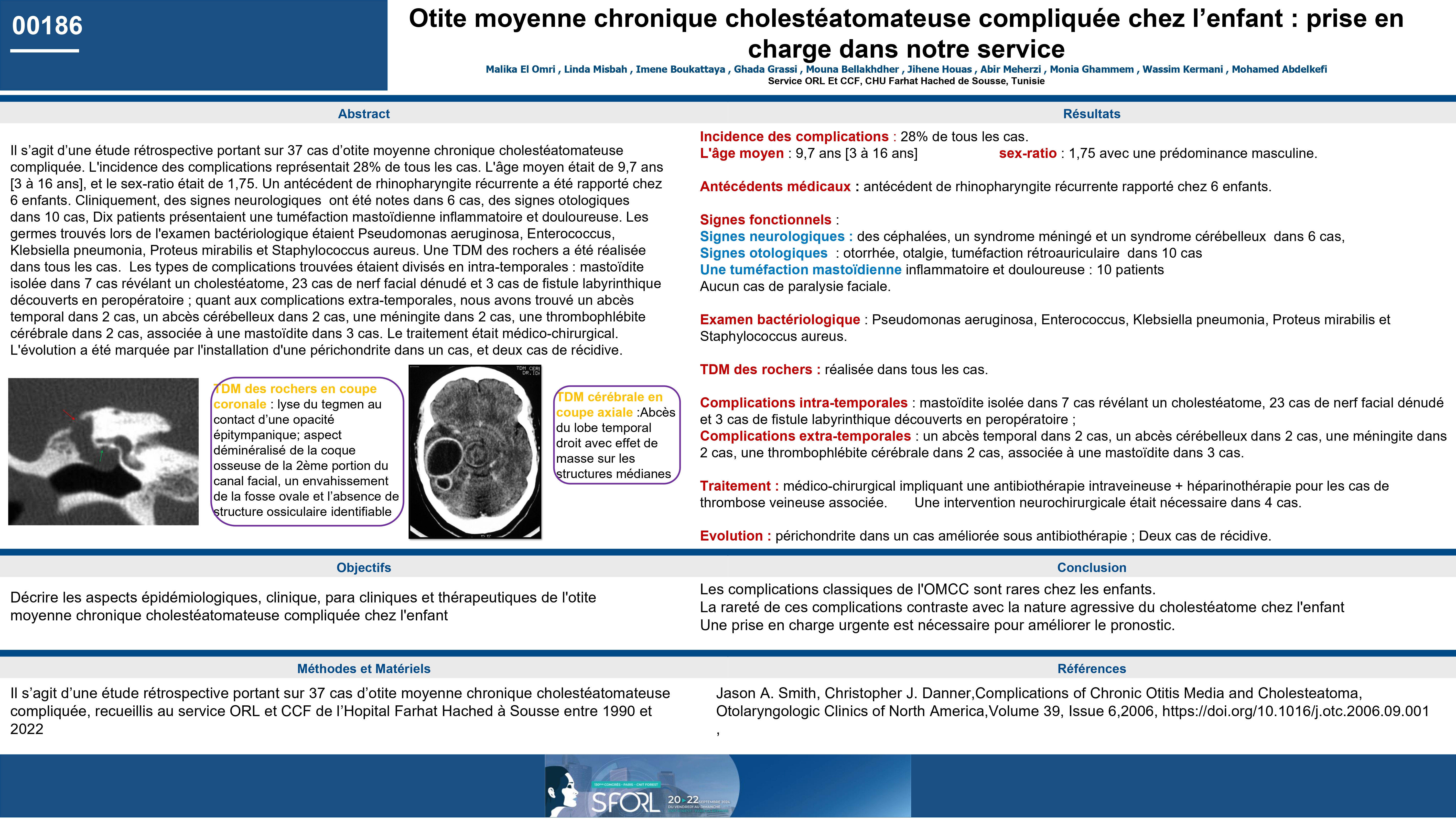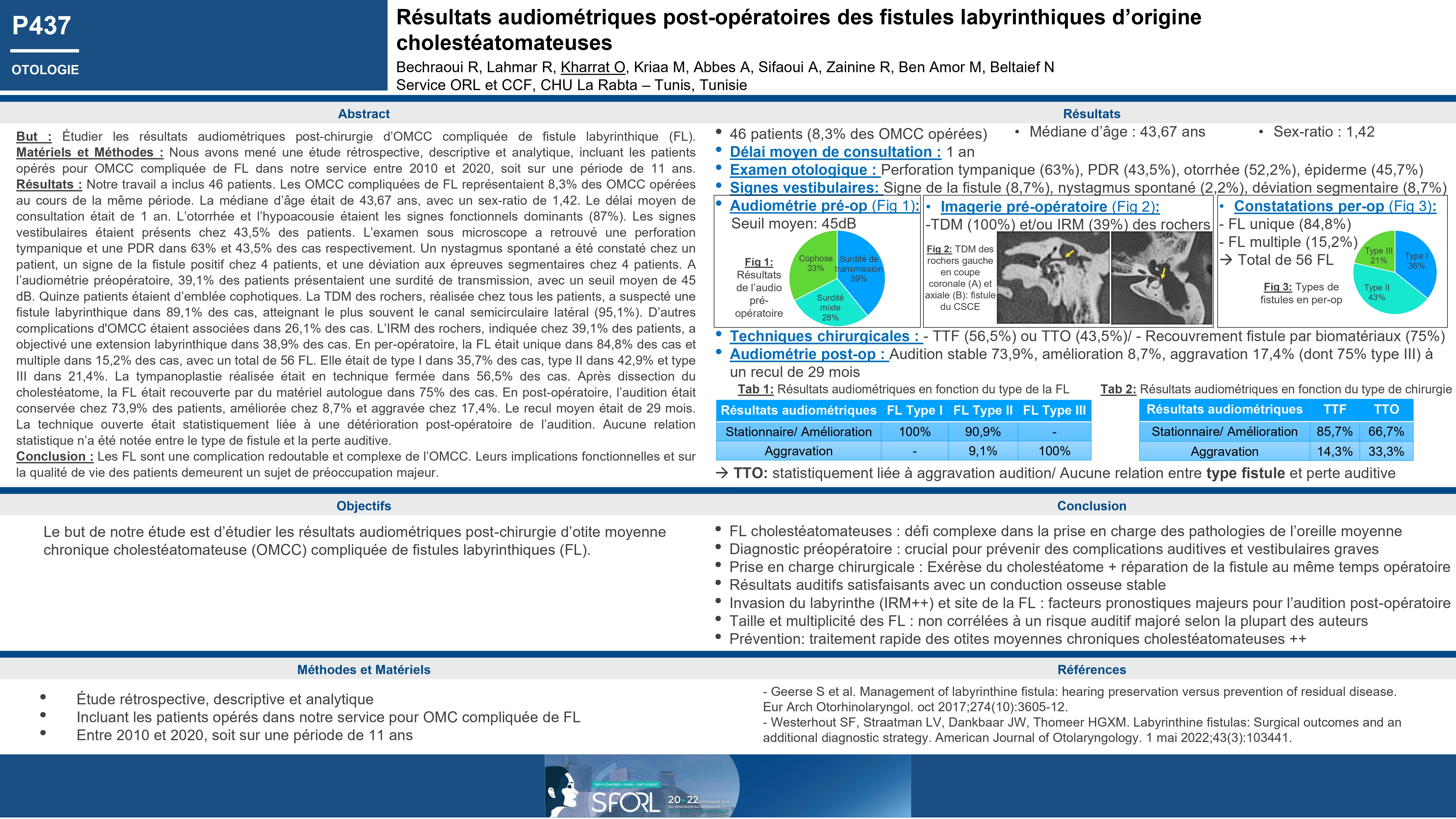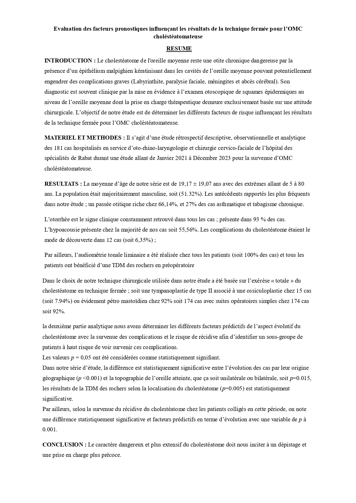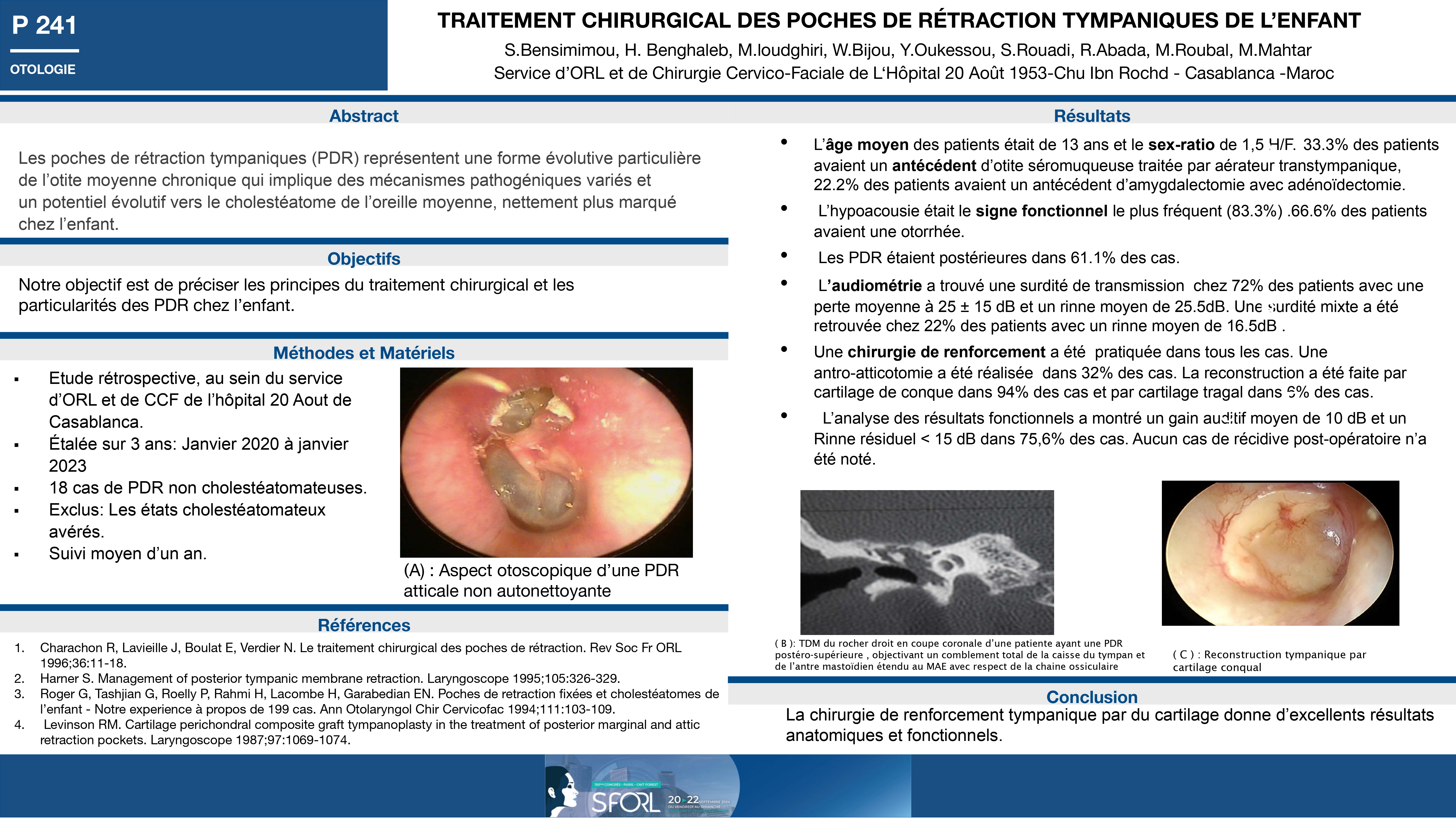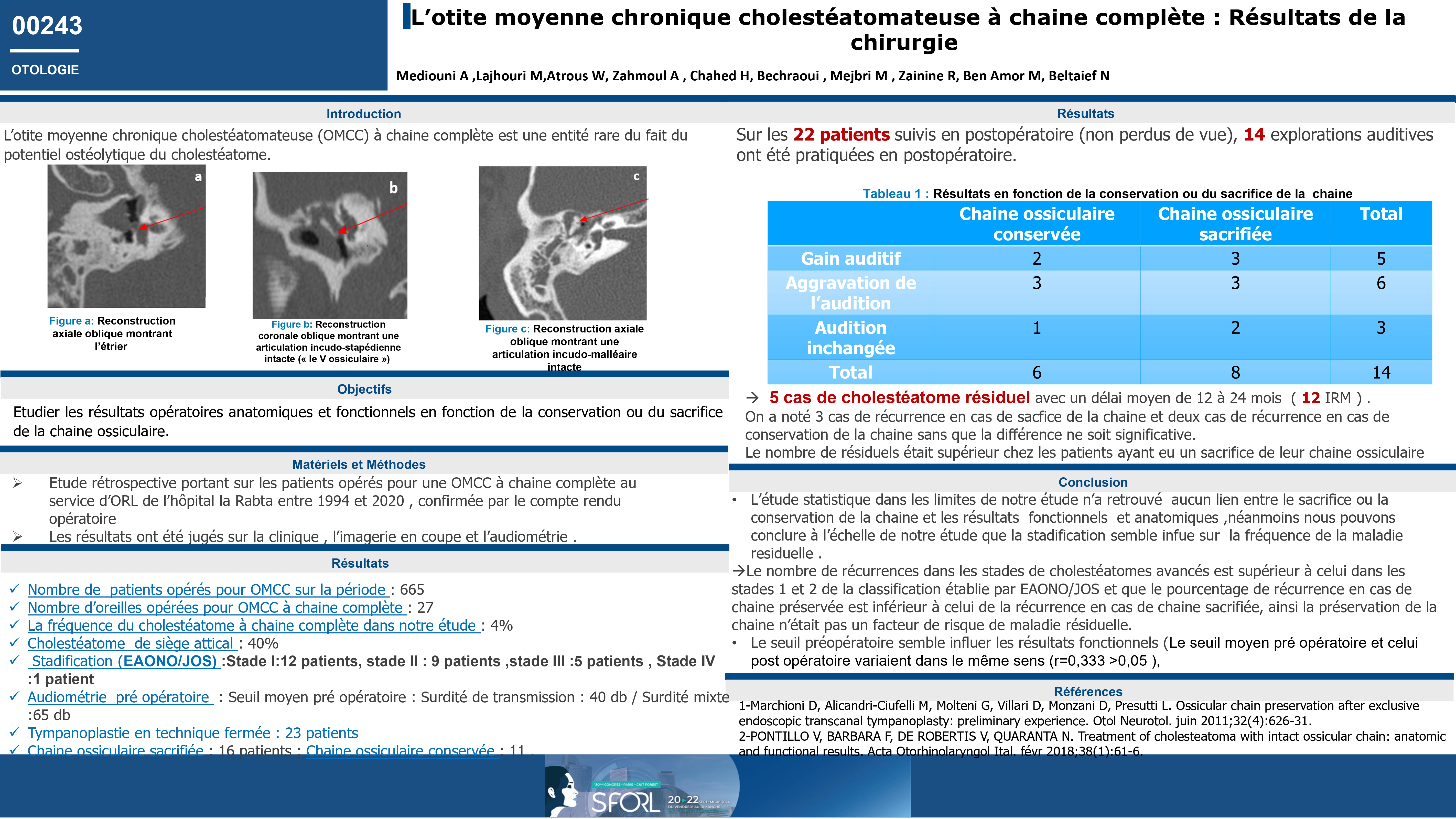 | PC054 – Pediatric Middle Ear Cholesteatoma: Retrospective Analysis of Surgical Cases | Otologie | otologie | |