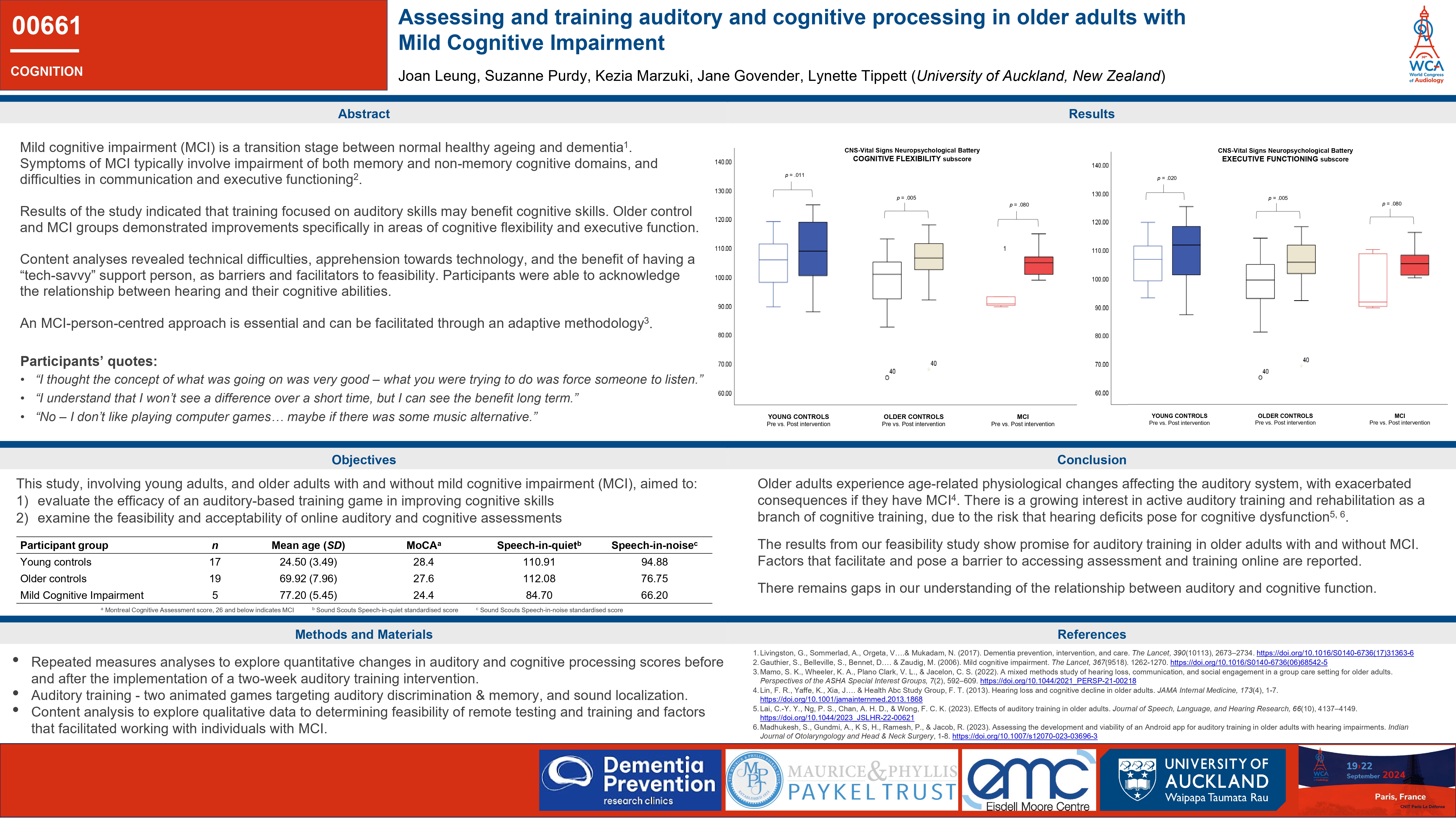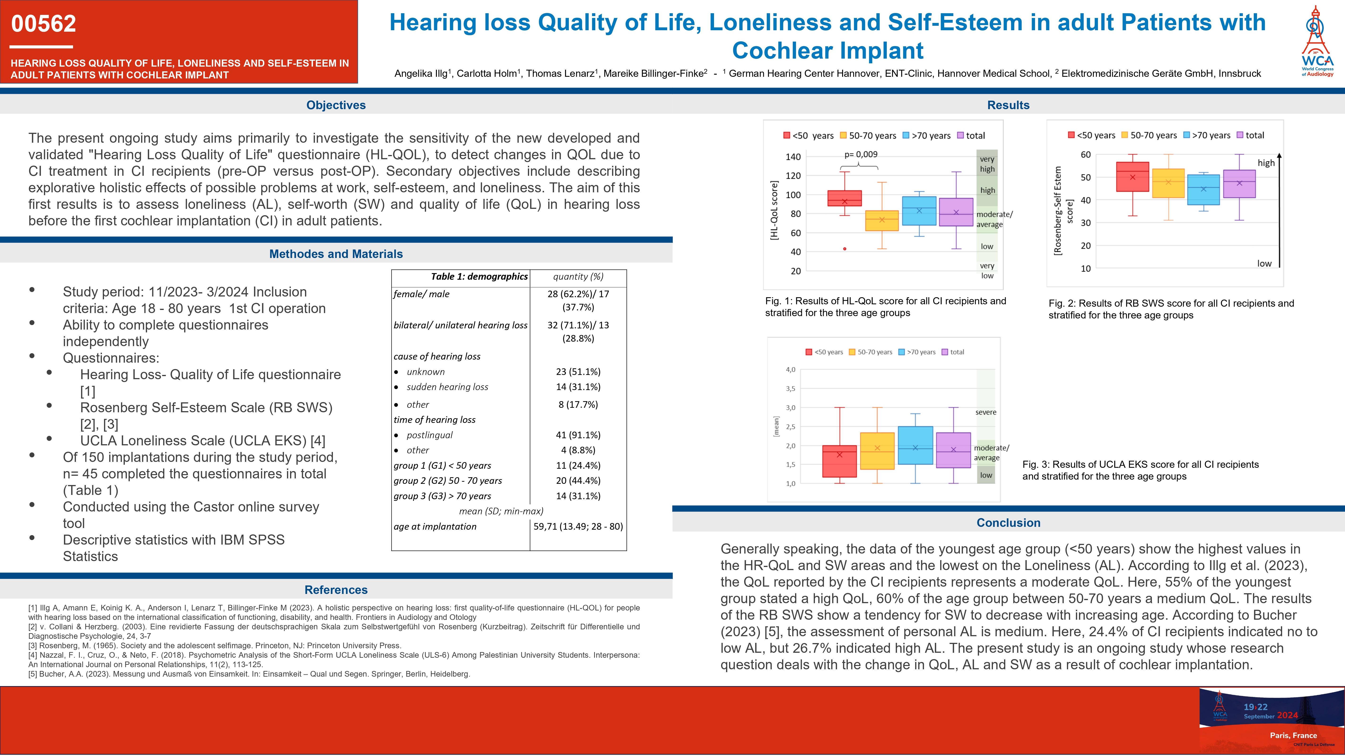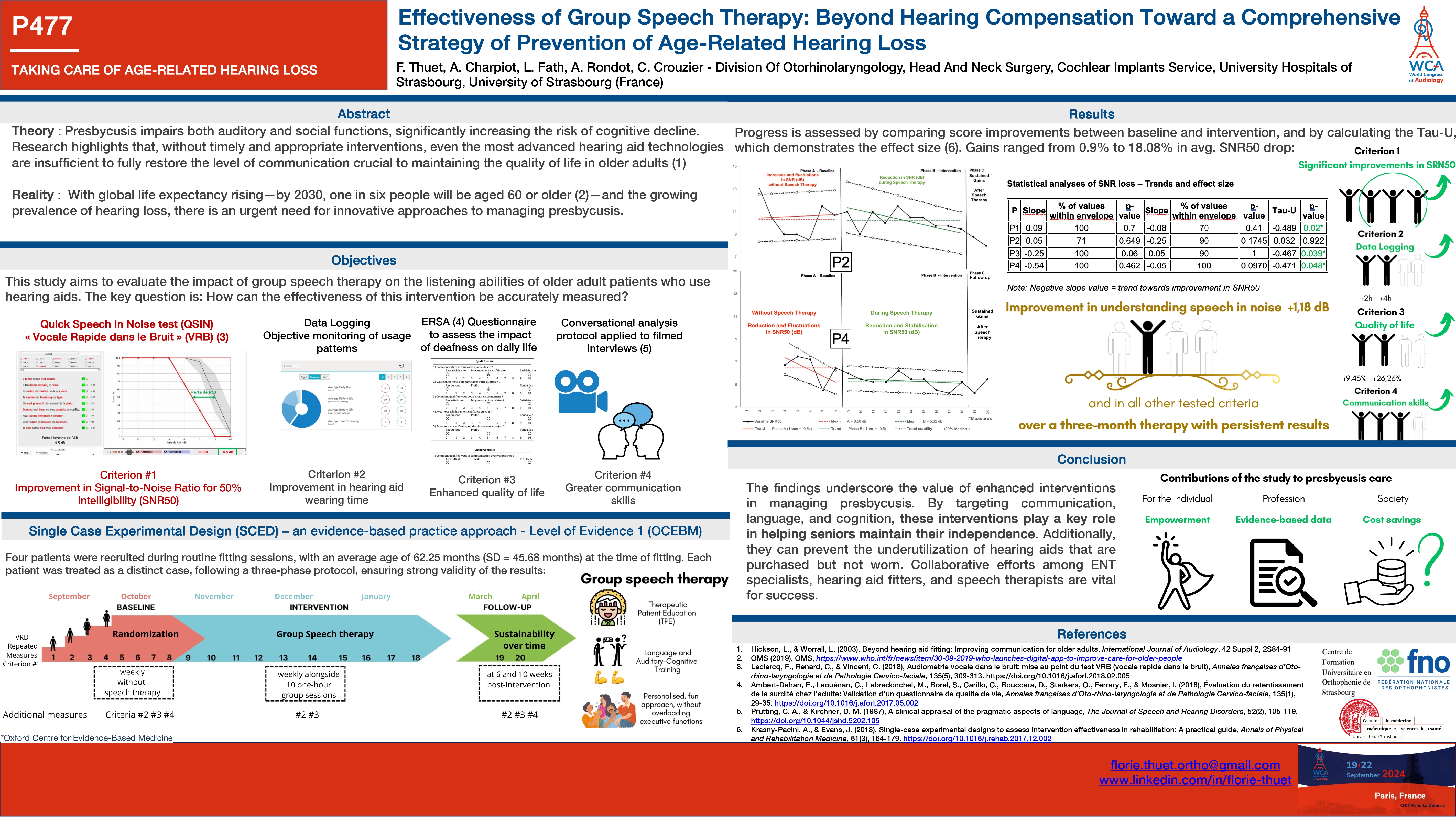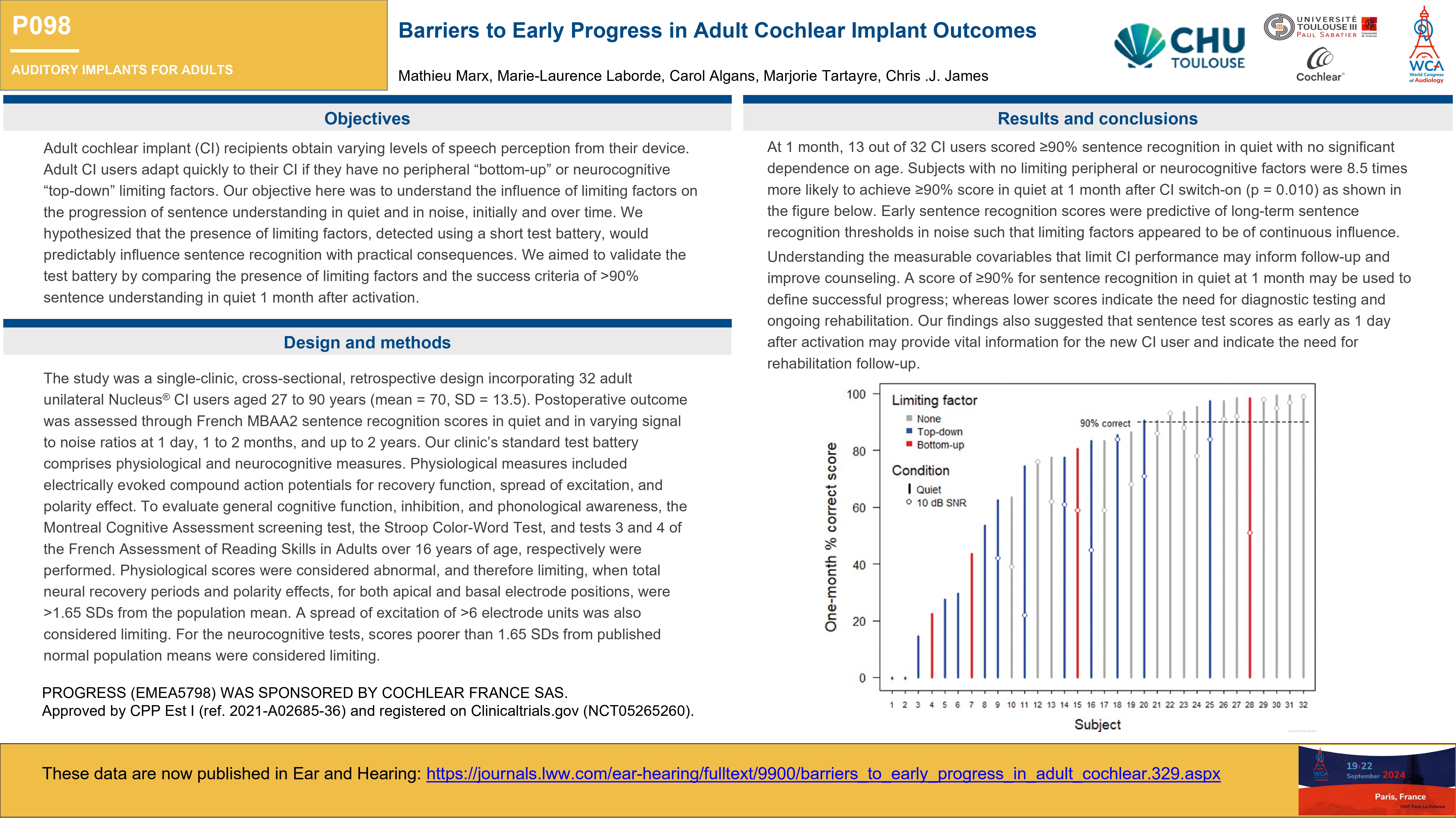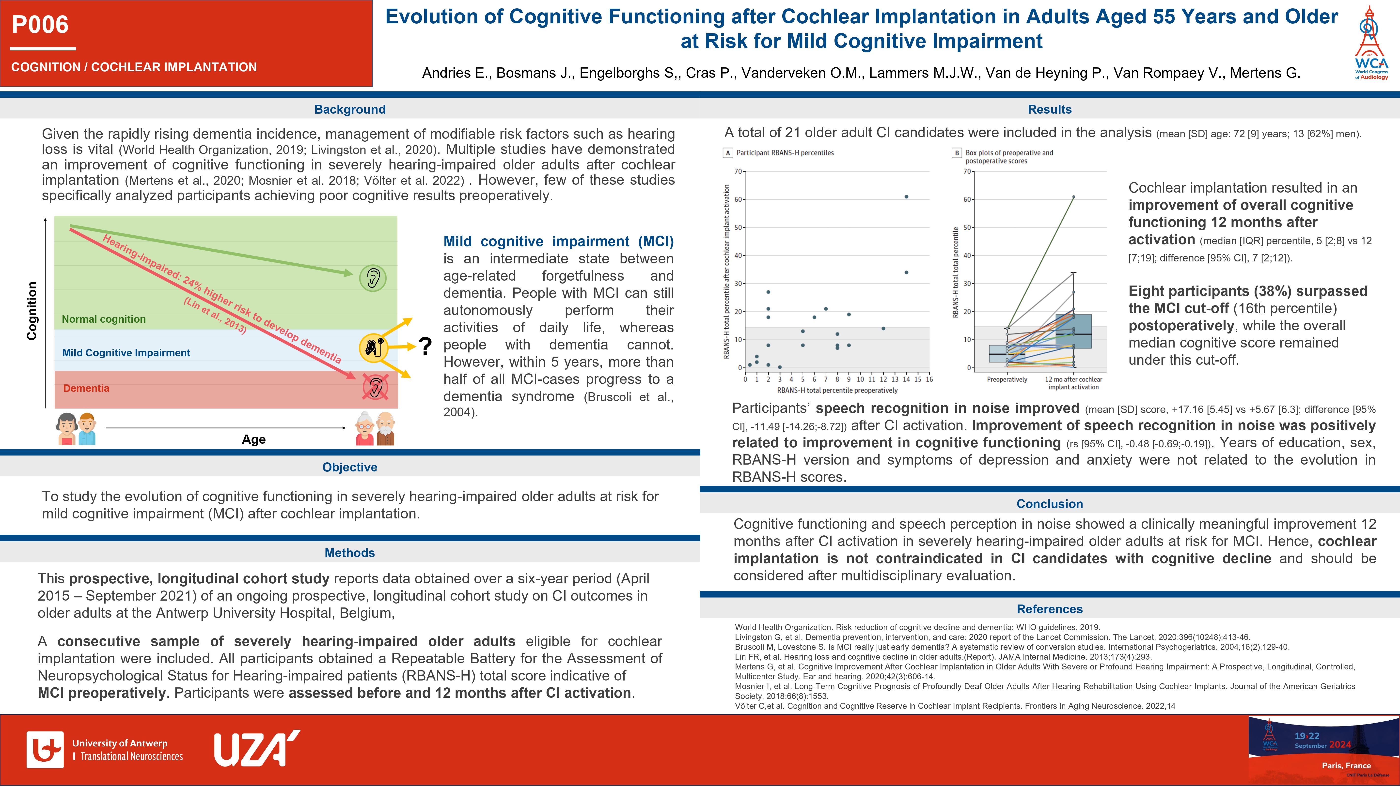 | P006 – Evolution of Cognitive Functioning after Cochlear Implantation in Adults Aged 55 Years and Older at Risk for Mild Cognitive Impairment: Preliminary Results | Auditory Implants | auditory-implants | |