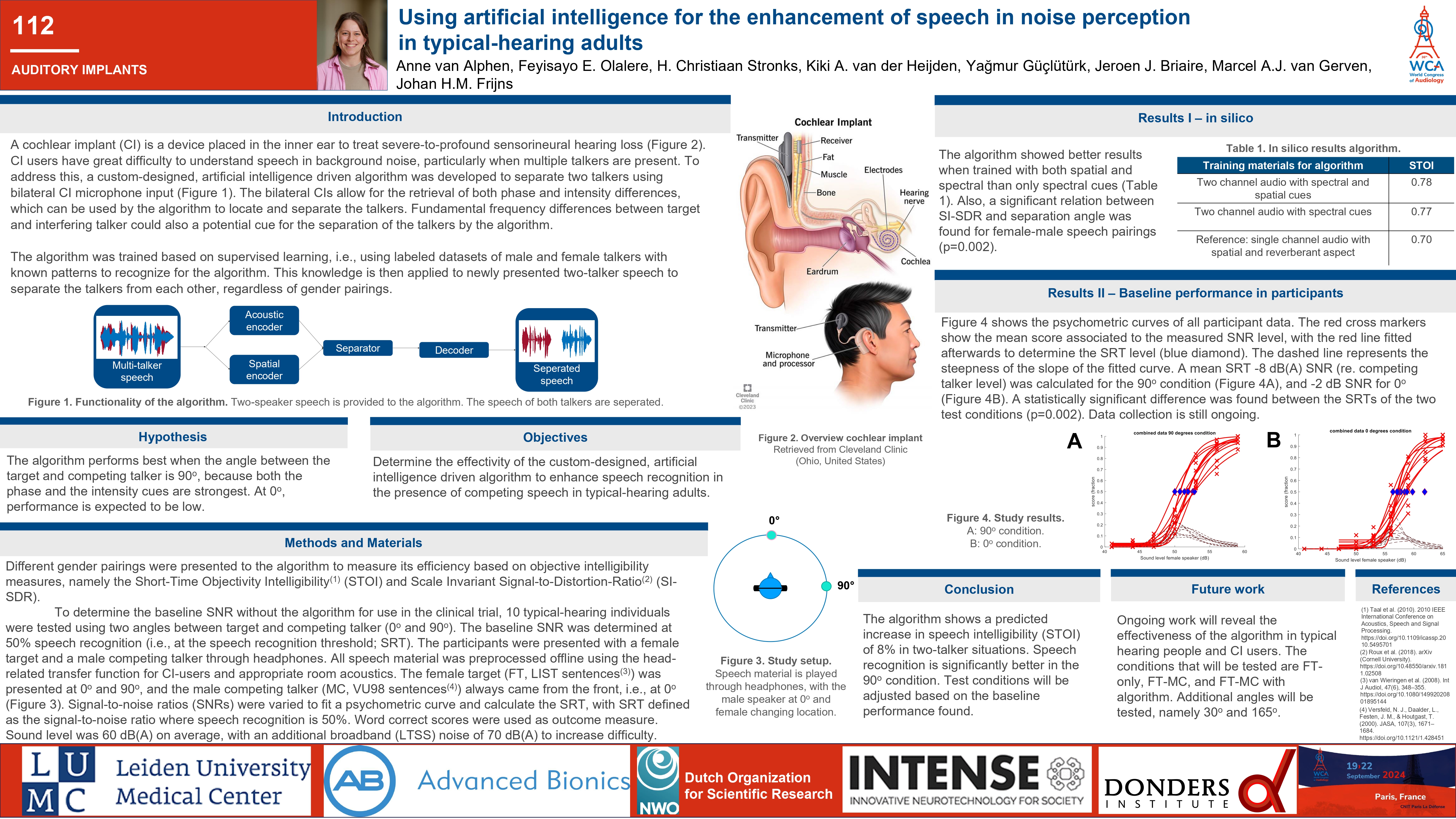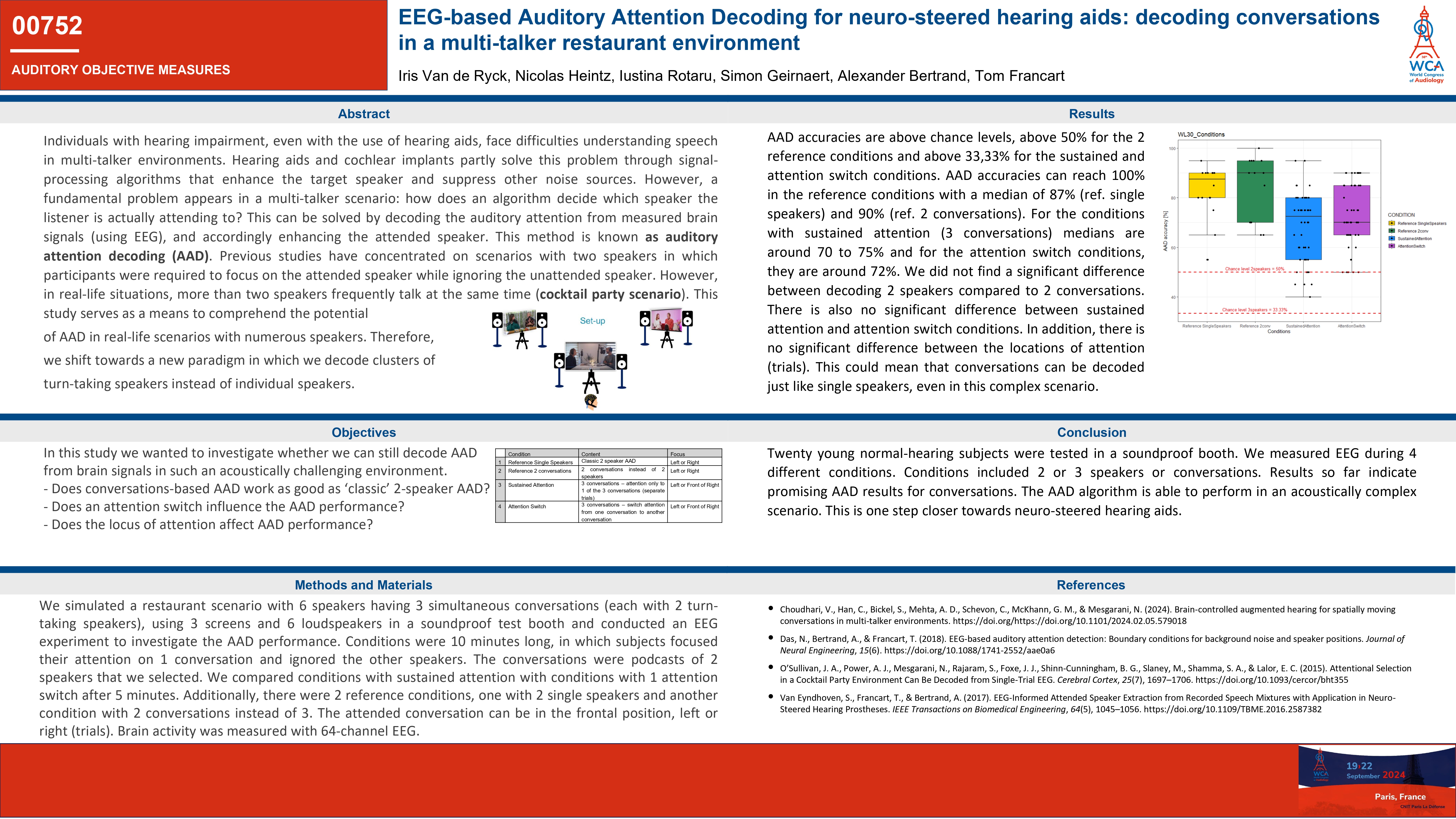| P012 – EEG-based Auditory Attention Decoding for neuro-steered hearing aids: decoding conversations in a multi-talker restaurant environment | Auditory Objective Measures | auditory-objective-measures | |