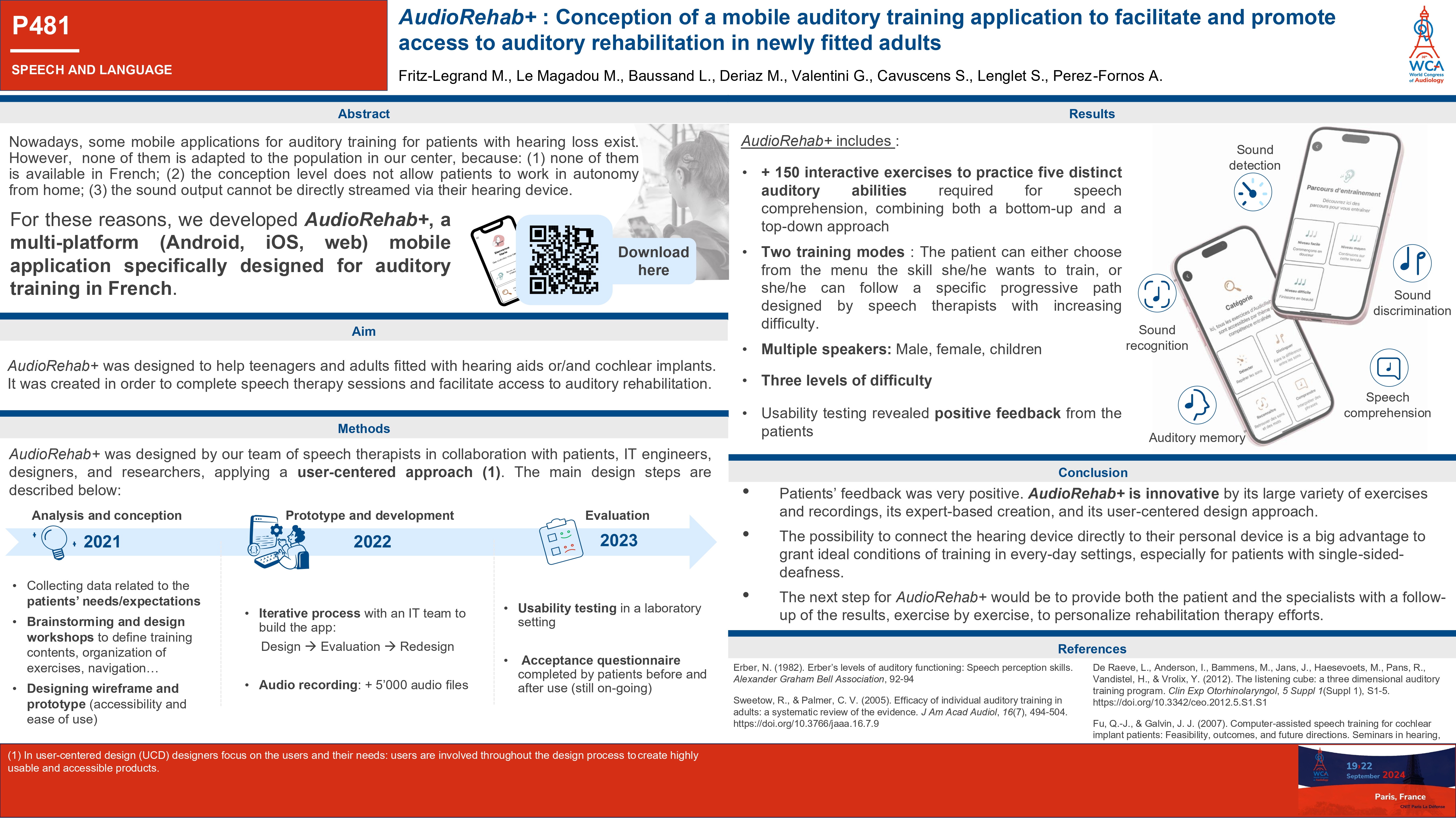| P481 – AudioRehab+ : Conception of a mobile auditory training application to facilitate and promote access to auditory rehabilitation in newly fitted adults | Speech and Language | speech-and-language | |