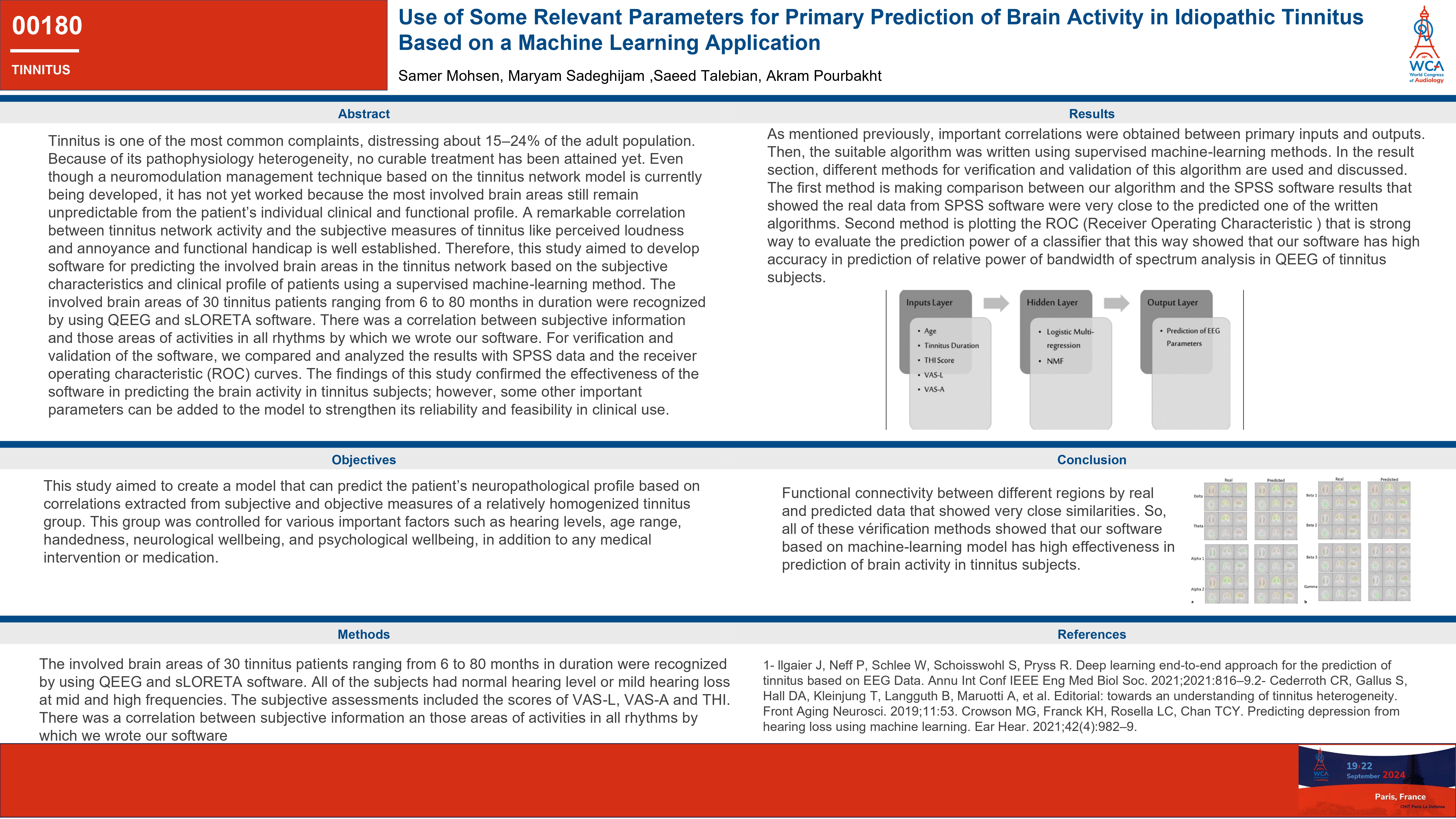 | P512 – Use of Some Relevant Parameters for Primary Prediction of Brain Activity in Idiopathic Tinnitus Based on a Machine Learning Applicati | Tinnitus and Hypercusis | tinnitus-and-hypercusis | |