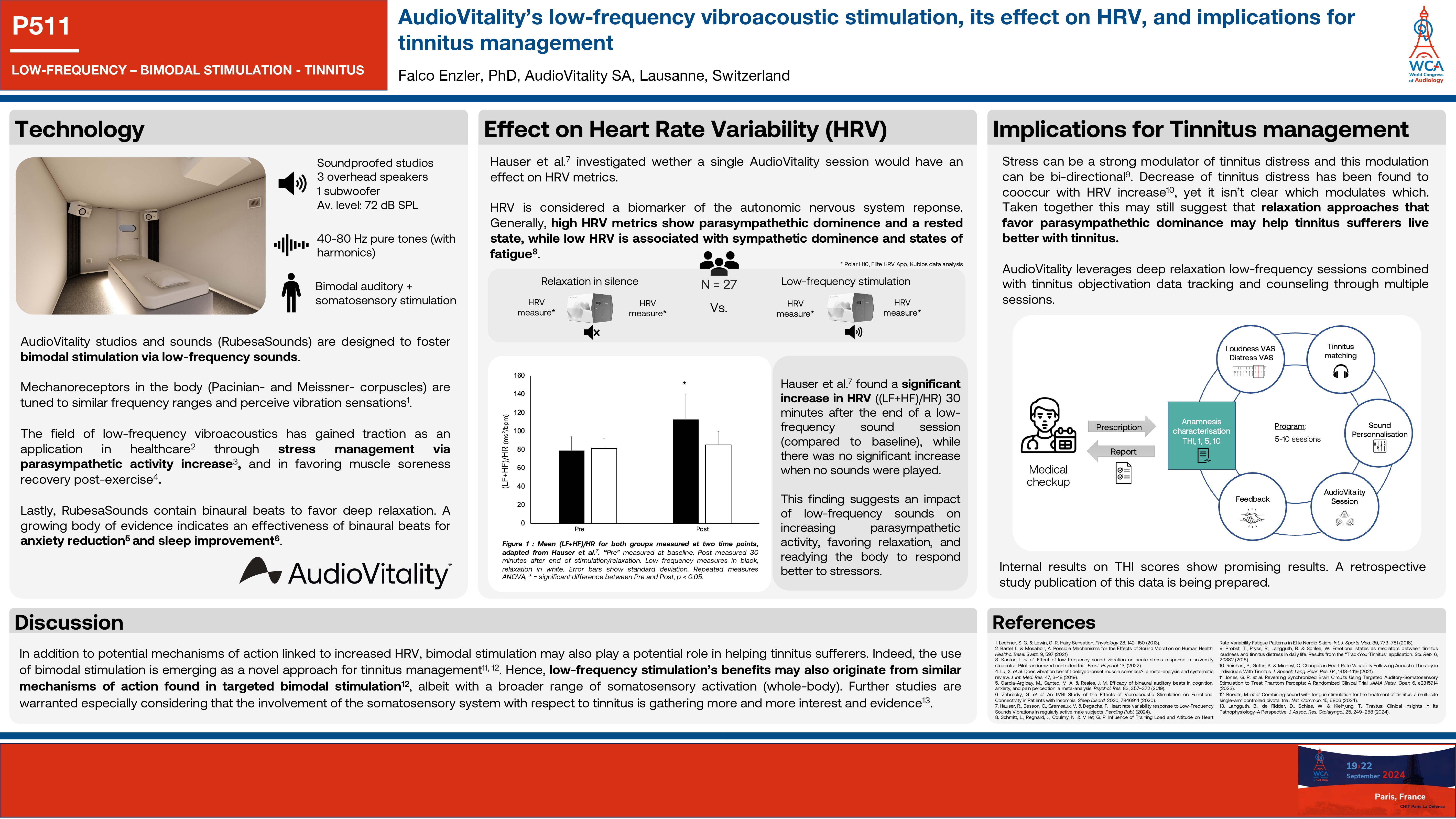 | P511 – Preliminary results of AudioVitality’s low frequency vibratory sound stimulation for tinnitus | Tinnitus and Hypercusis | tinnitus-and-hypercusis | |