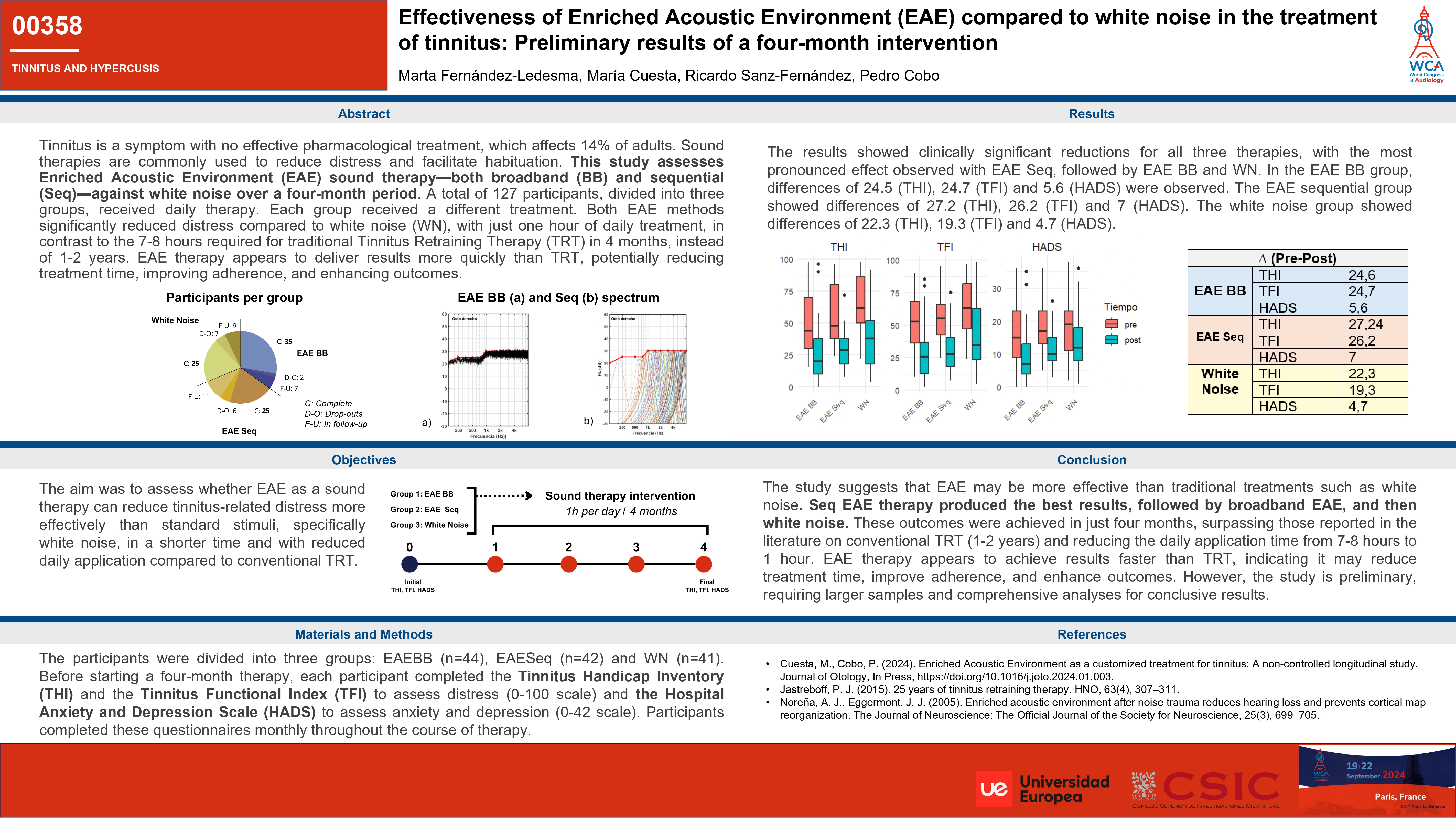| P507 – Effectiveness of Enriched Acoustic Environment (EAE) compared to white noise in the treatment of tinnitus: Preliminary results of a four-month intervention | Tinnitus and Hypercusis | tinnitus-and-hypercusis | |