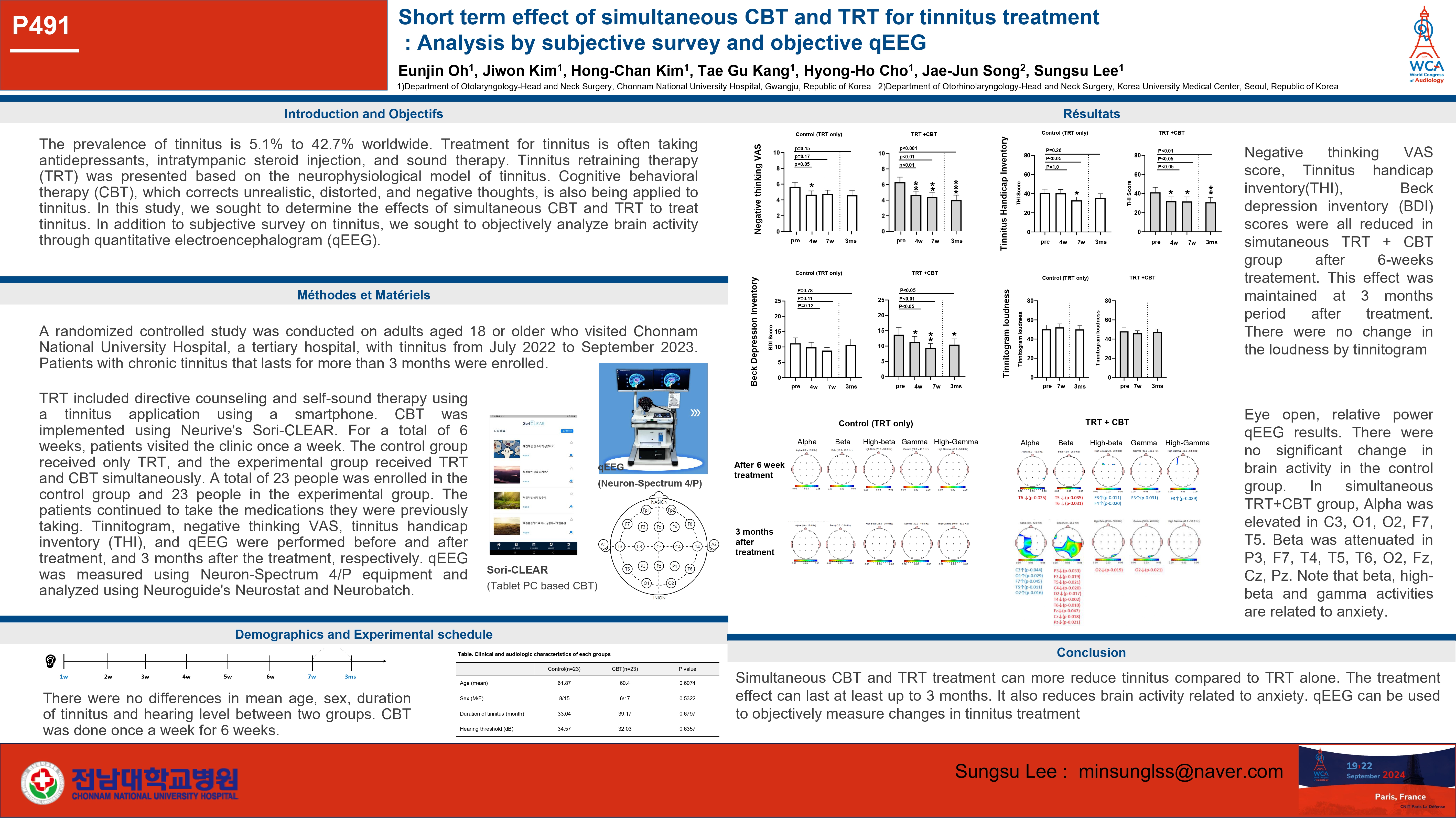 | P491 – Short term effect of simultaneous CBT and TRT for Tinnitus treatment: Analysis by subjective survey and objective quantitative electroencephalogram (qEEG) | Tinnitus and Hypercusis | tinnitus-and-hypercusis | |