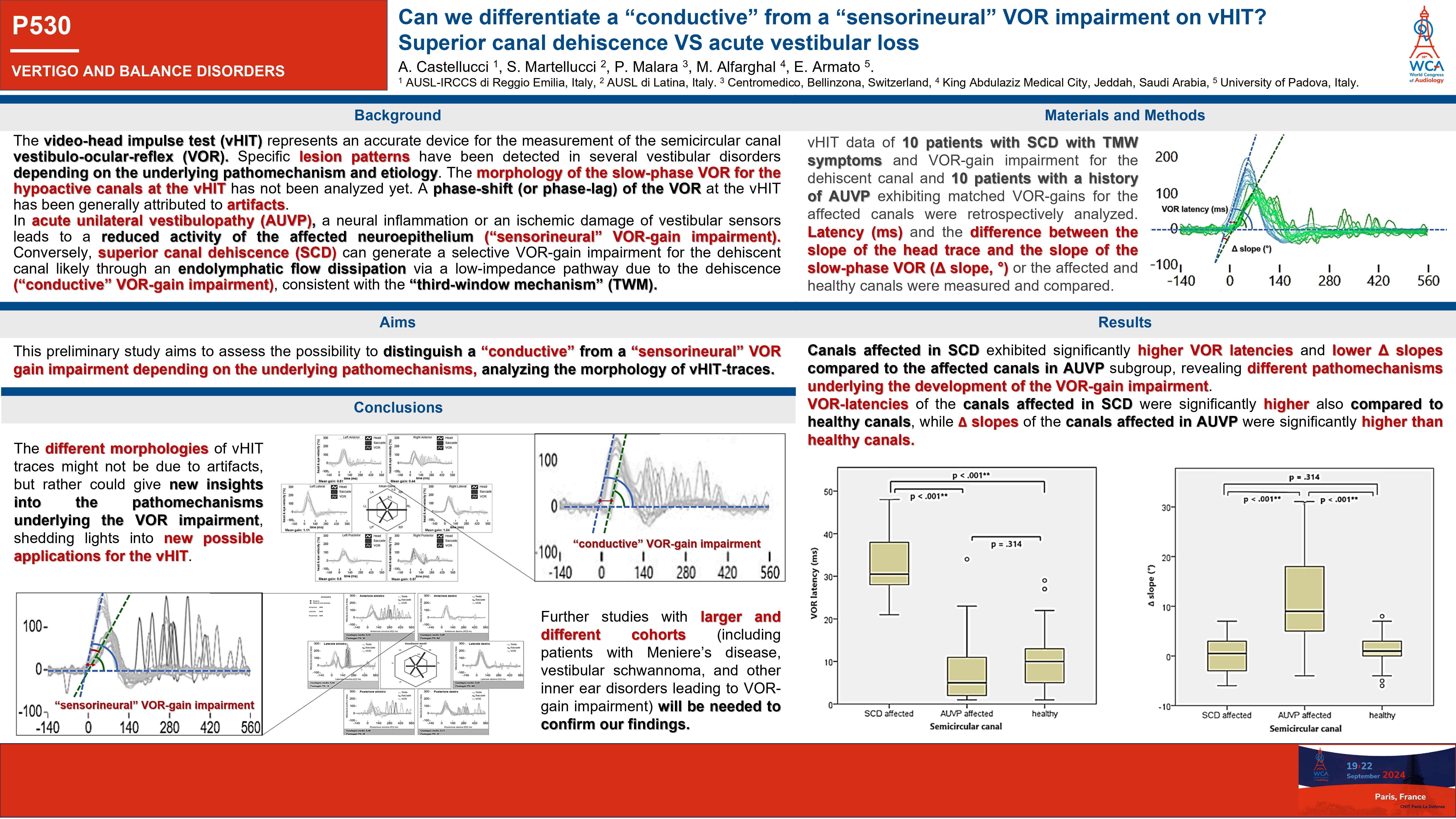 | P530 – Can we differentiate a “conductive” from a “sensorineural” VOR impairment on vHIT? Superior canal dehiscence VS acute vestibular loss | Vertigo & Balance Disorders | vertigo-balance-disorders | |