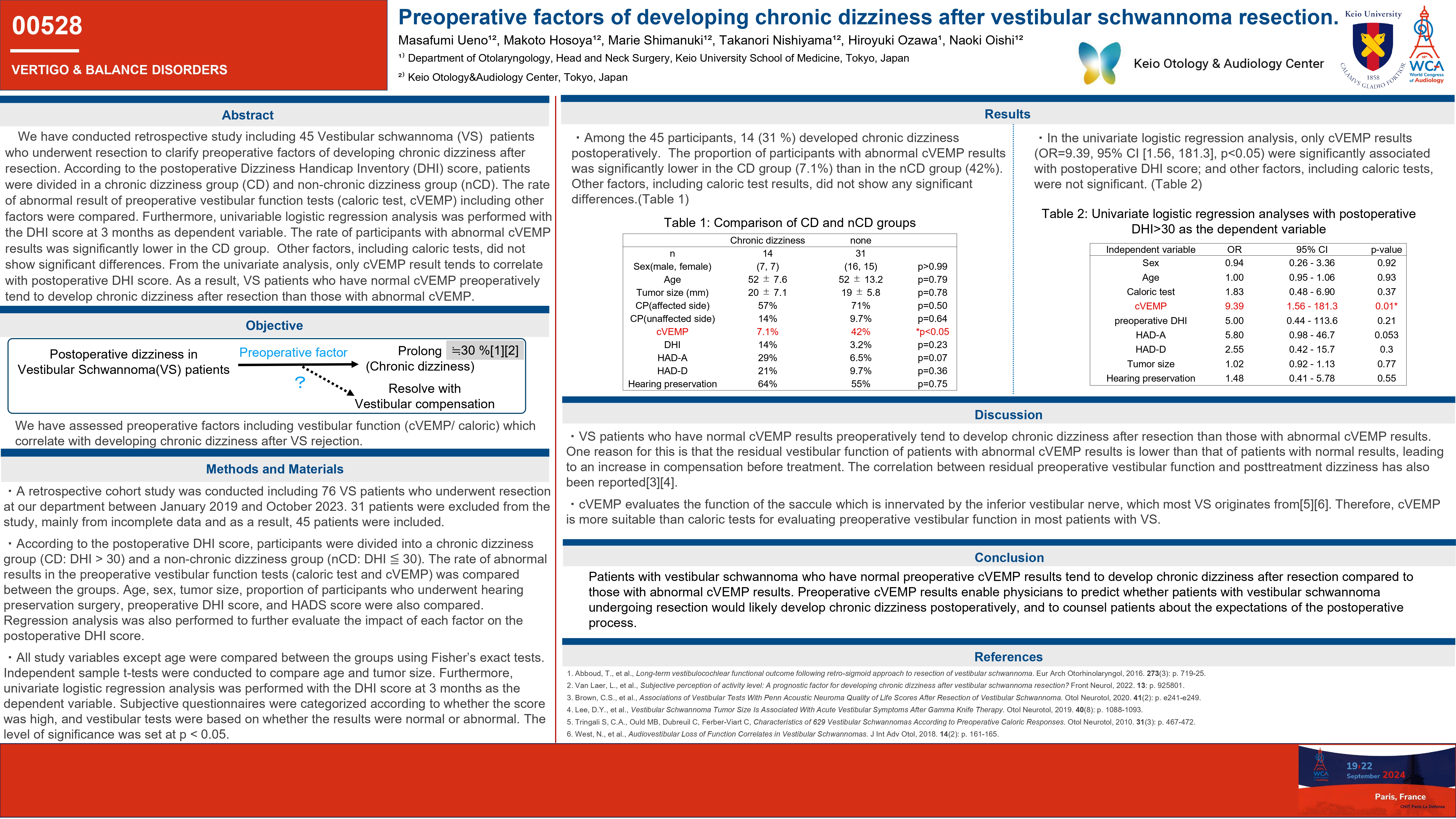 | P528 – Preoperative factors of developing chronic dizziness after vestibular schwannoma resection. | Vertigo & Balance Disorders | vertigo-balance-disorders | |