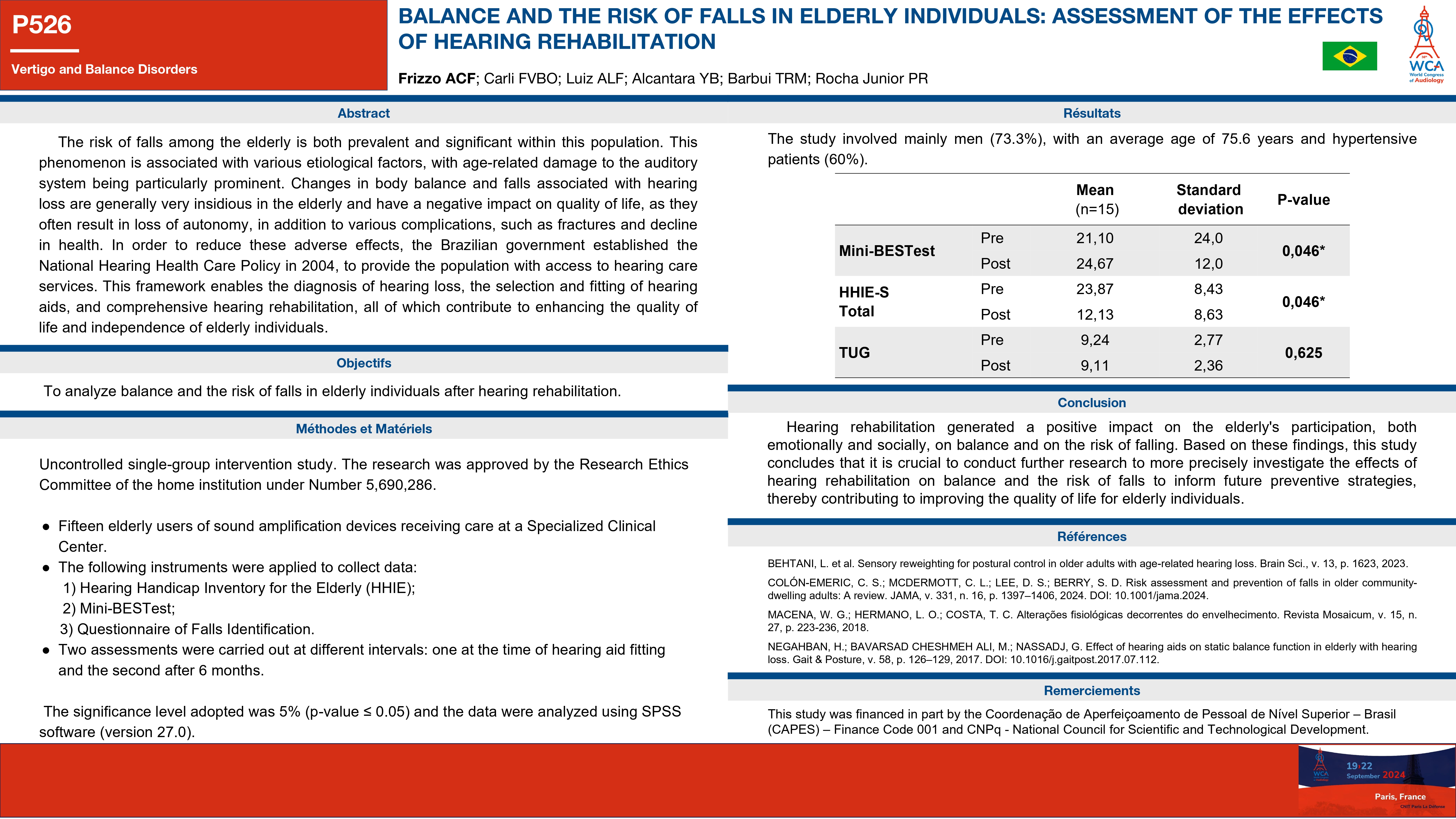 | P526 – Balance and the risk of falls in elderly individuals: assessment of the effects of hearing rehabilitation | Vertigo & Balance Disorders | vertigo-balance-disorders | |