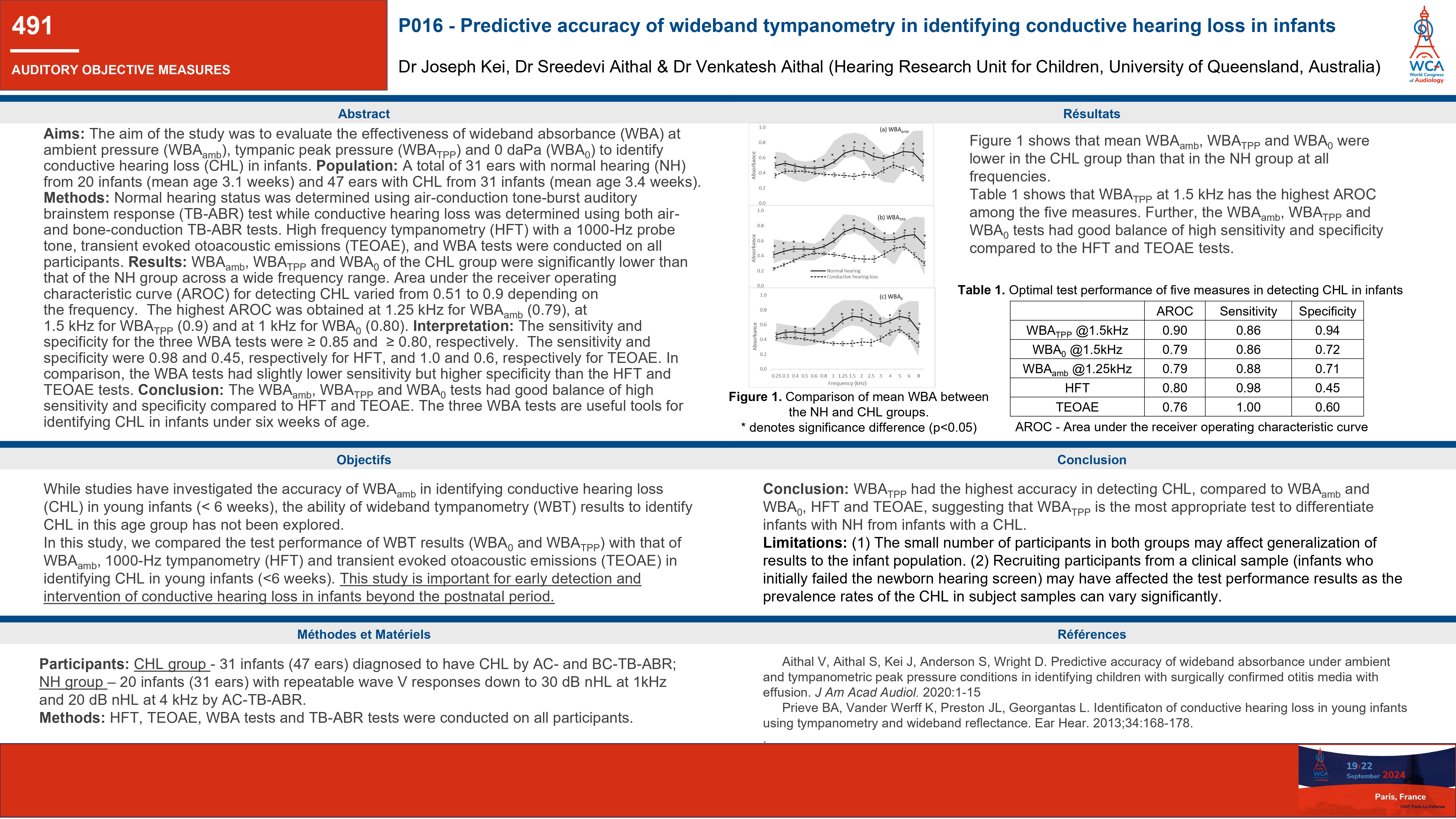 | P016 – Predictive accuracy of wideband tympanometry in identifying conductive hearing loss in infants | Auditory Objective Measures | auditory-objective-measures | |