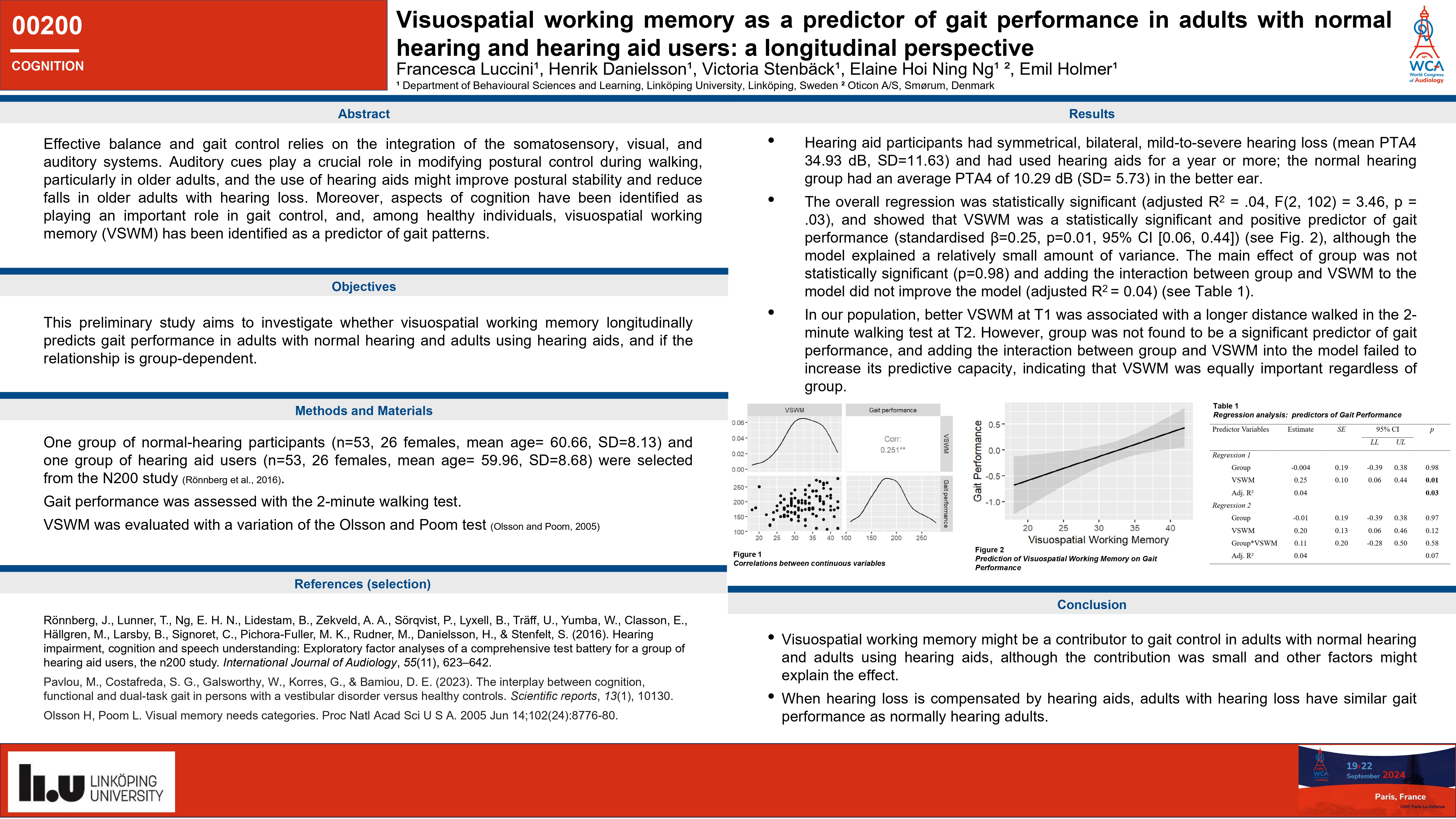 | P025 – Visuospatial working memory as a predictor of gait performance in adults with normal hearing and hearing aid users: a longitudinal perspective | Cognition | cognition | |