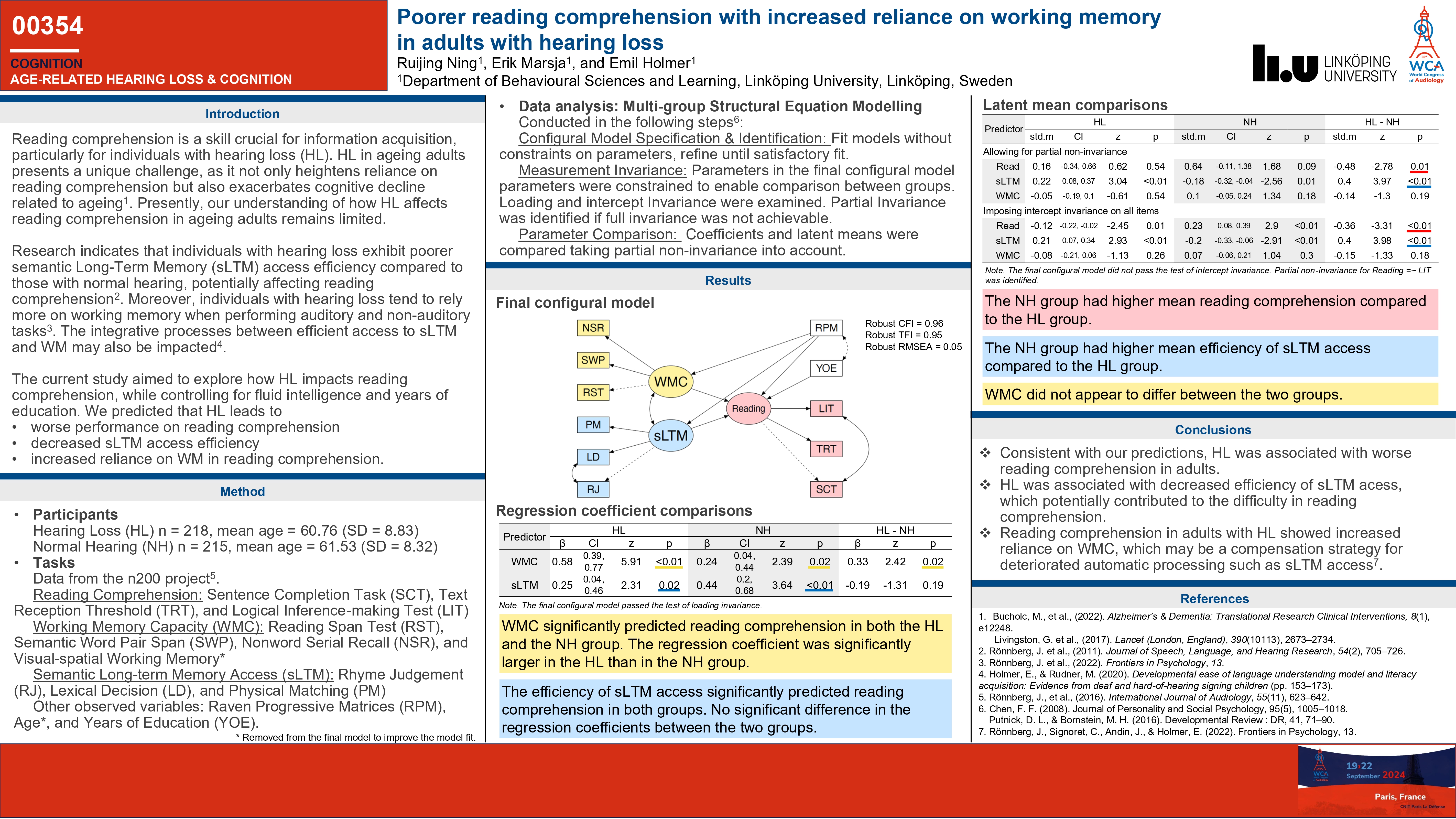 | P026 – Poorer reading comprehension with increased reliance on working memory in adults with hearing loss | Cognition | cognition | |