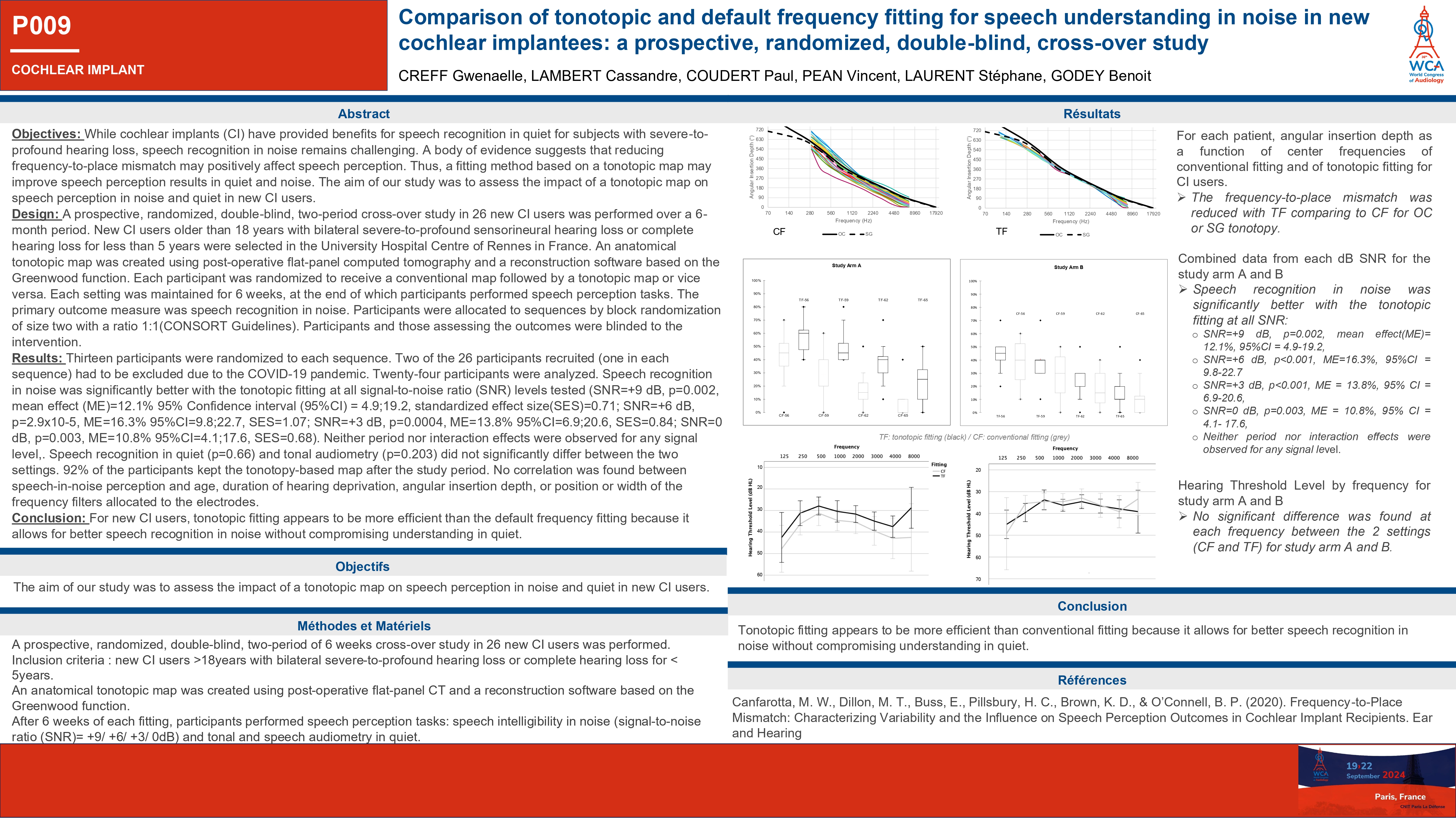 | P009 – Comparison of Tonotopic and Default Frequency Fitting for Speech Understanding in Noise in New Cochlear Implantees: A Prospective, Randomized, Double-Blind, Cross-Over Study | Auditory Implants | auditory-implants | |