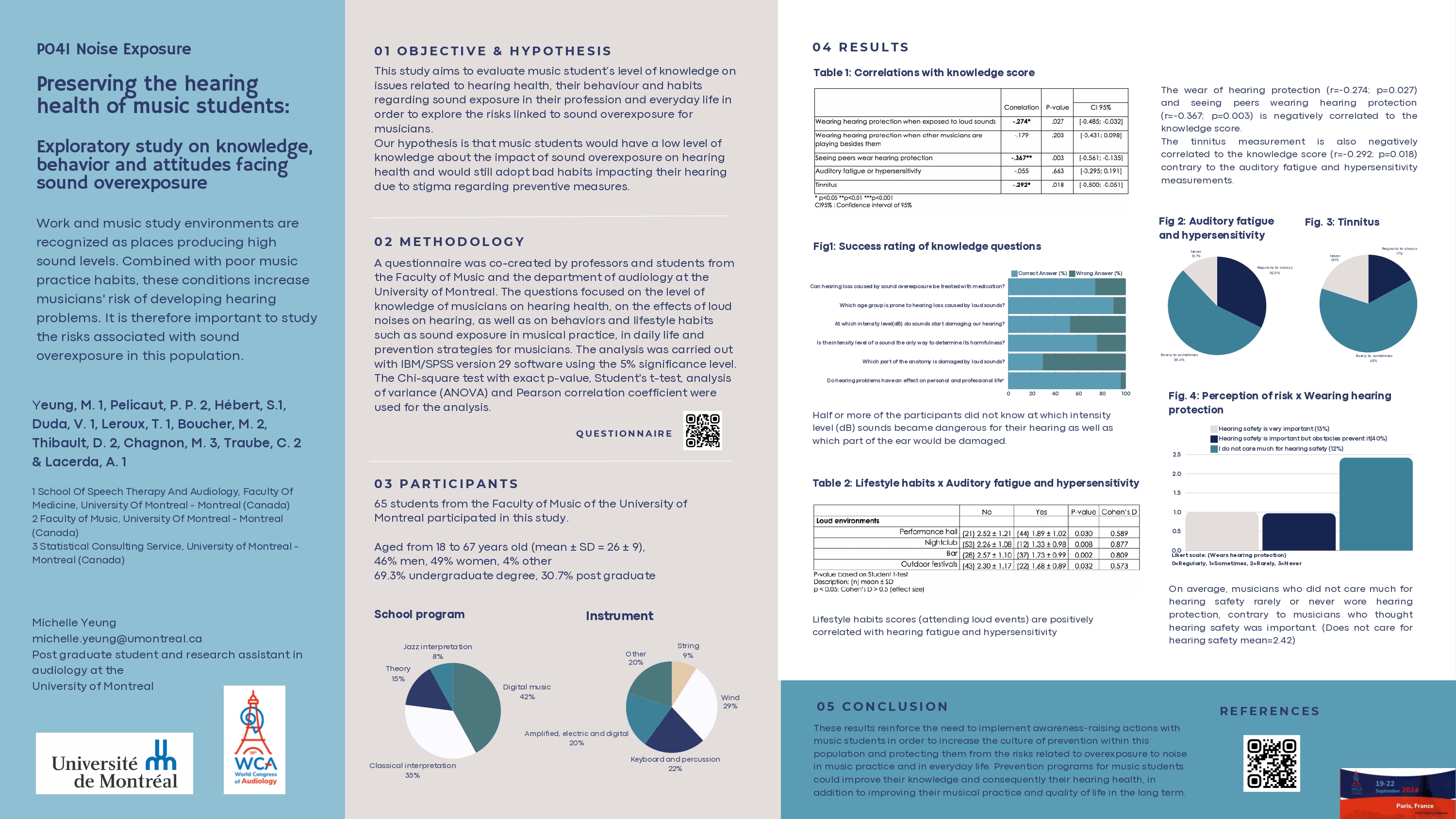 | P041 – Preserving the Hearing Health of Music Students: Exploratory study on knowledge, behavior and attitudes facing sound overexposure | Noise exposure | noise-exposure | |