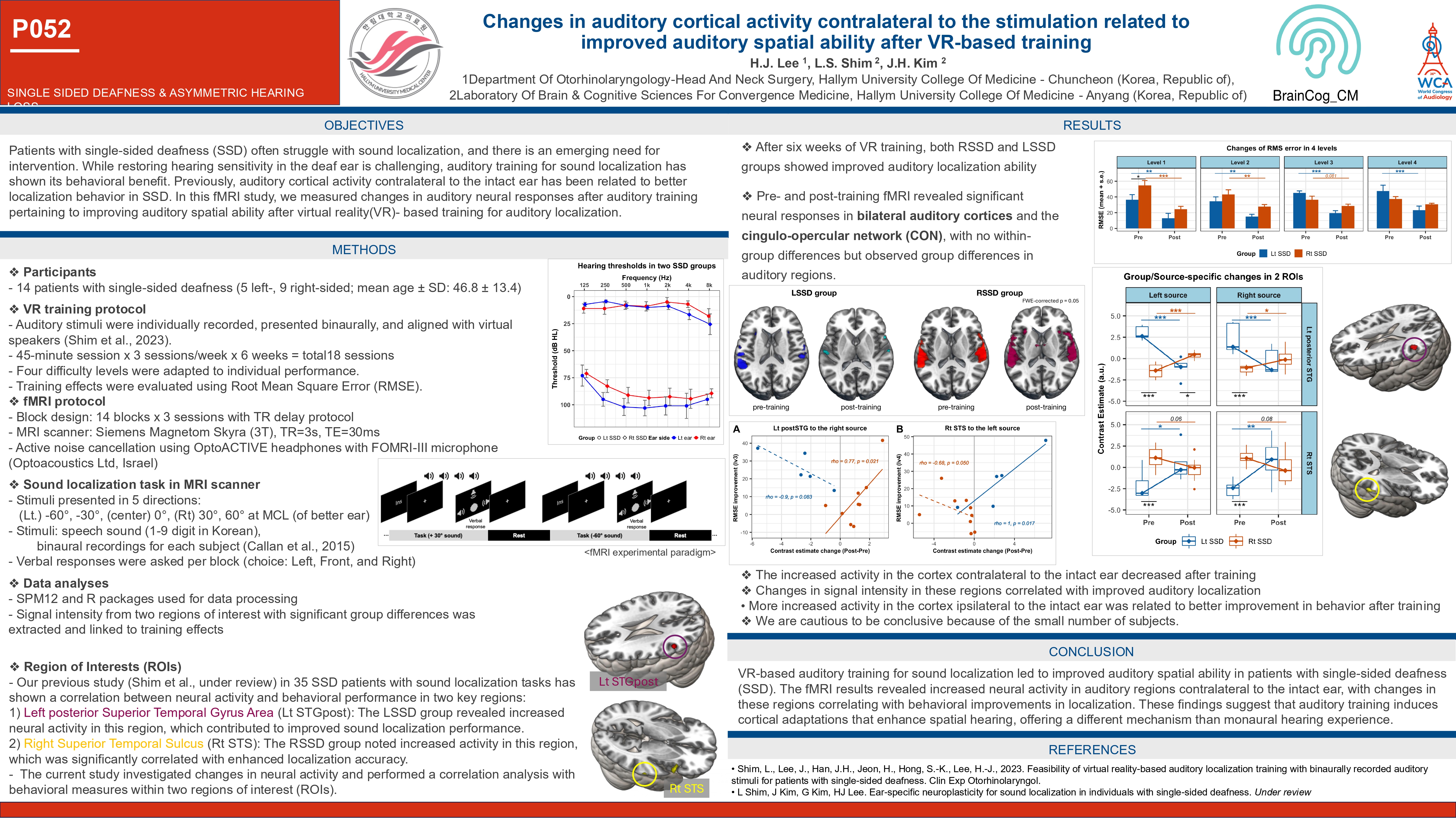 | P052 – Changes in auditory cortical activity contralateral to the stimulation related to improved auditory spatial ability after VR-based training | Single Sided Deafness & Asymmetric Hearing Loss | single-sided-deafness-asymmetric-hearing-loss | |