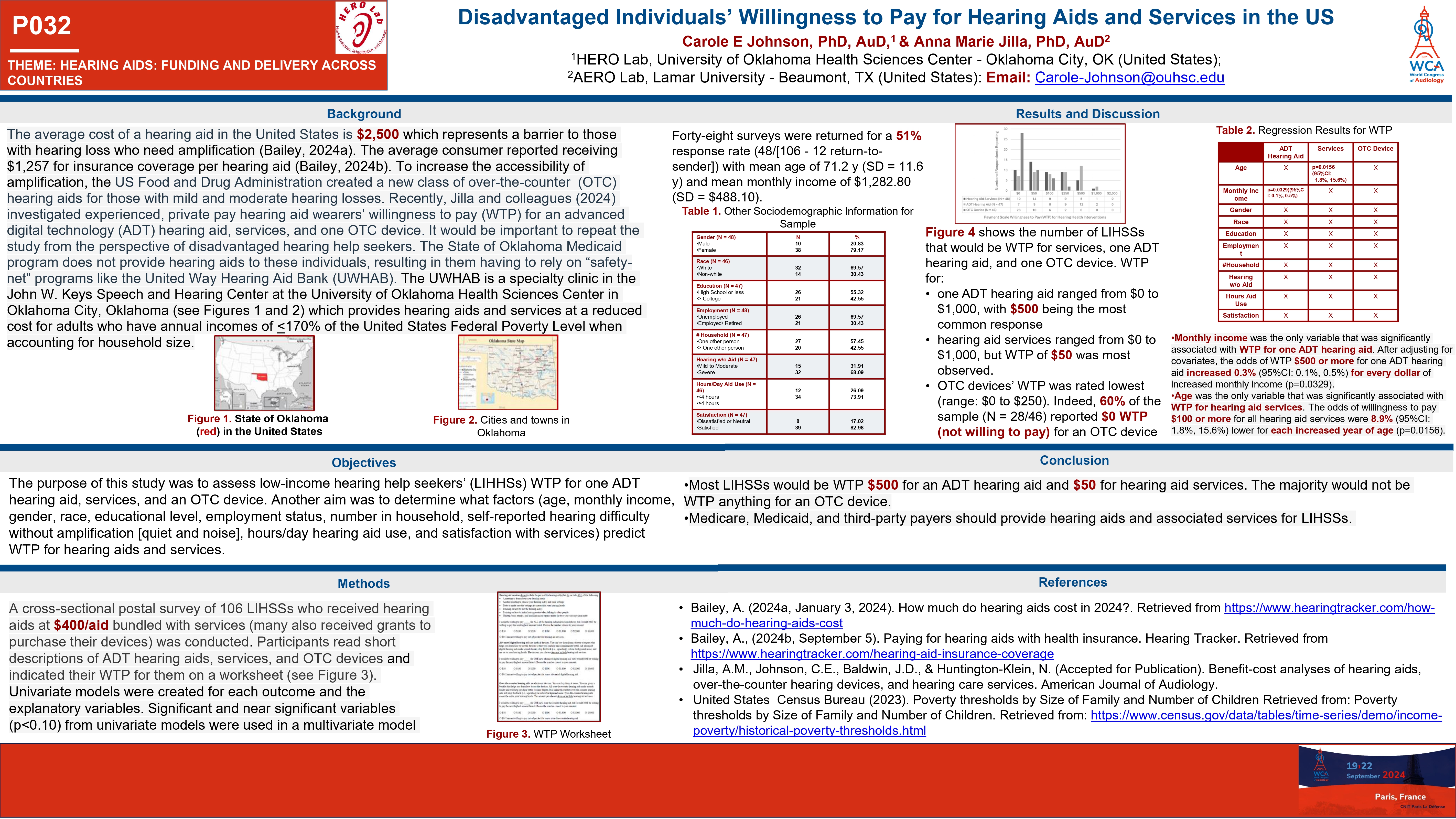 | P032 – Disadvantaged Individuals Willingness to Pay for Hearing Aids and Services in the US | Hearing aids | hearing-aids | |