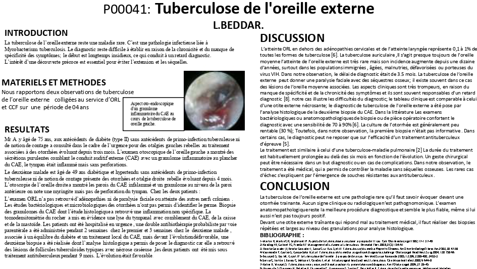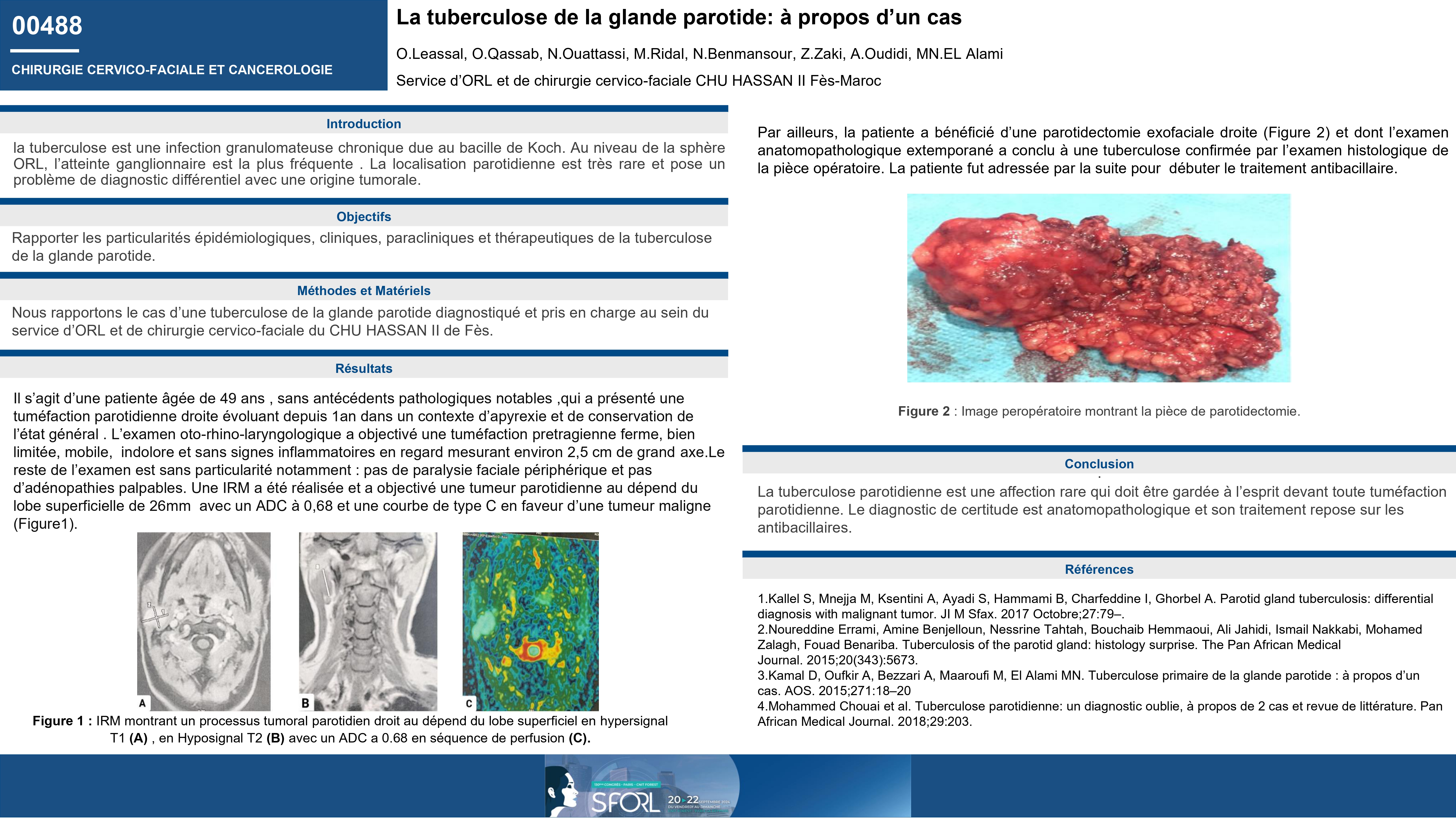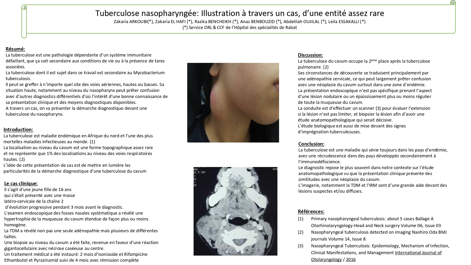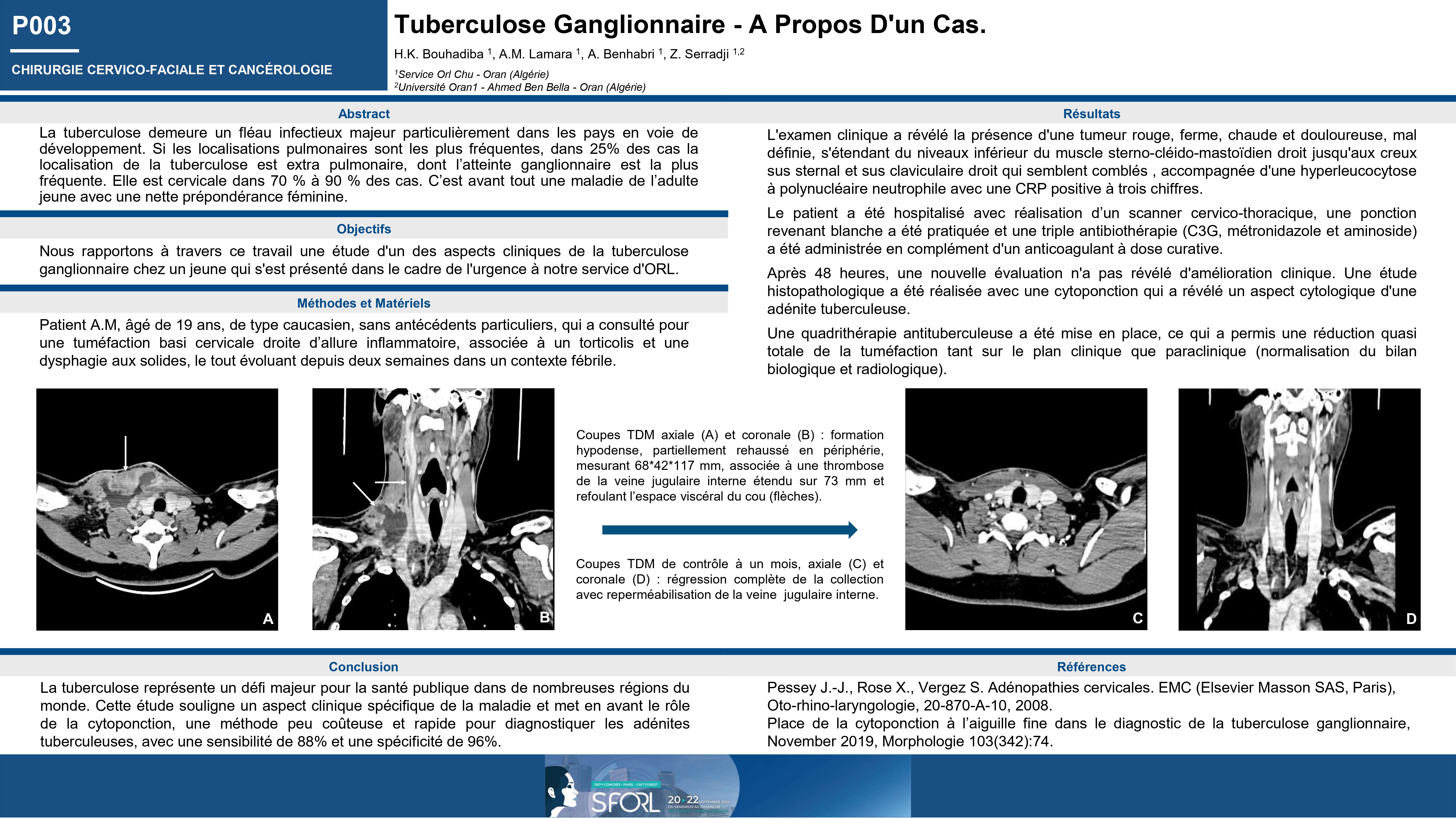 | P003 – Tuberculose ganglionnaire – A propos d’un cas. | Chirurgie cervico-faciale et Cancérologie | chirurgie-cervico-faciale-et-cancerologie | |
