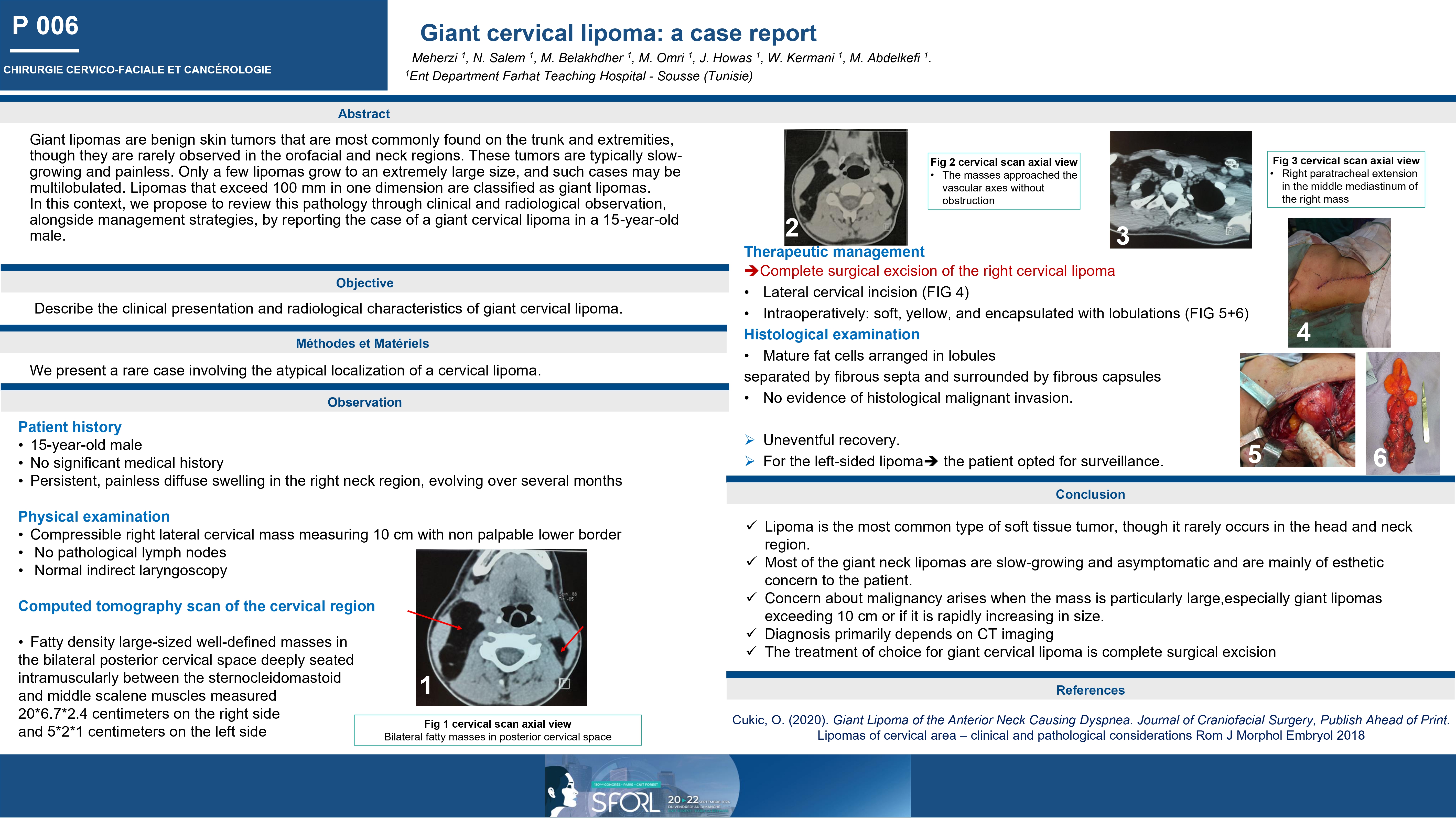 | P006 – a giant cervical lipoma: a case report | Chirurgie cervico-faciale et Cancérologie | chirurgie-cervico-faciale-et-cancerologie | |