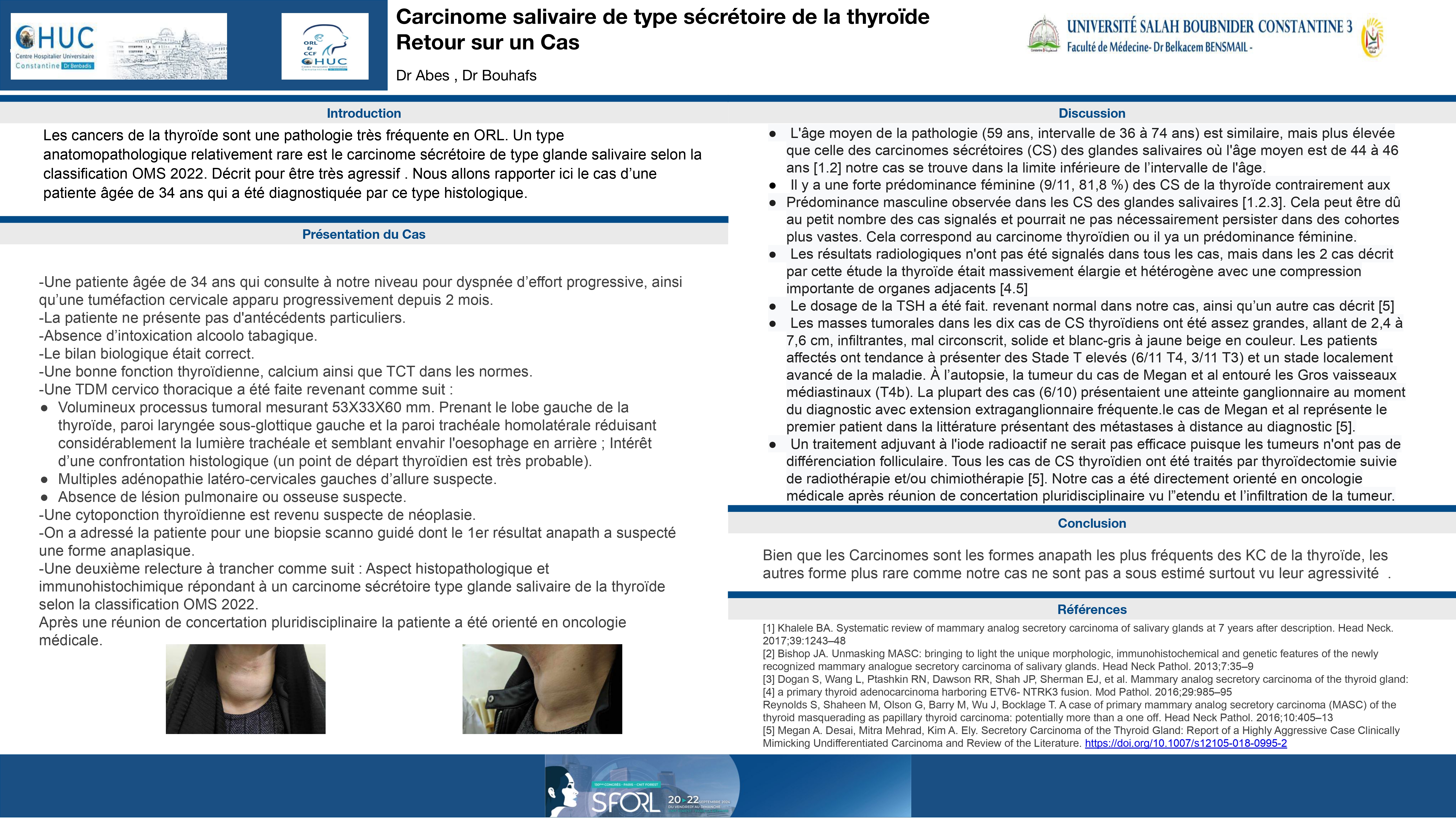 | P007 – le carcinome secretoire de la thyroide; une entité rare : à propos d’un cas | Chirurgie cervico-faciale et Cancérologie | chirurgie-cervico-faciale-et-cancerologie | |