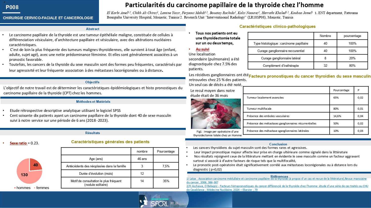 | P008 – Particularités du carcinome papillaire de la thyroide chez l’homme | Chirurgie cervico-faciale et Cancérologie | chirurgie-cervico-faciale-et-cancerologie | |