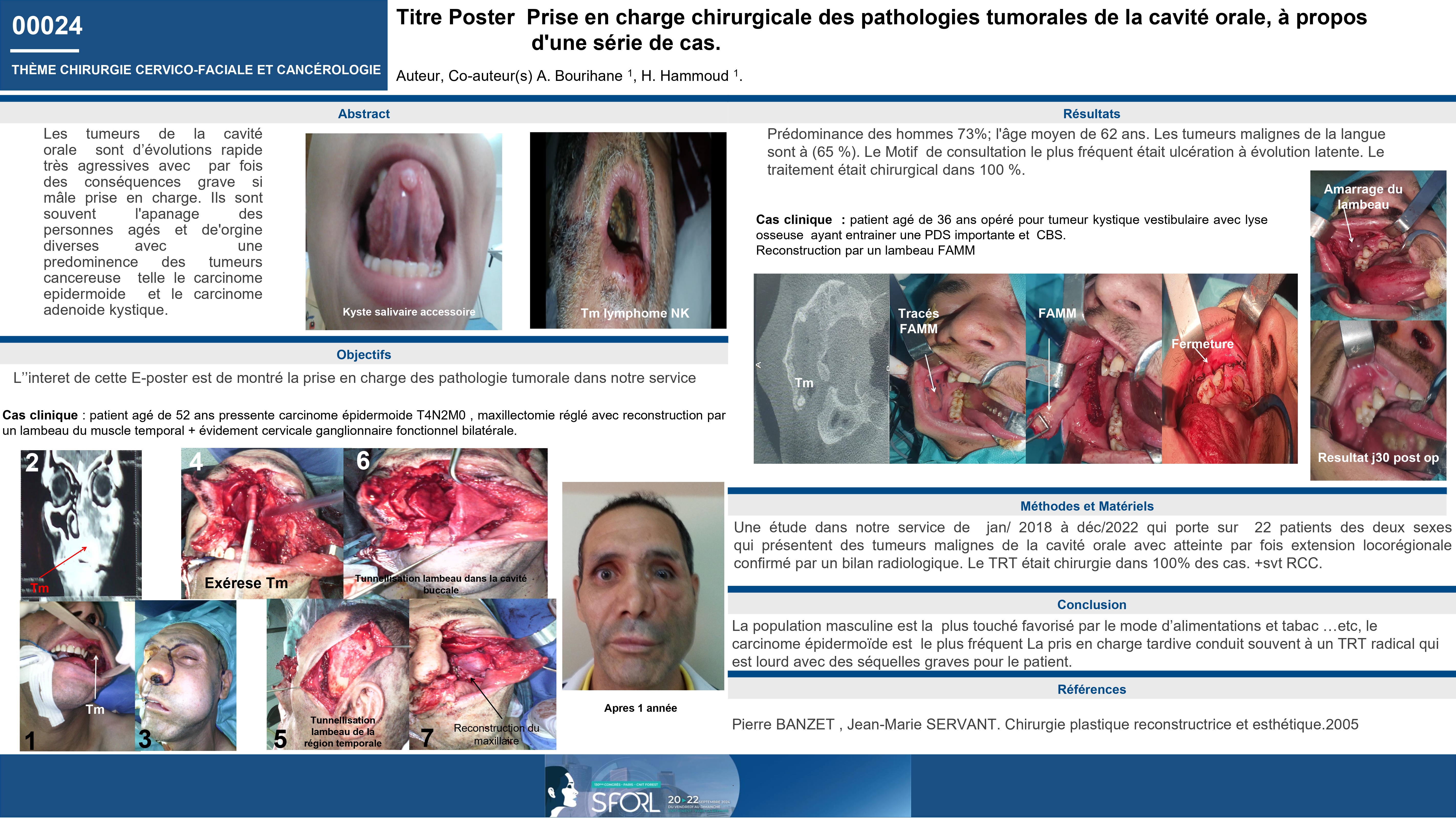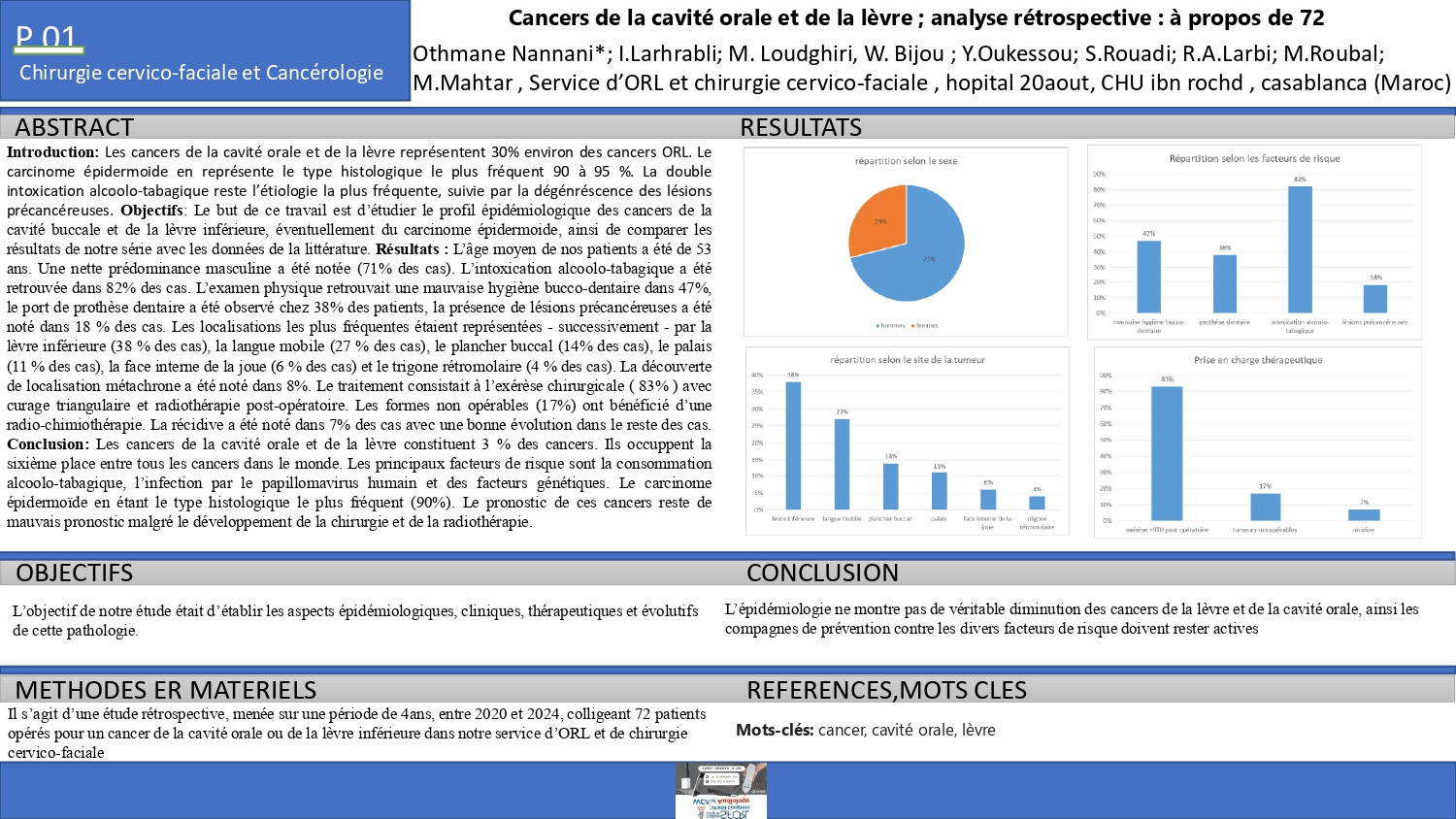 | P011 – Cancers de la cavité orale et de la lèvre ; analyse rétrospective : à propos de 72 cas | Chirurgie cervico-faciale et Cancérologie | chirurgie-cervico-faciale-et-cancerologie | |