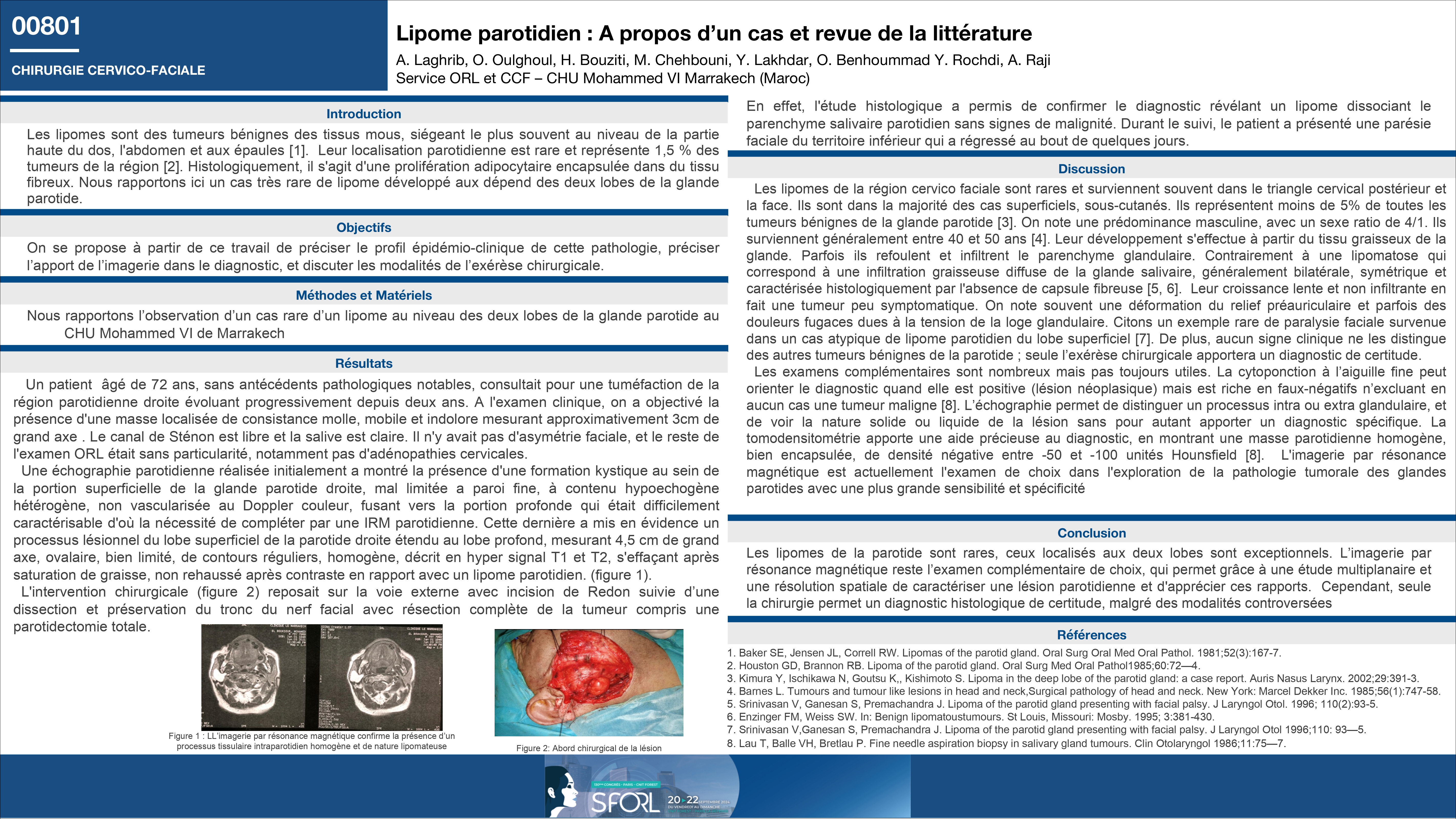| P015 – Lipome parotidien : A propos d’un cas et revue de la littérature | Chirurgie cervico-faciale et Cancérologie | chirurgie-cervico-faciale-et-cancerologie | |
