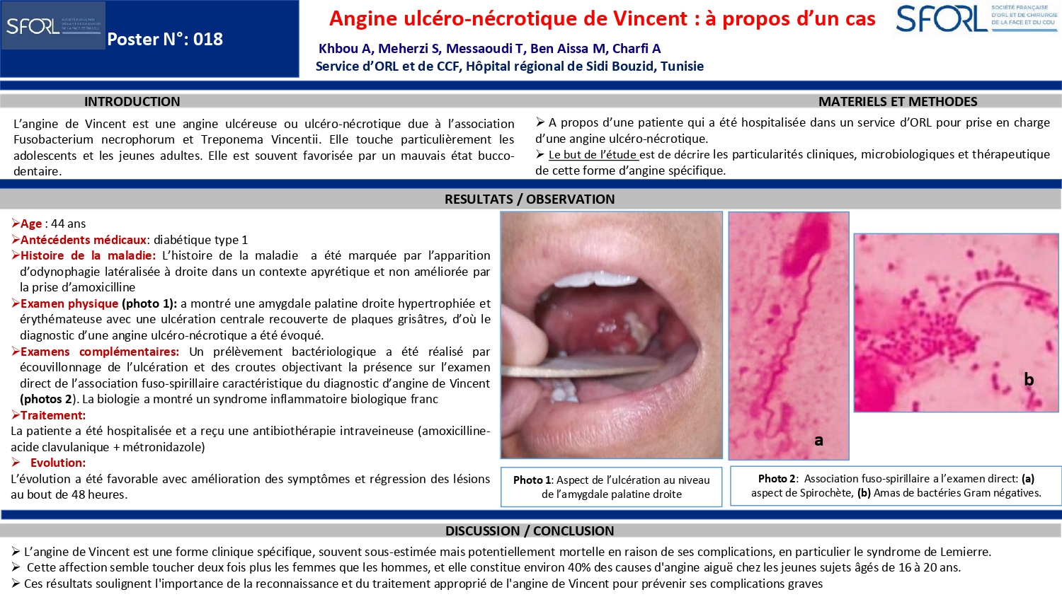 | P018 – Angine ulcéro-nécrotique de Vincent : à propos d’un cas | Chirurgie cervico-faciale et Cancérologie | chirurgie-cervico-faciale-et-cancerologie | |