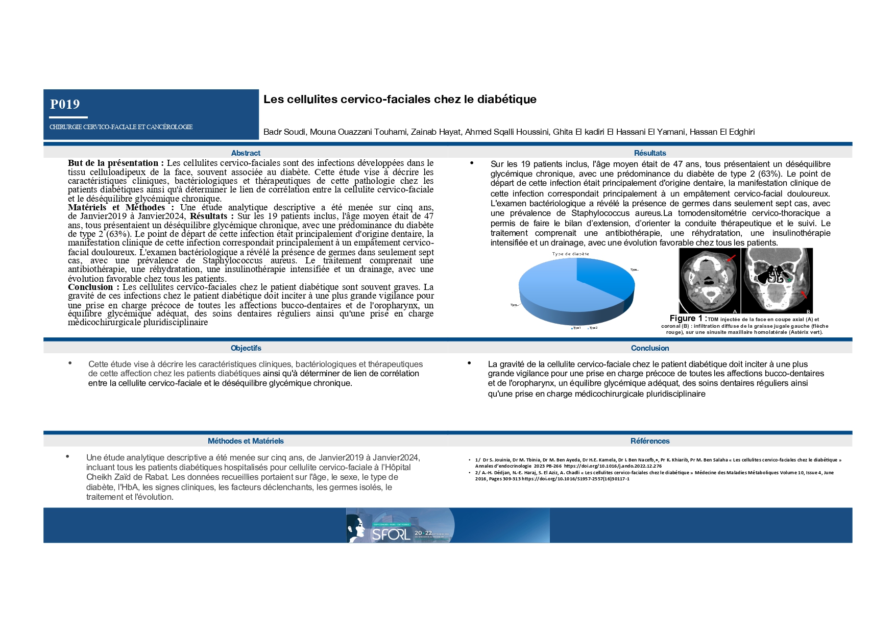 | P019 – Les cellulites cervico-faciales chez le diabétique | Chirurgie cervico-faciale et Cancérologie | chirurgie-cervico-faciale-et-cancerologie | |