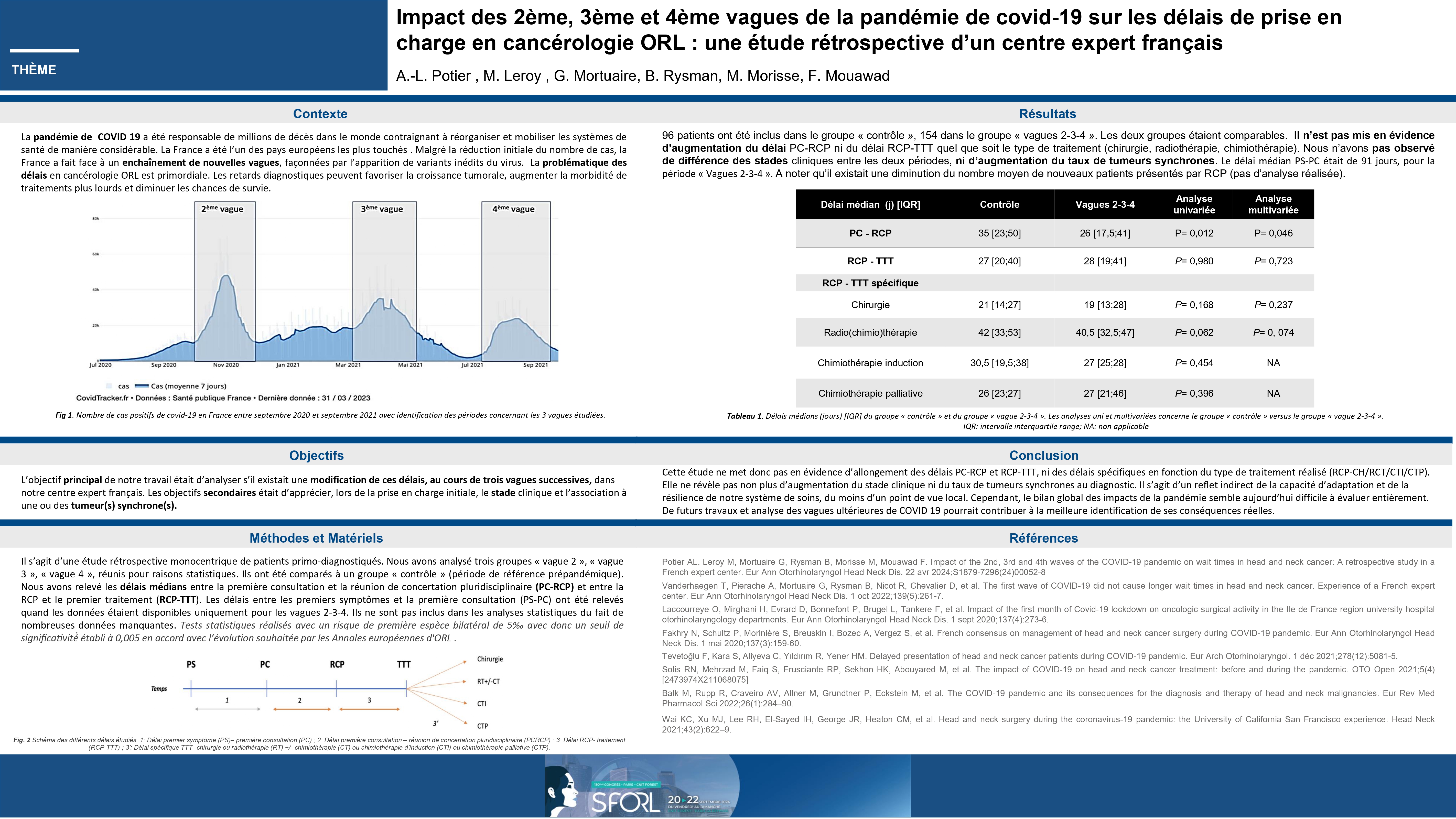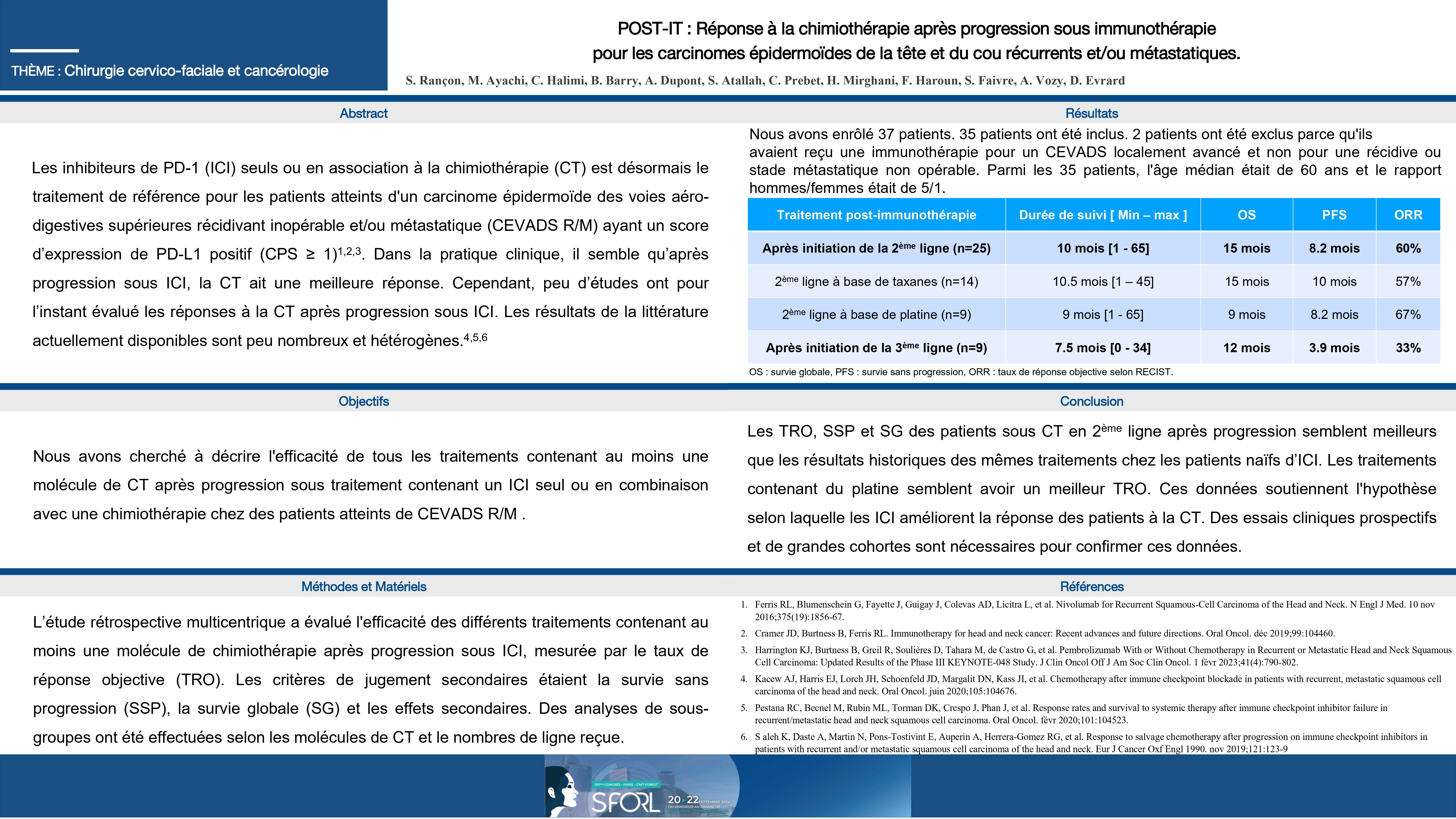 | P020 – Post-it : Pour les patients avec cancers ORL récidivants inopérables et/ou métastatiques, la chimiothérapie est-elle plus efficace après une ligne par immunothérapie ? | Chirurgie cervico-faciale et Cancérologie | chirurgie-cervico-faciale-et-cancerologie | |