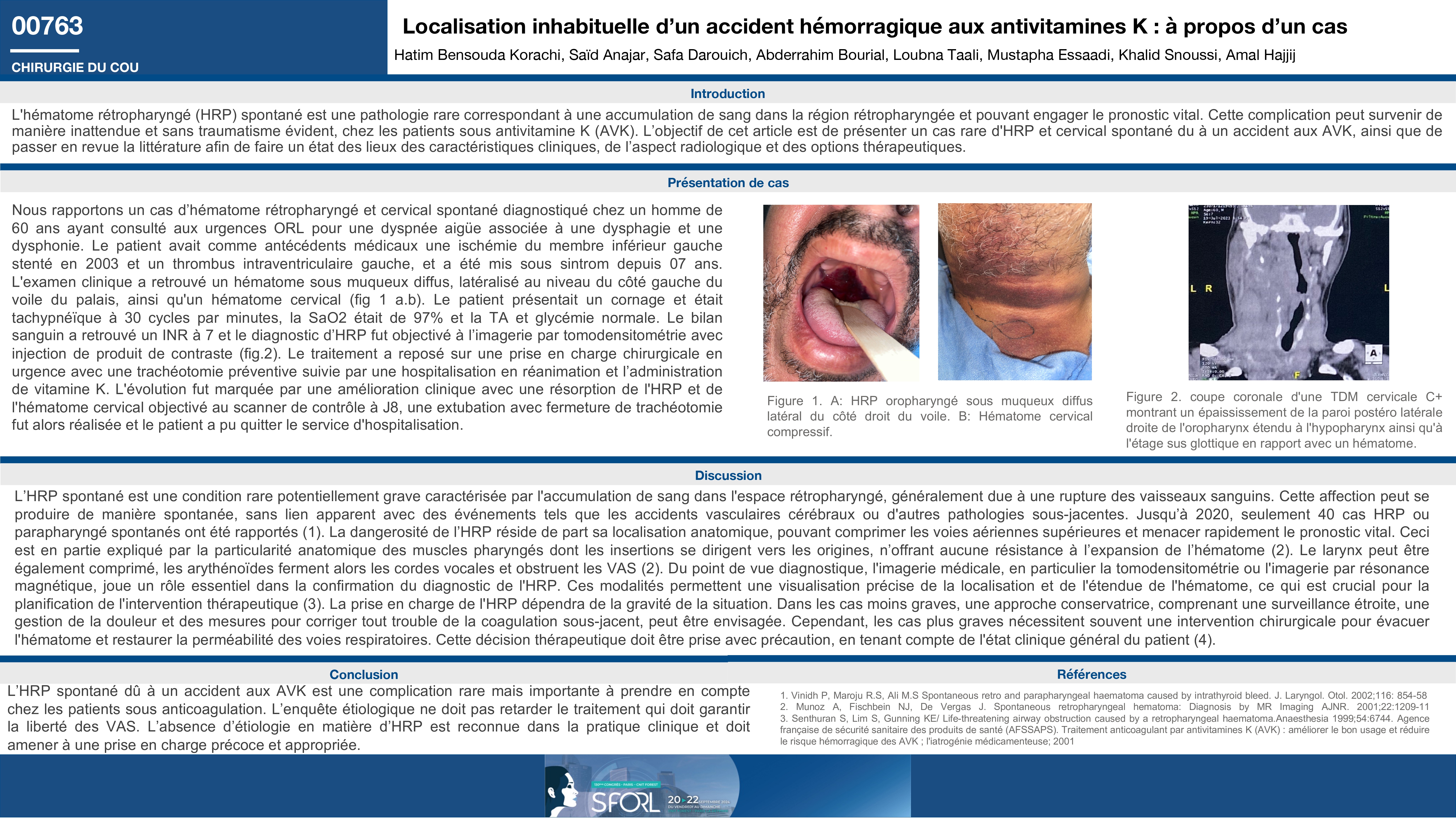 | P022 – Localisation inhabituelle d’un accident hémorragique aux antivitamines K : à propos d’un cas | Chirurgie cervico-faciale et Cancérologie | chirurgie-cervico-faciale-et-cancerologie | |