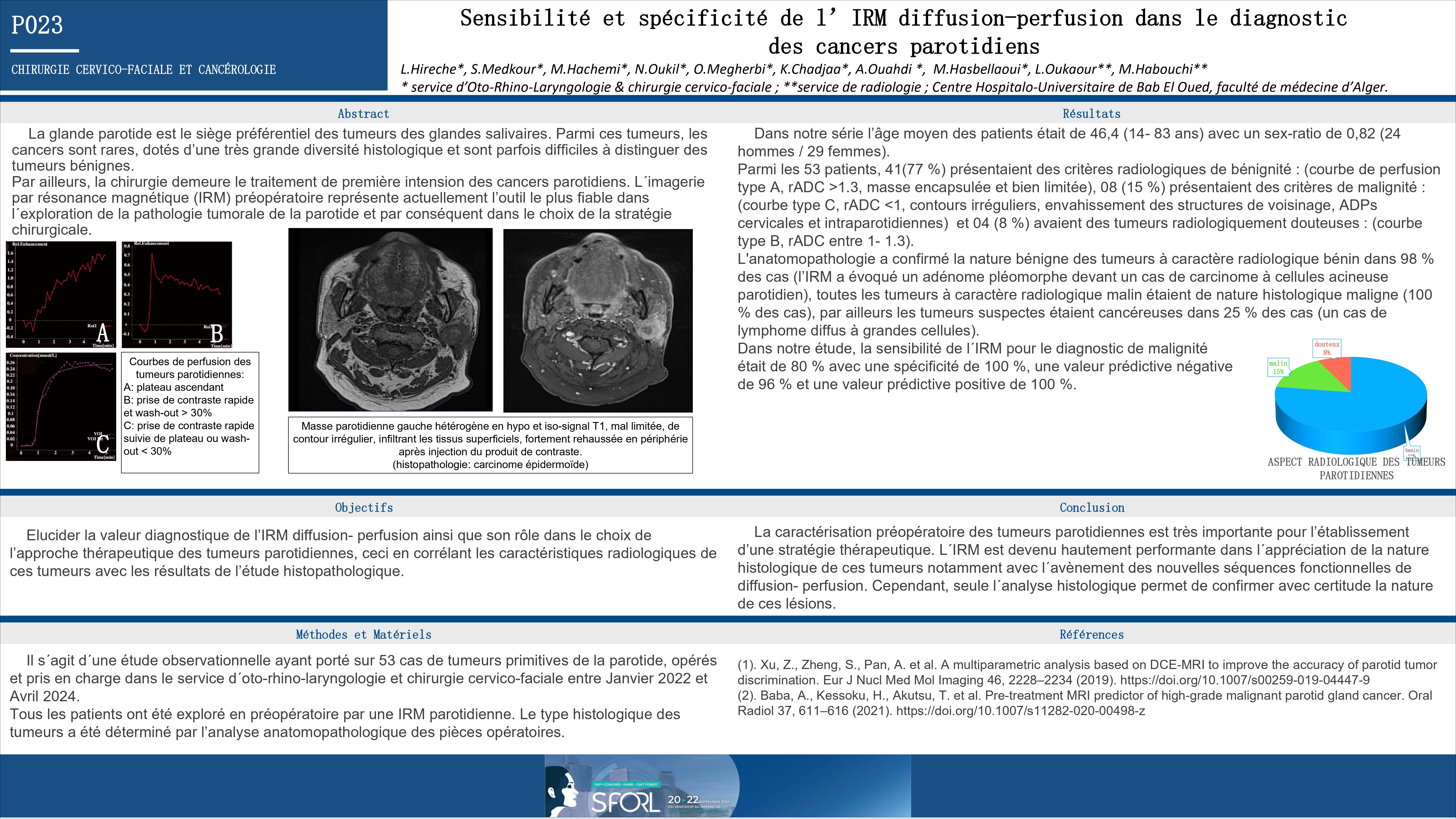| P023 – Sensibilité et spécificité de l’IRM diffusion perfusion dans le diagnostic des cancers parotidiens | Chirurgie cervico-faciale et Cancérologie | chirurgie-cervico-faciale-et-cancerologie | |