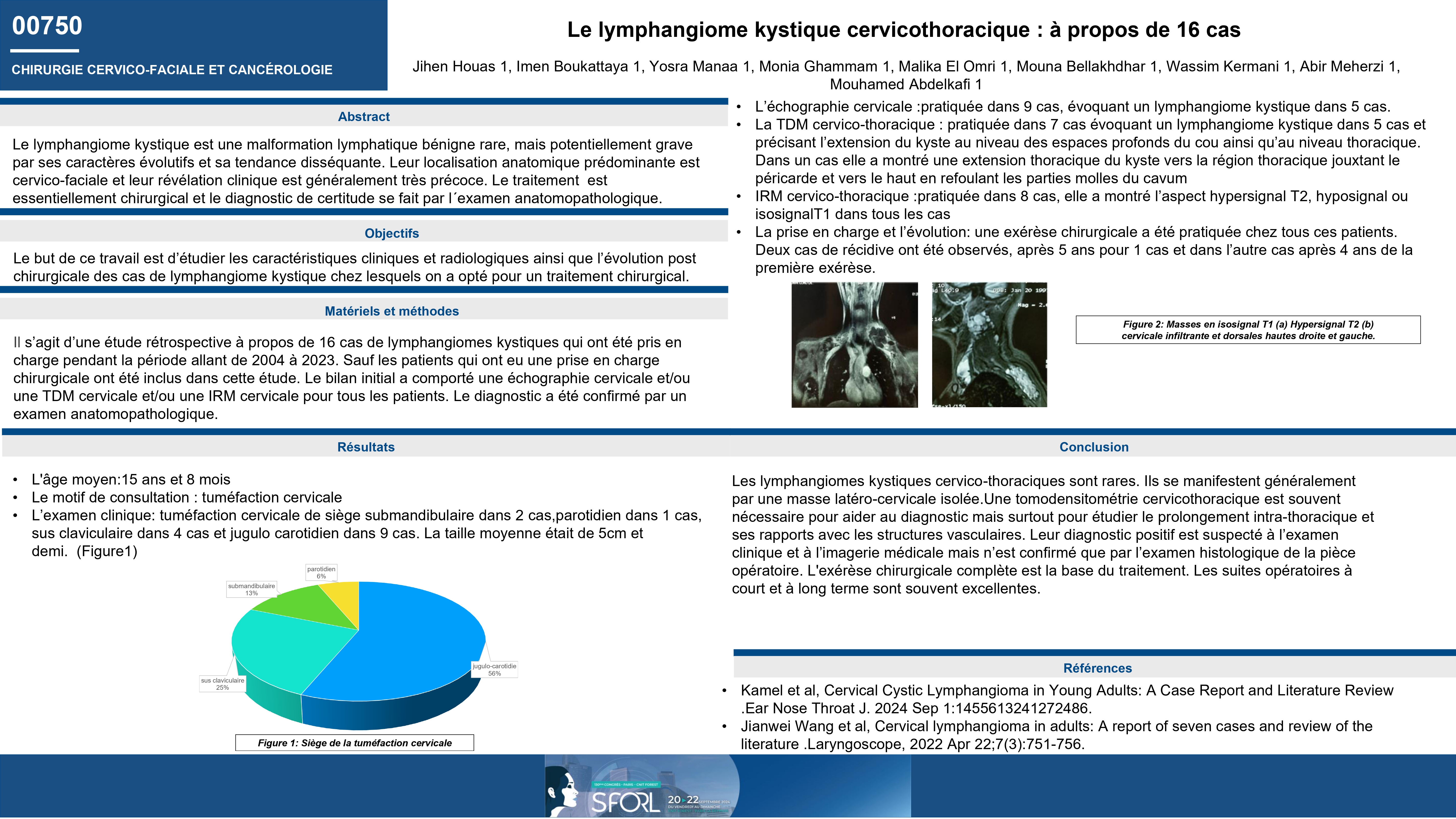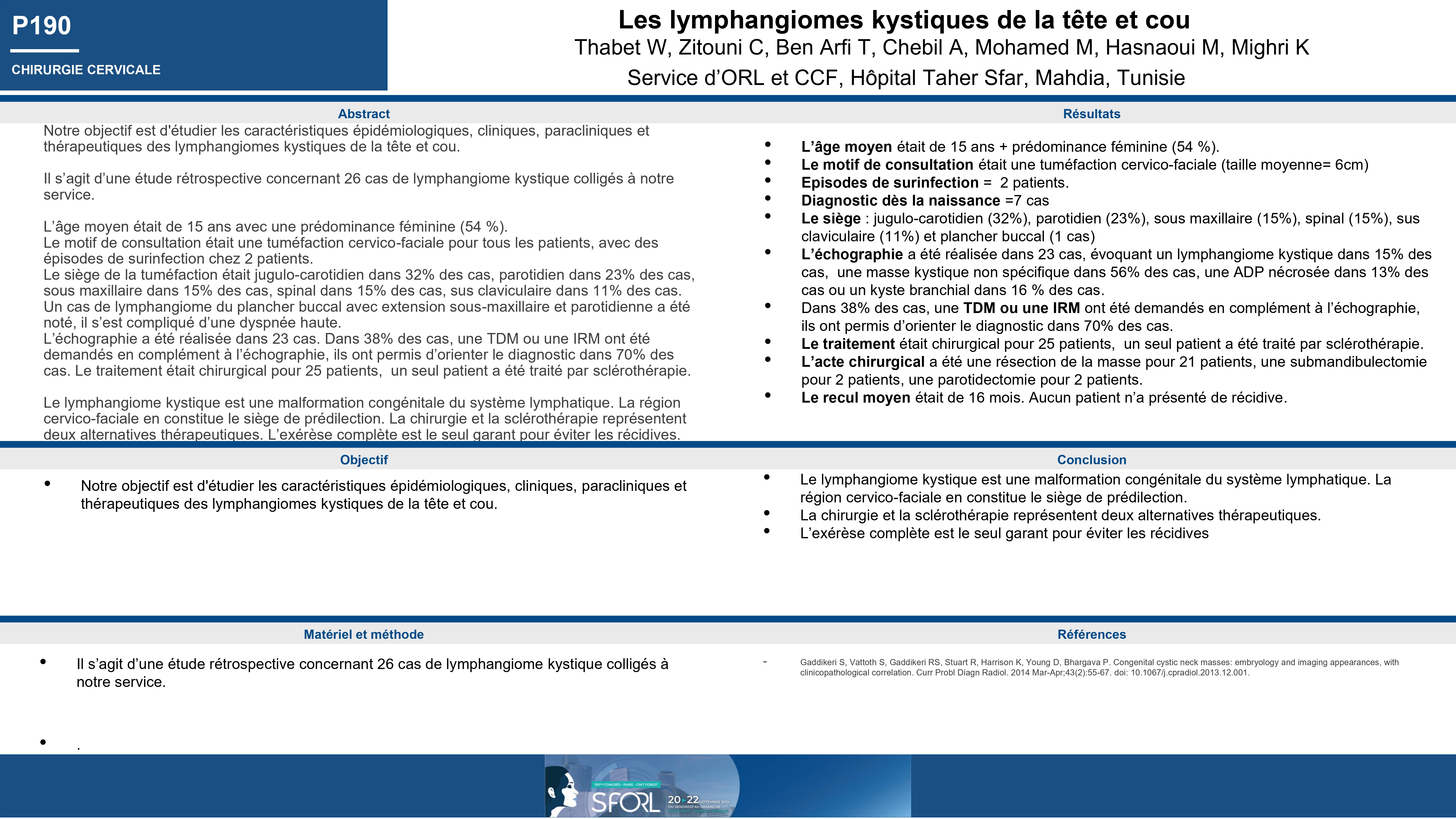 | P026 – Le lymphangiome kystique cervico-thoracique : à propos de 16 cas | Chirurgie cervico-faciale et Cancérologie | chirurgie-cervico-faciale-et-cancerologie | |