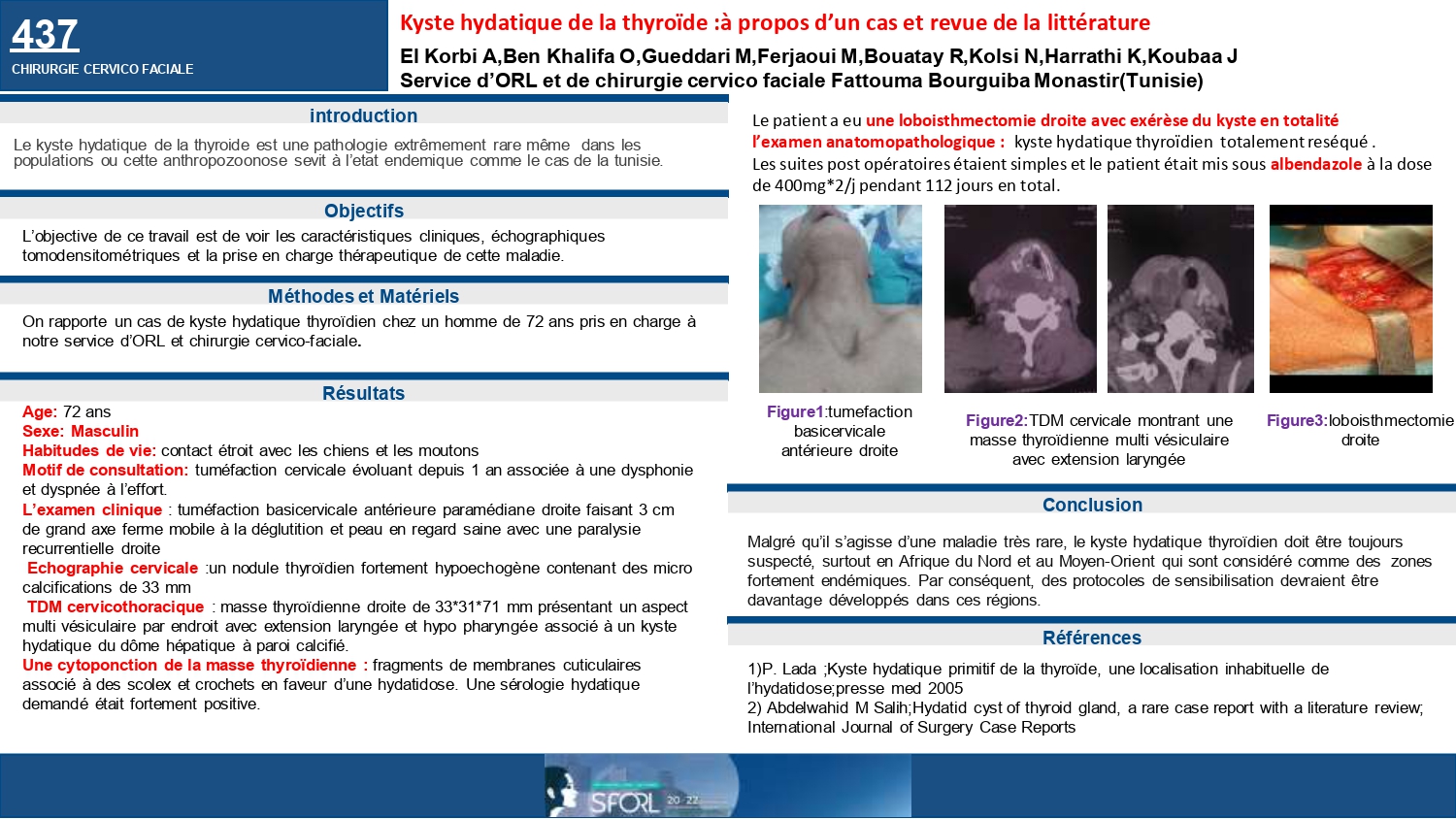 | P031 – Kyste hydatique de la thyroide :à propos d’un cas et revue de la littérature | Chirurgie cervico-faciale et Cancérologie | chirurgie-cervico-faciale-et-cancerologie | |
