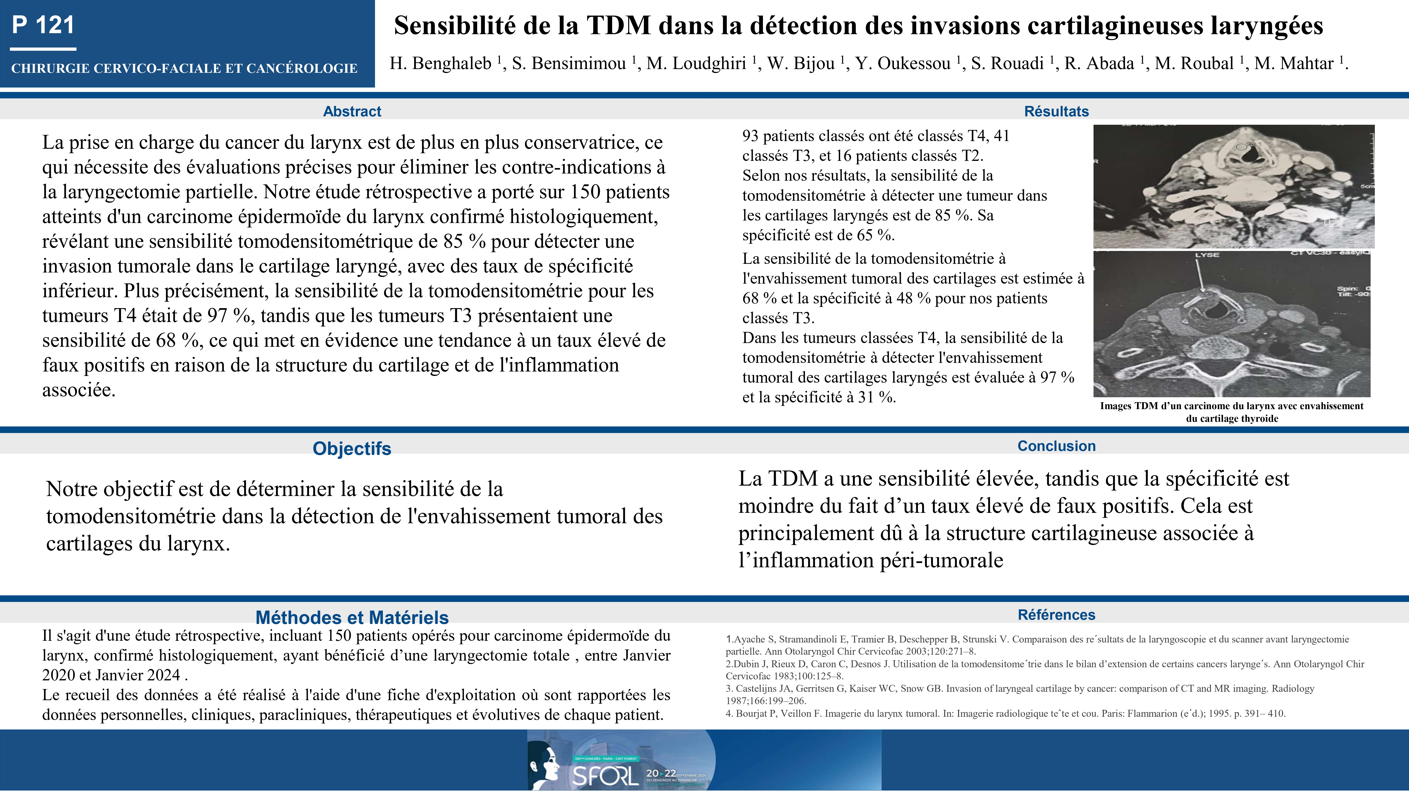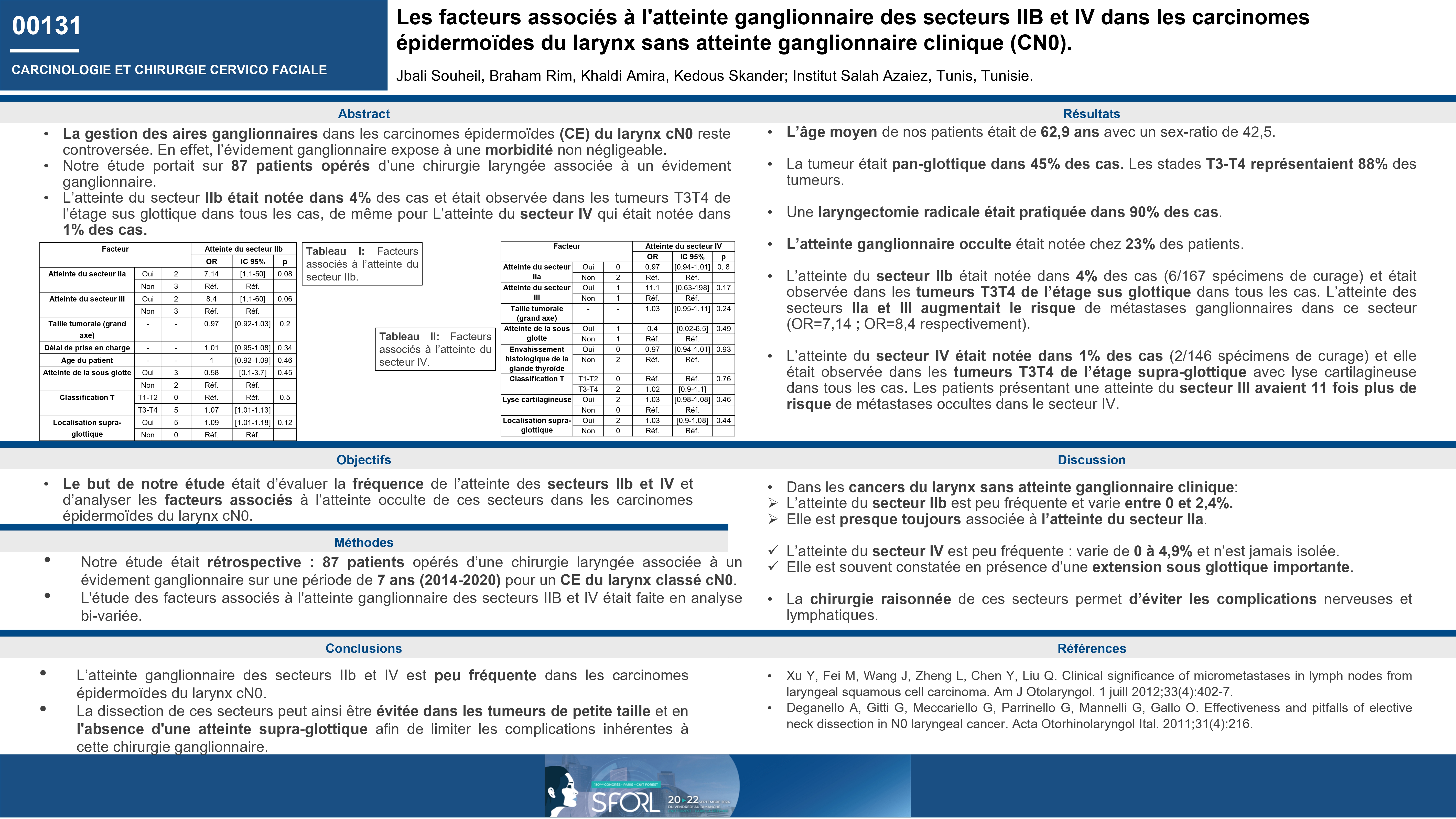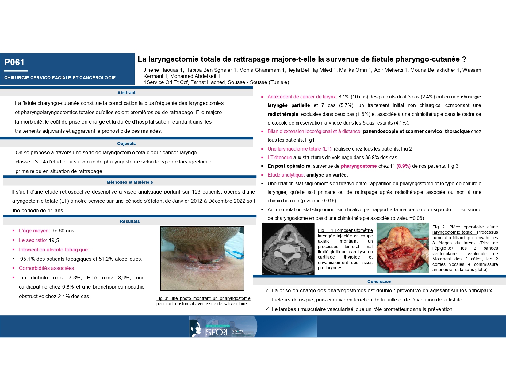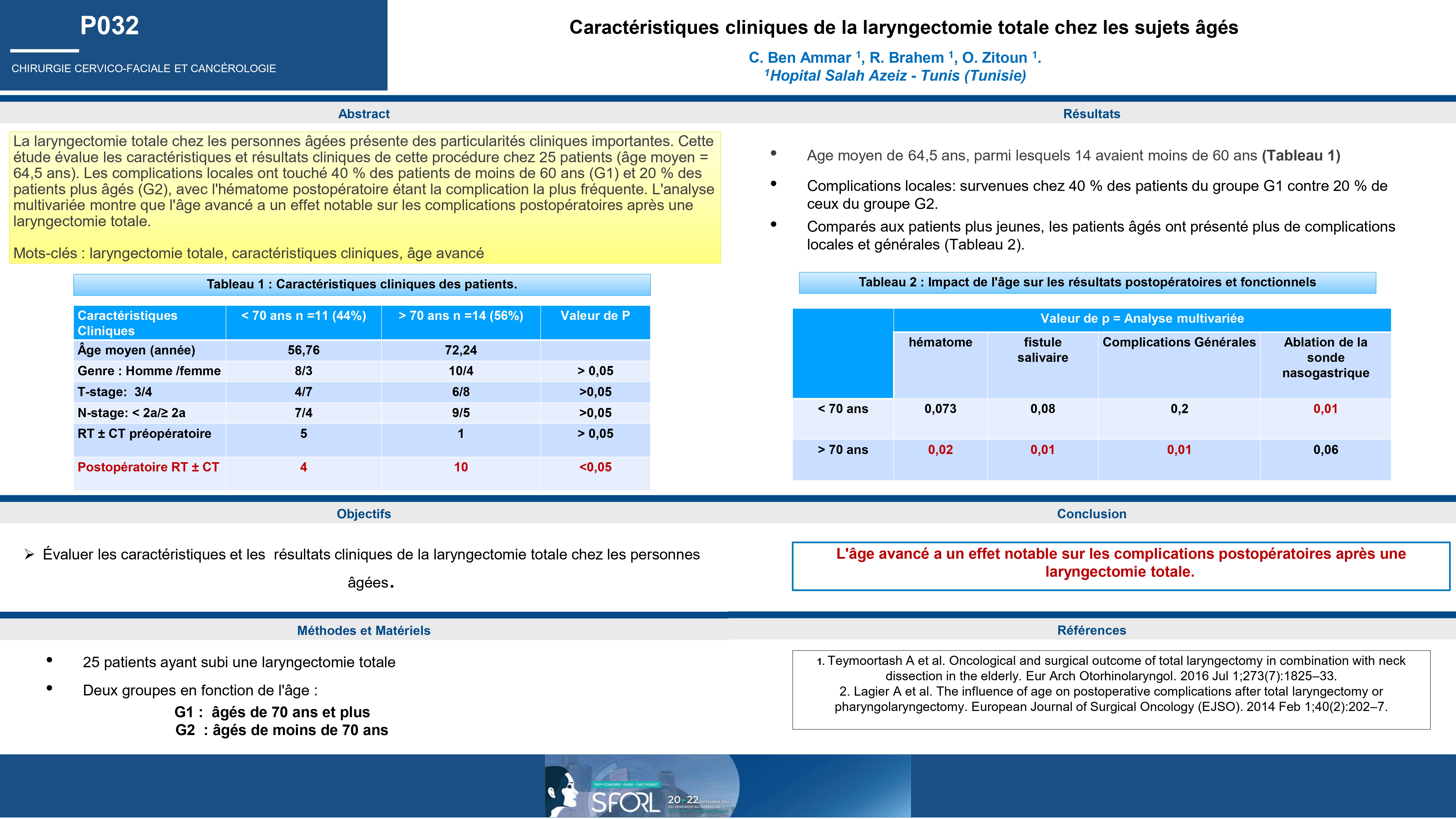 | P032 – Caractéristiques cliniques de la laryngectomie totale chez les sujets âgés | Chirurgie cervico-faciale et Cancérologie | chirurgie-cervico-faciale-et-cancerologie | |