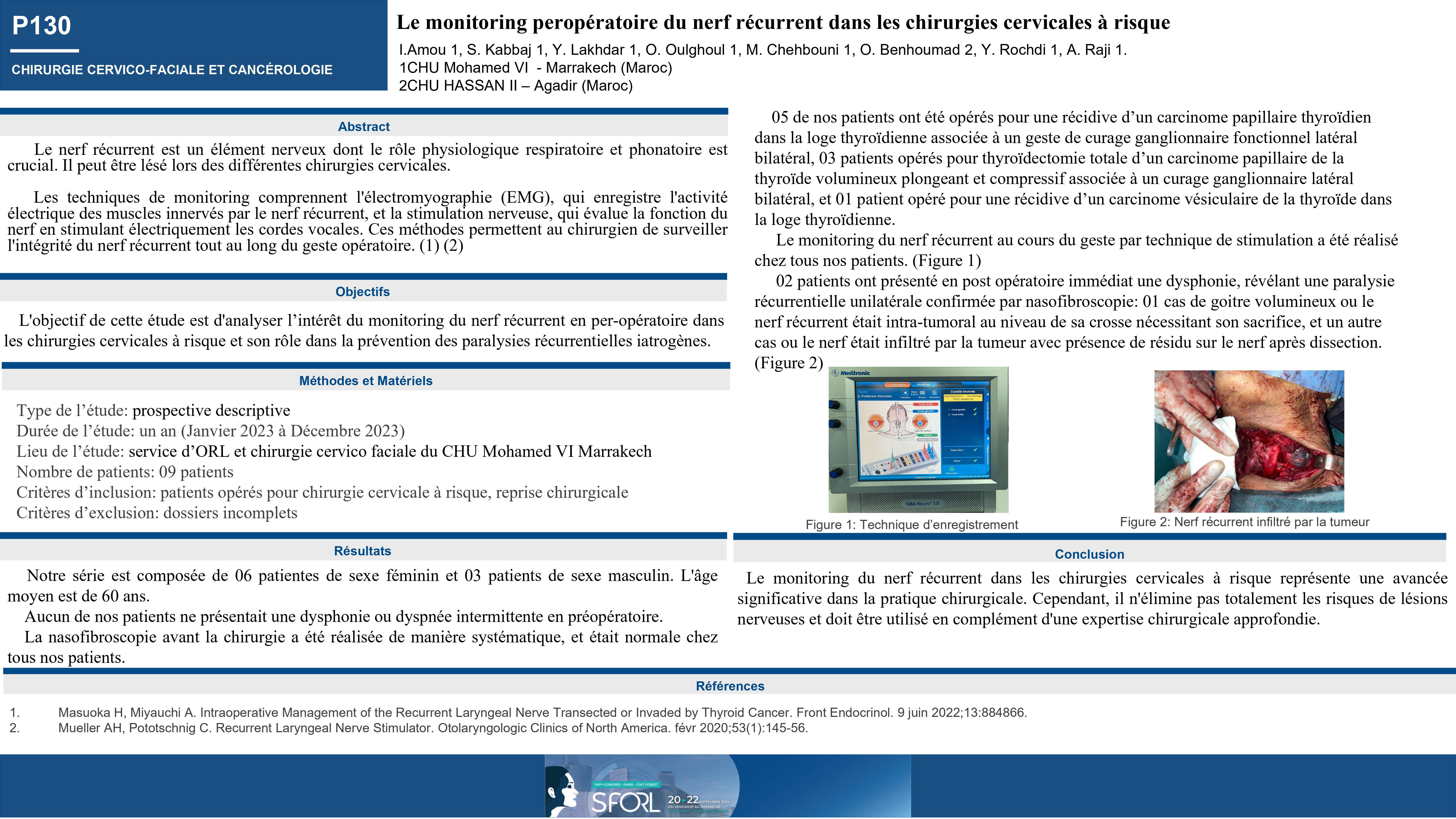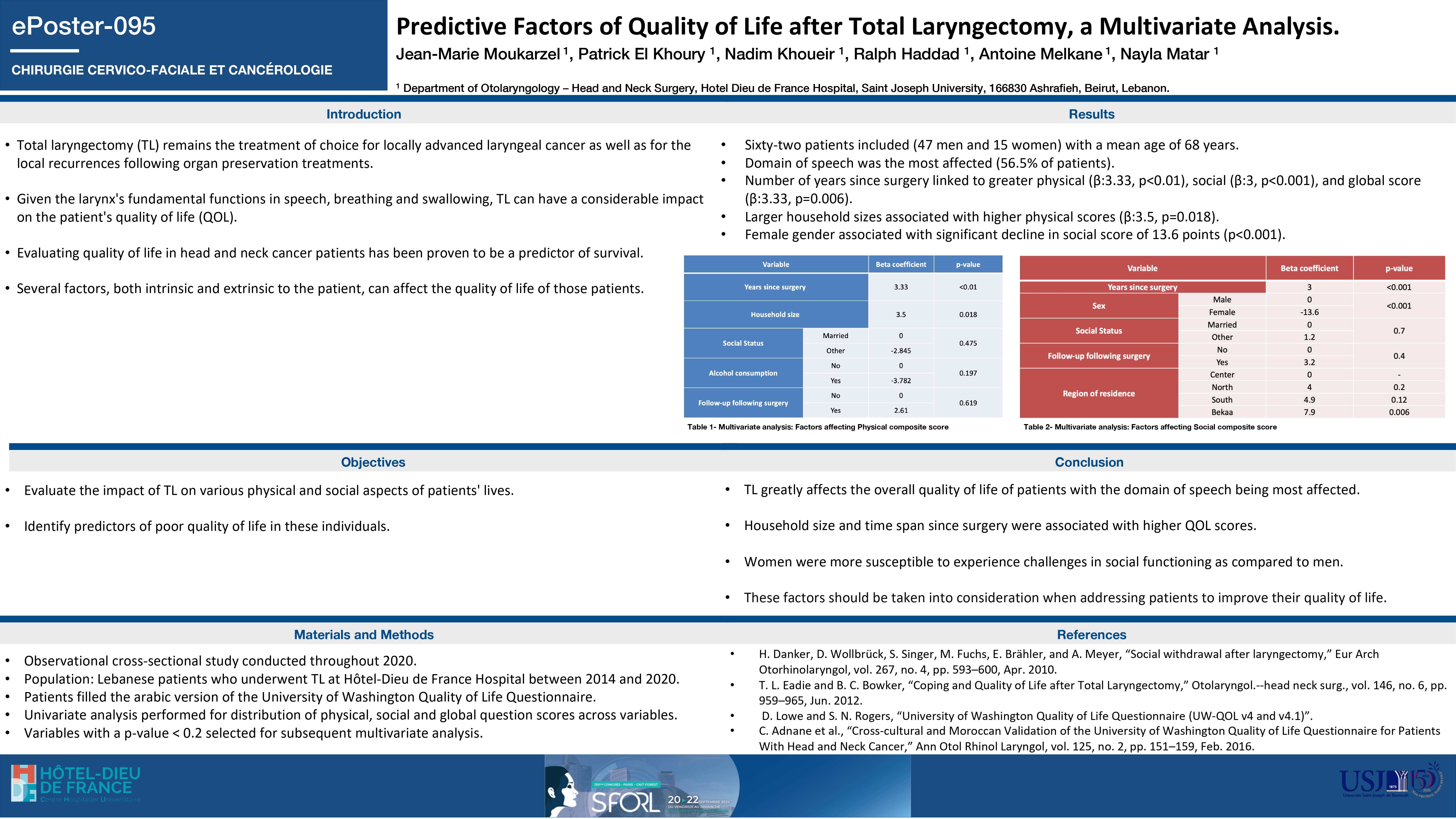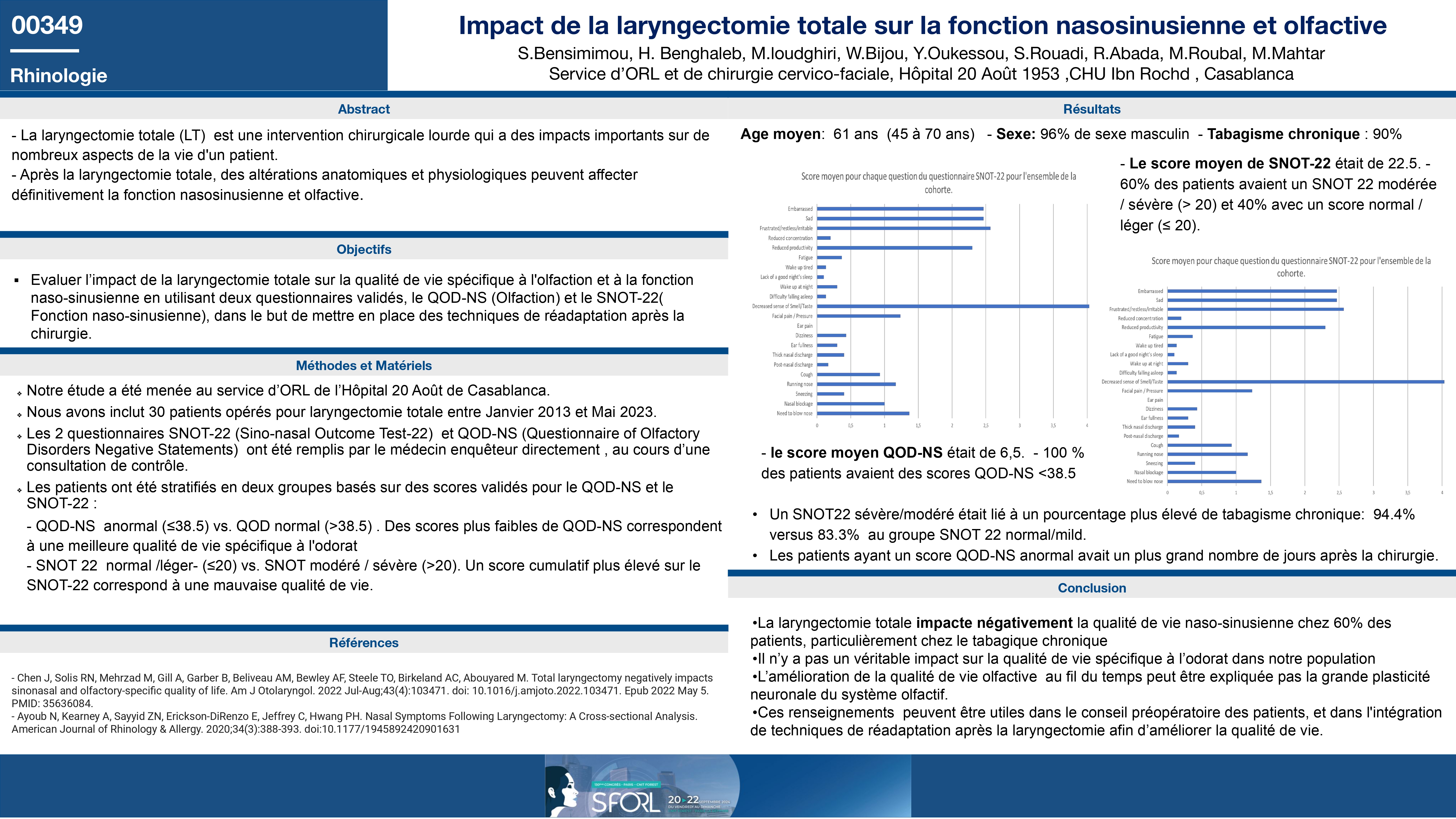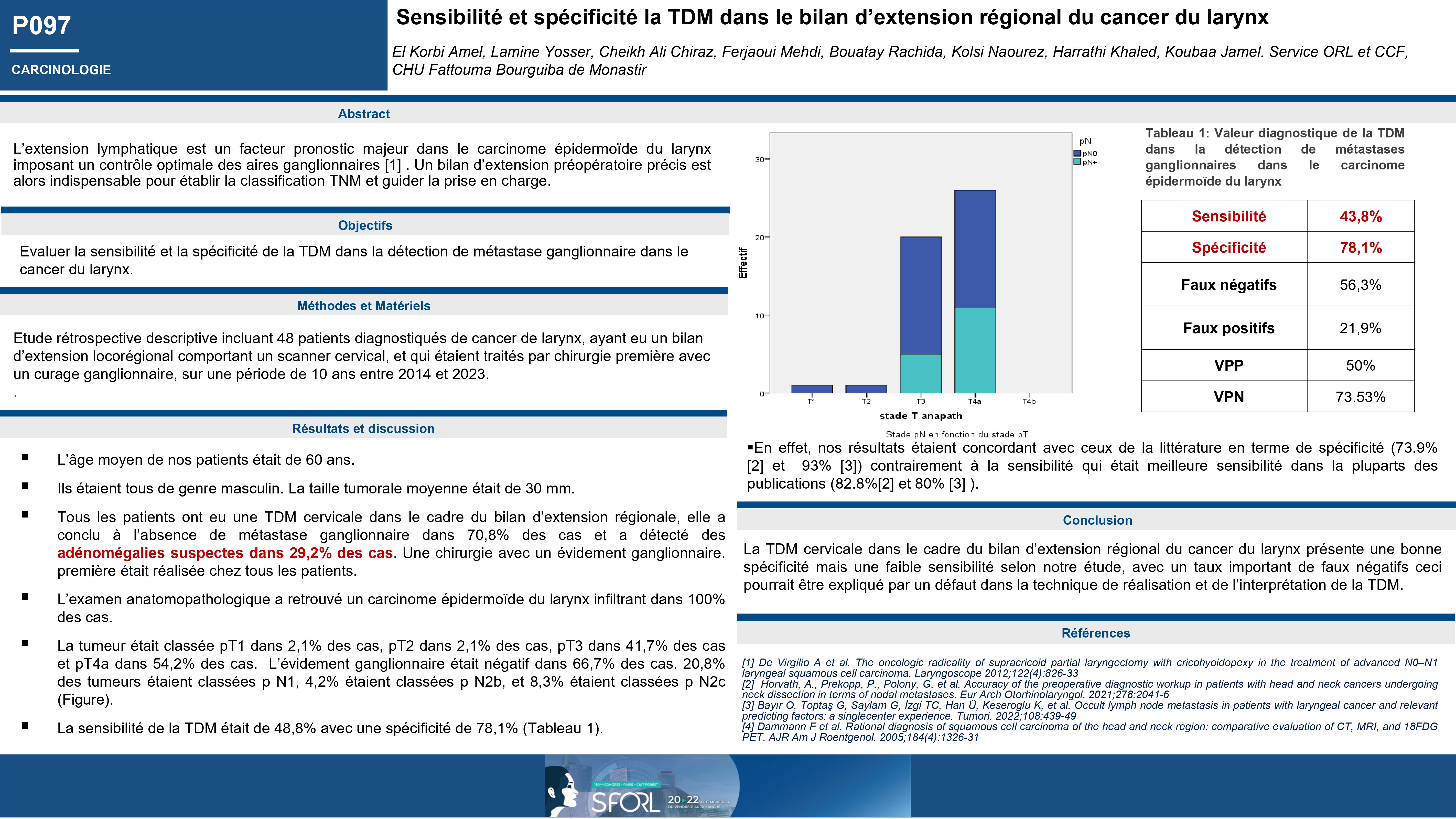 | P032 – Caractéristiques cliniques de la laryngectomie totale chez les sujets âgés | Chirurgie cervico-faciale et Cancérologie | chirurgie-cervico-faciale-et-cancerologie | |