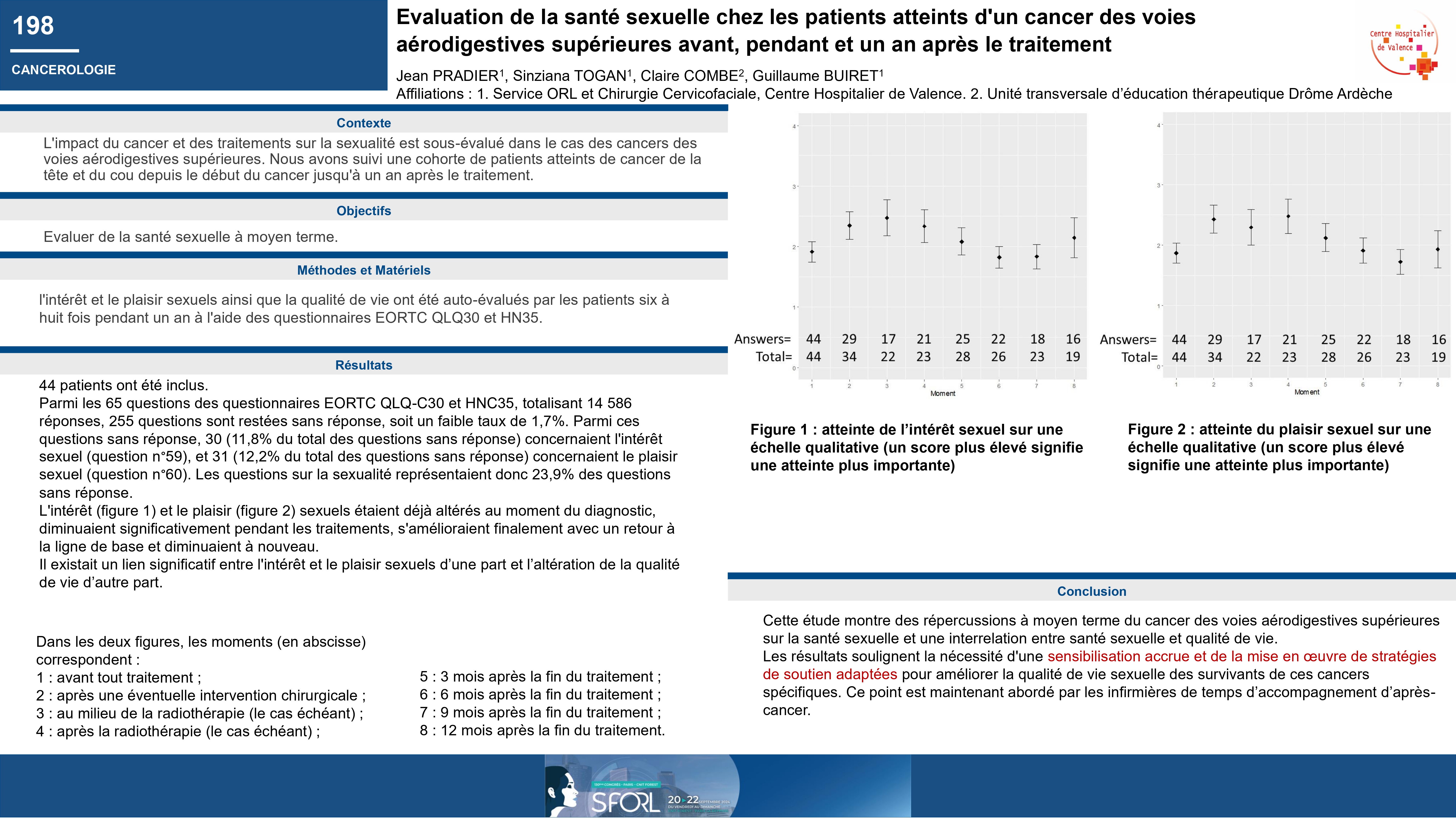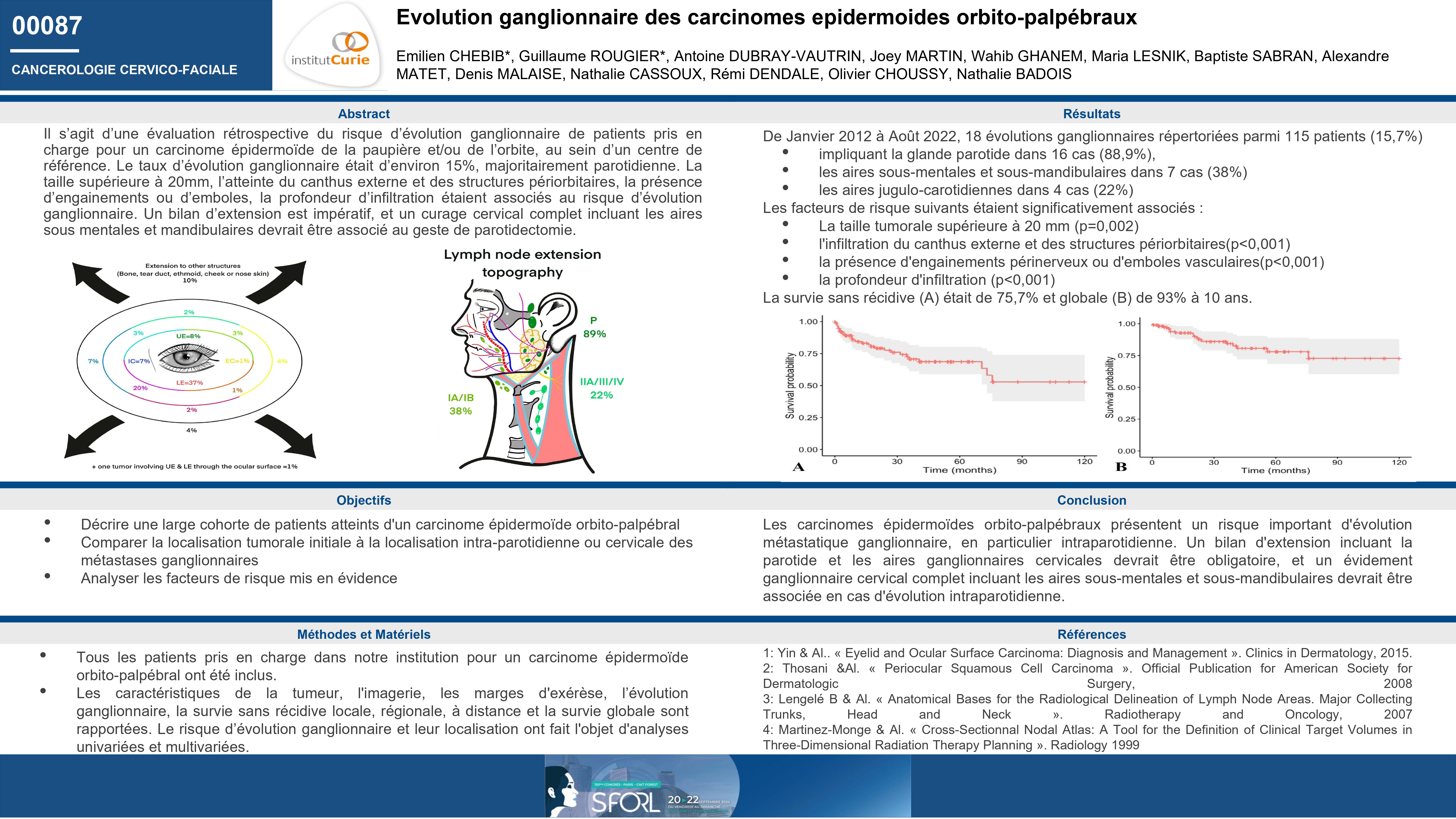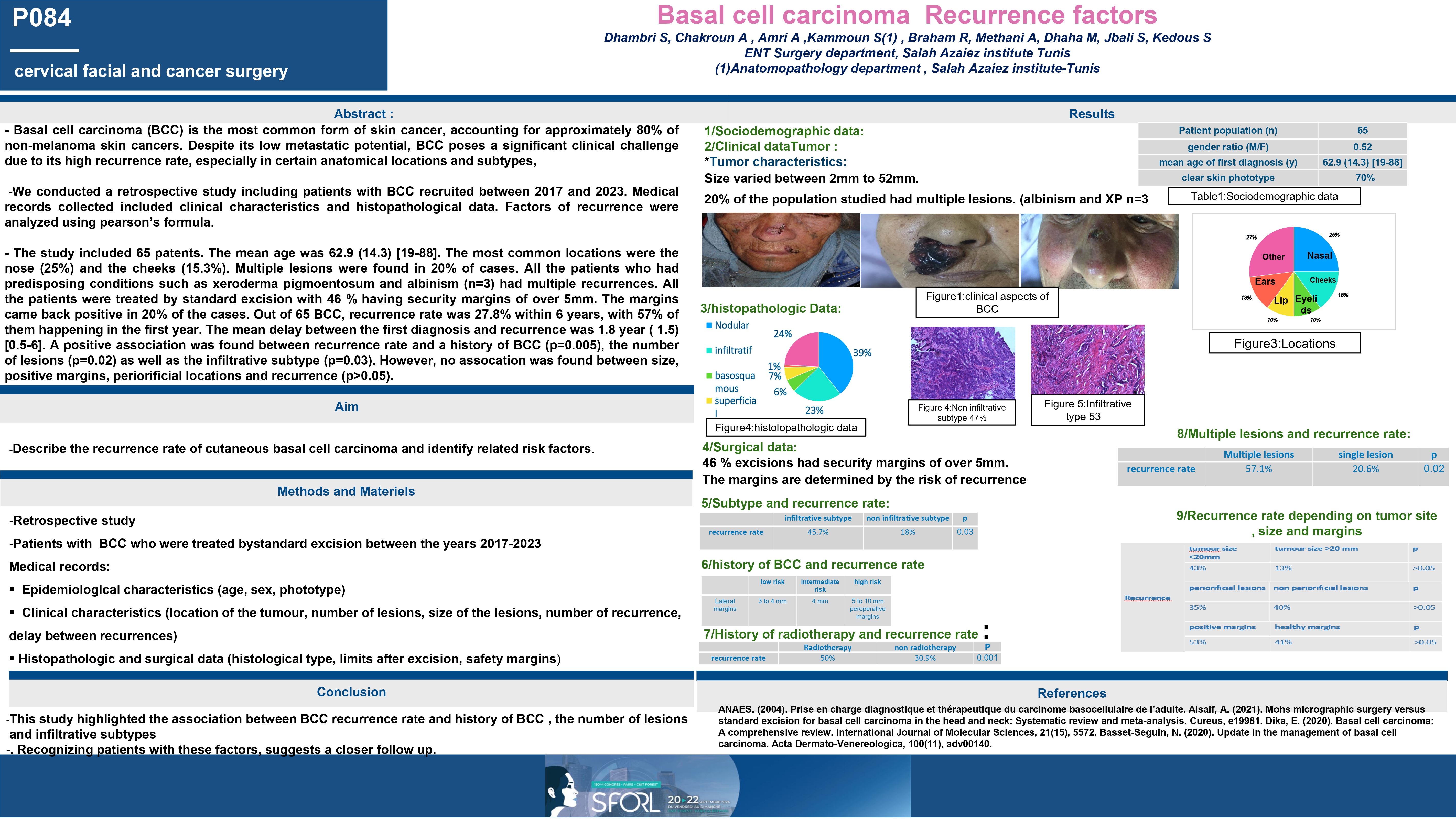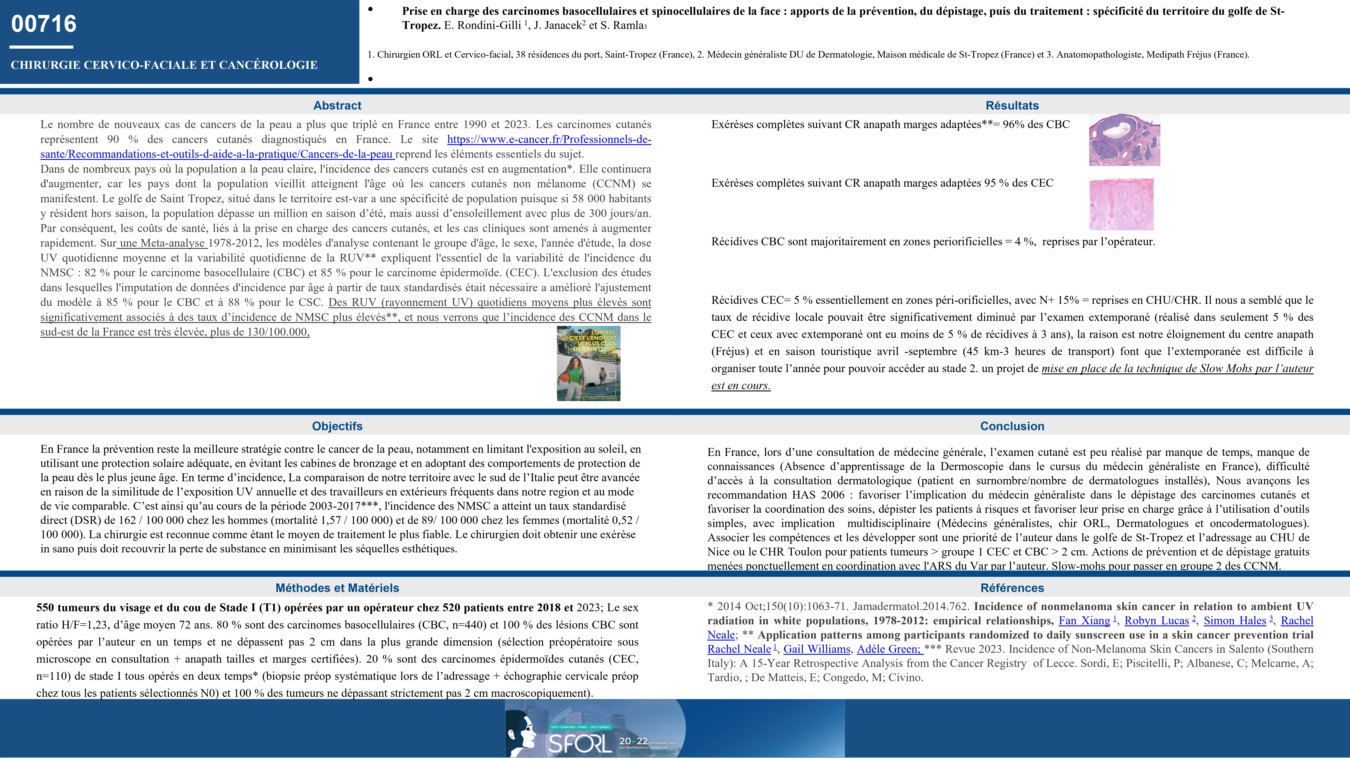| P033 – Prise en charge des carcinomes basocellulaires et spinocellulaires de la face : apports de la prévention, du dépistage, puis du traitement : spécificité du territoire du golfe de St-Tropez et résultats. | Chirurgie cervico-faciale et Cancérologie | chirurgie-cervico-faciale-et-cancerologie | |