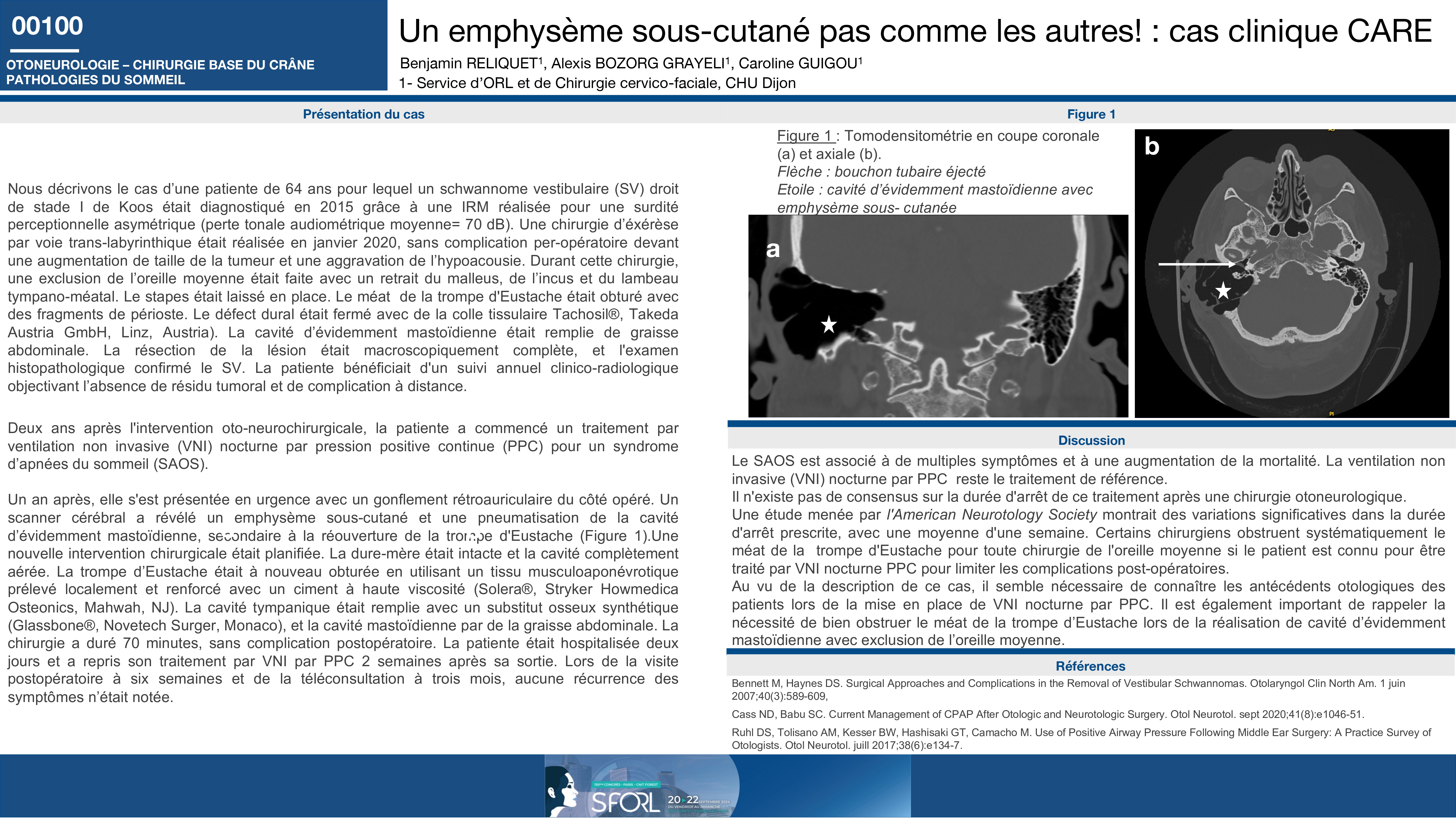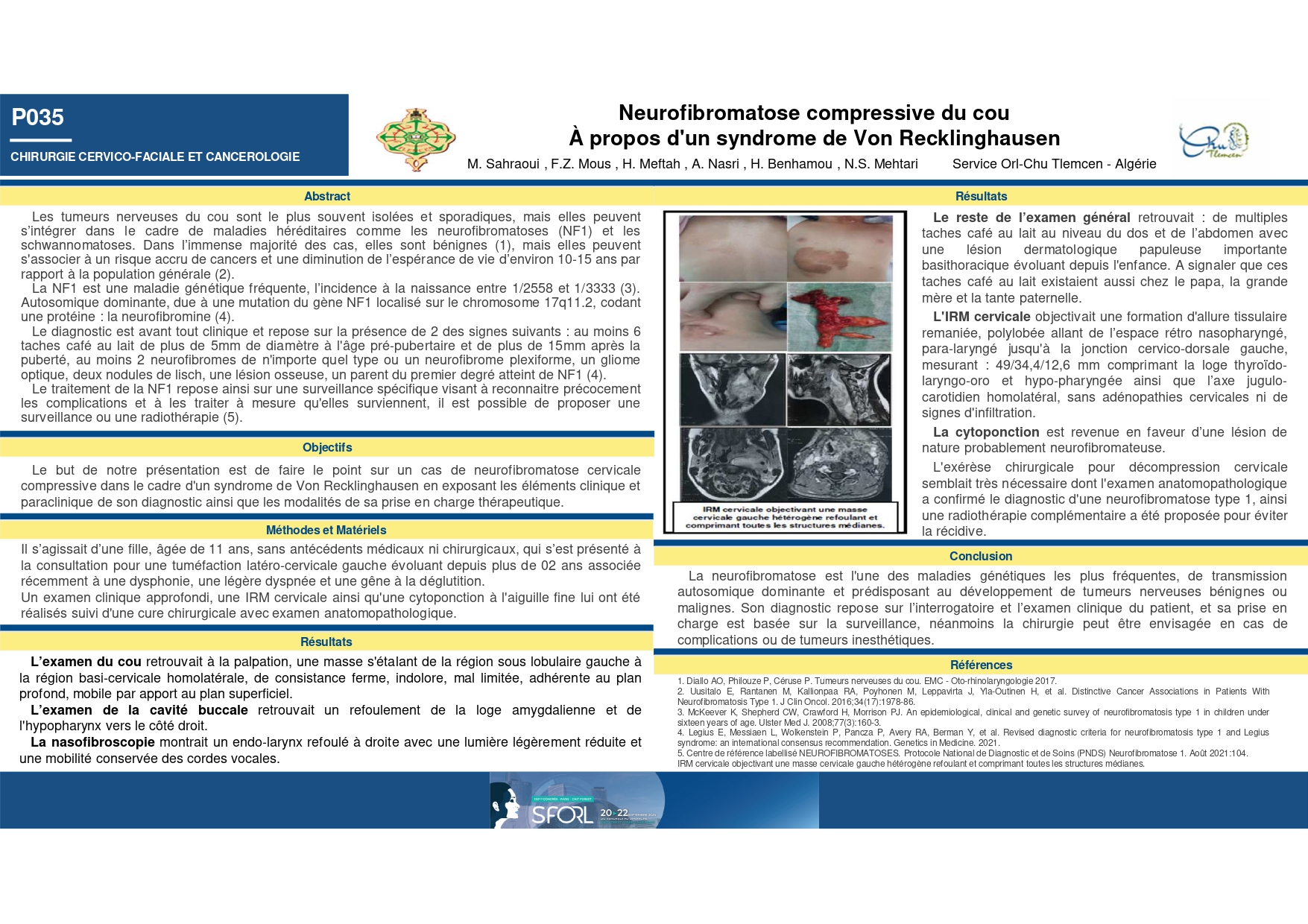 | P035 – Neurofibromatose compressive du cou : A propos d’un syndrome de Von Recklinghausen | Chirurgie cervico-faciale et Cancérologie | chirurgie-cervico-faciale-et-cancerologie | |