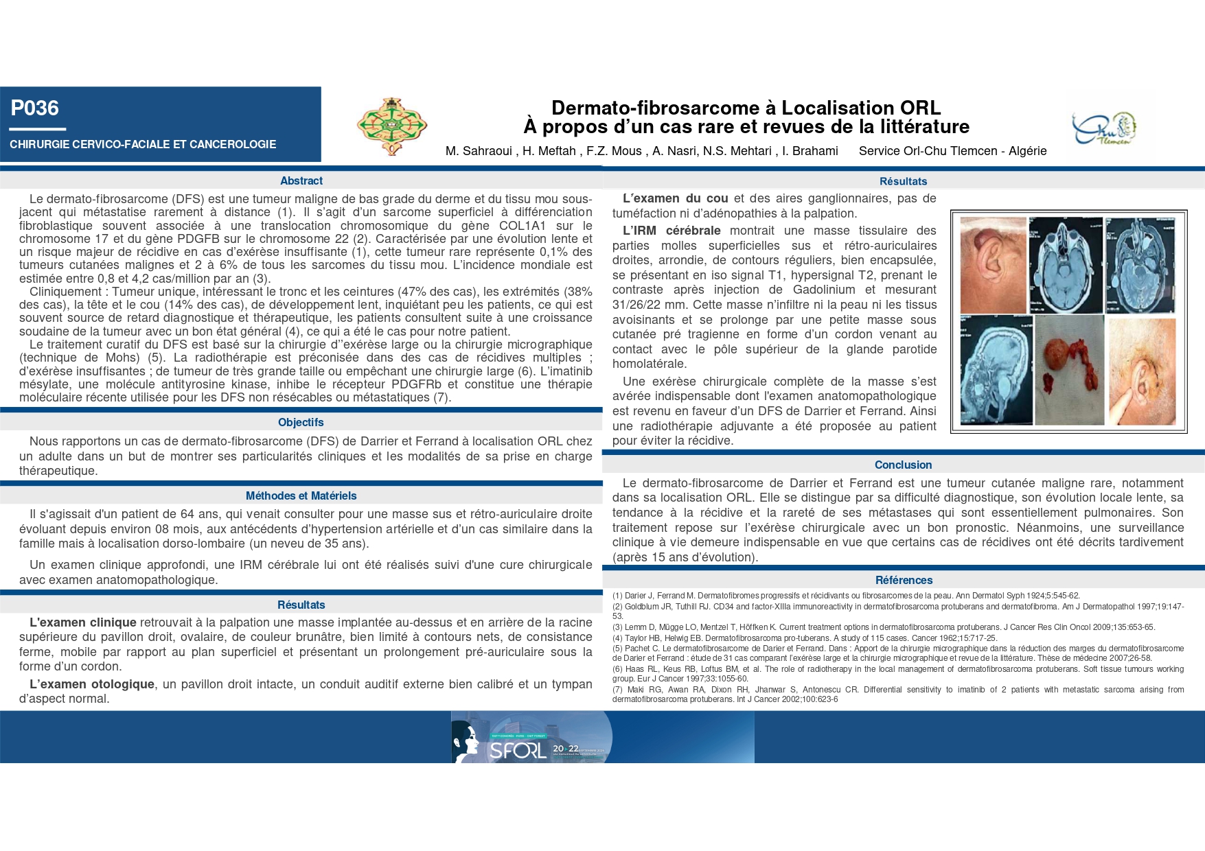 | P036 – Dermato-fibrosarcome à Localisation ORL : À propos d’un cas rare et revues de la littérature | Chirurgie cervico-faciale et Cancérologie | chirurgie-cervico-faciale-et-cancerologie | |