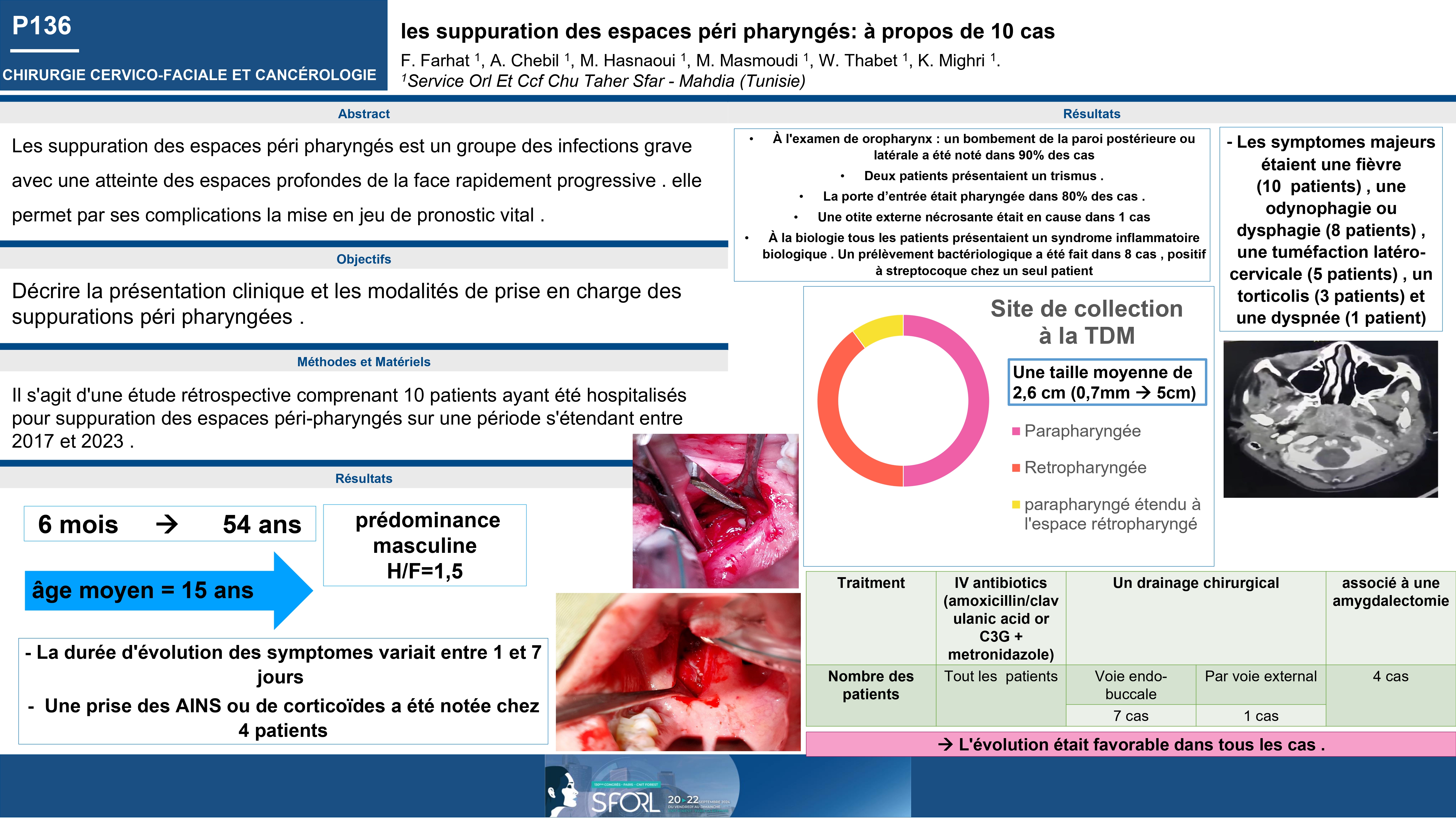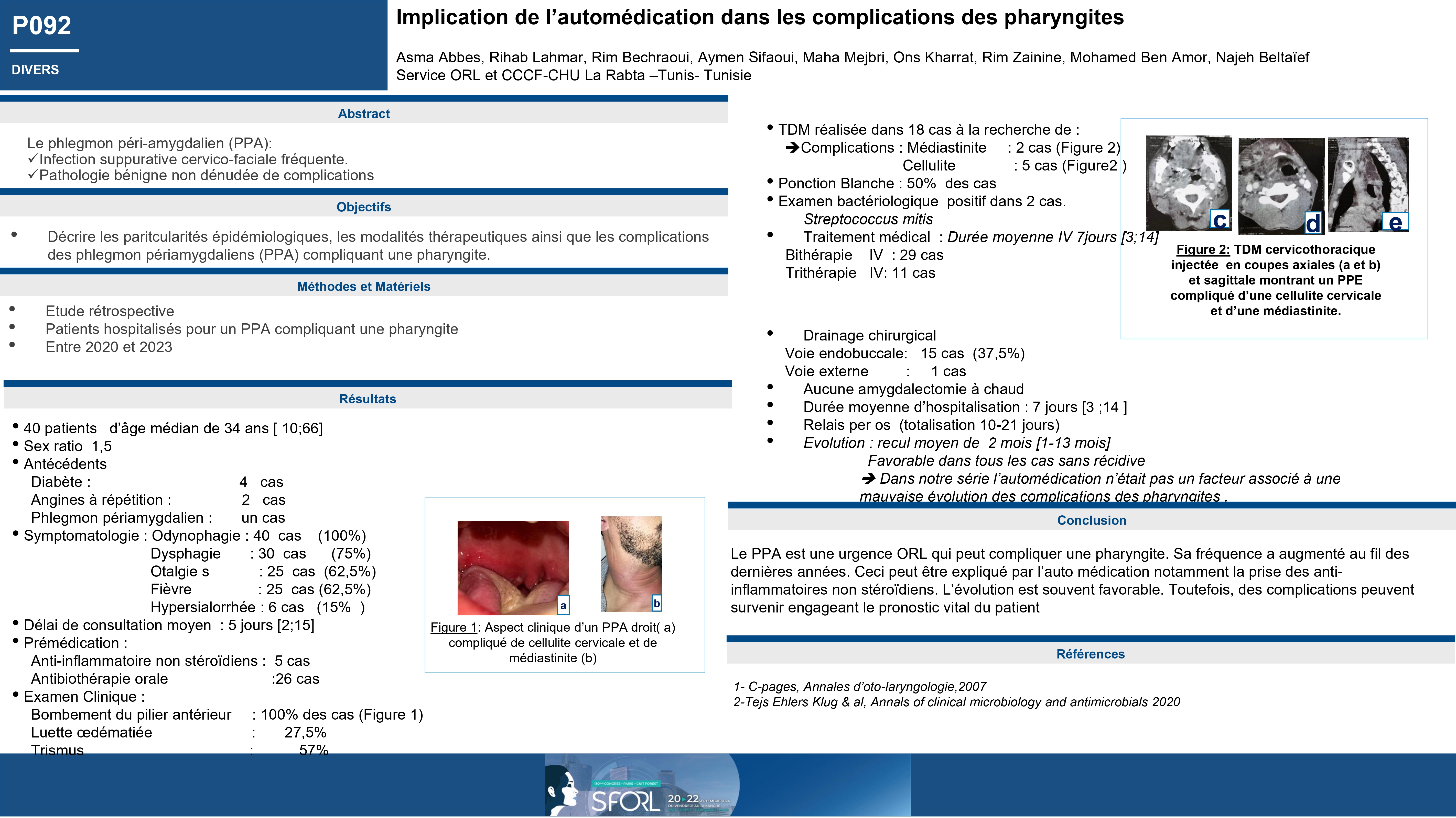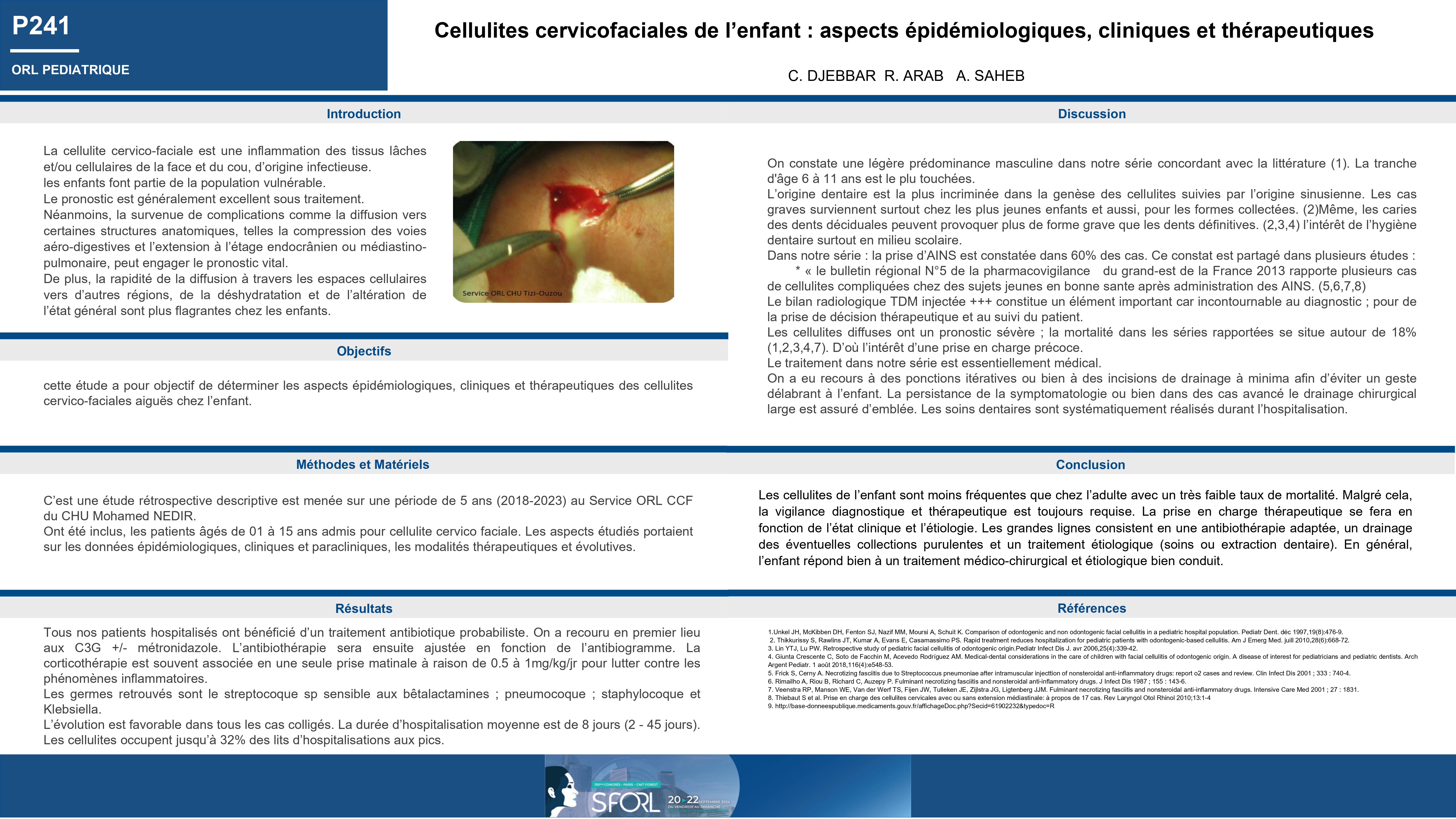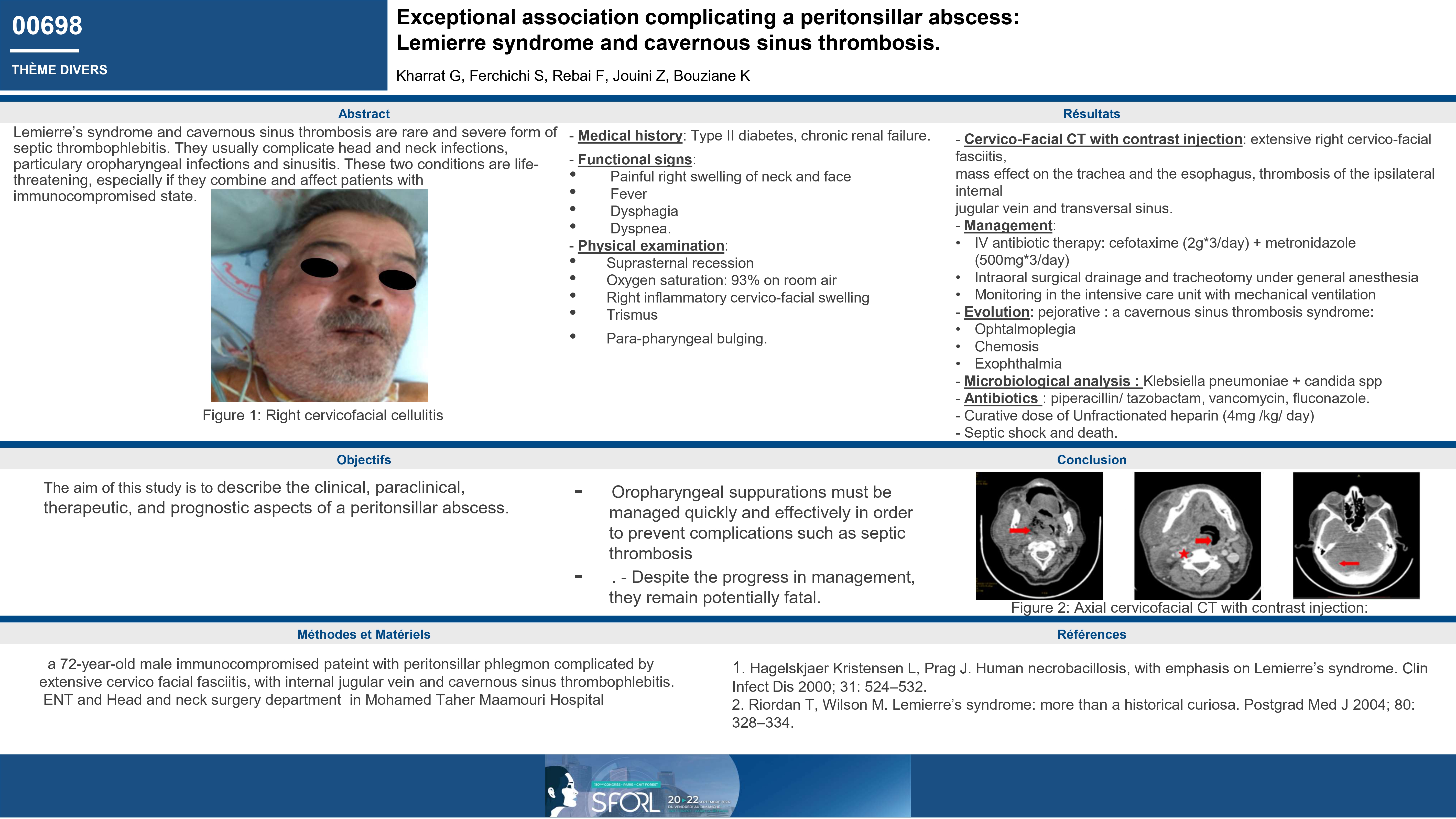 | P040 – Exceptional association complicating a peritonsillar abscess: Lemierre syndrome and cavernous sinus thrombosis | Chirurgie cervico-faciale et Cancérologie | chirurgie-cervico-faciale-et-cancerologie | |