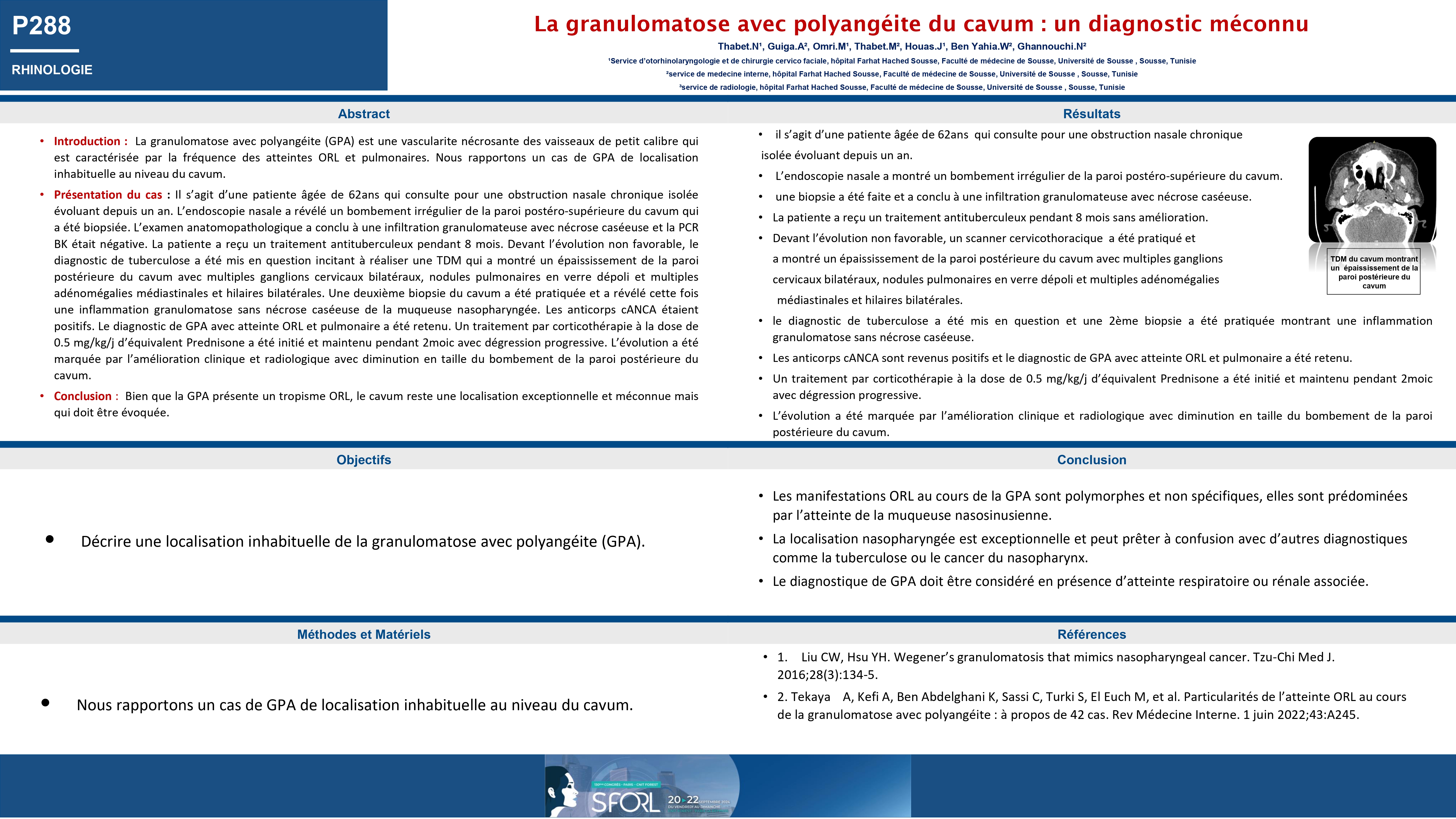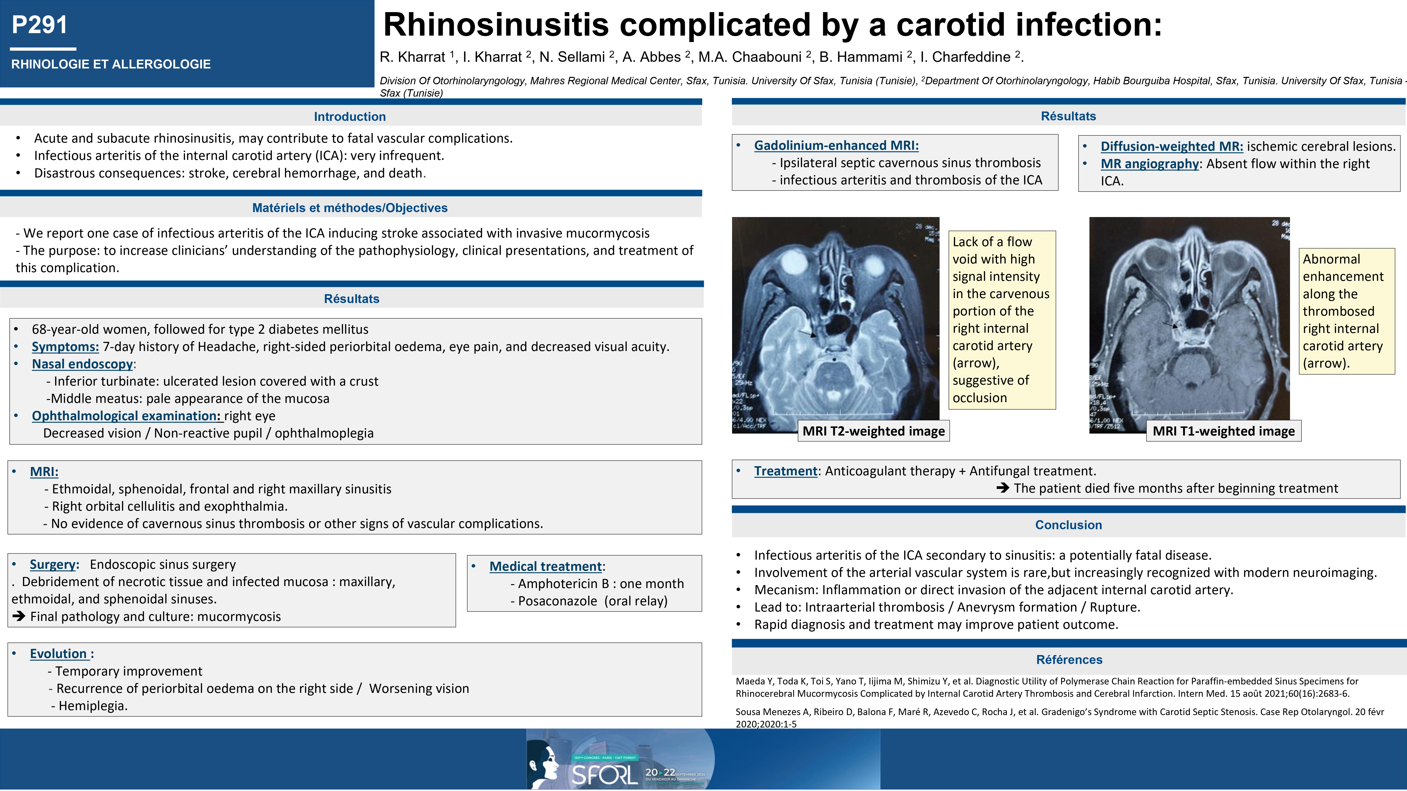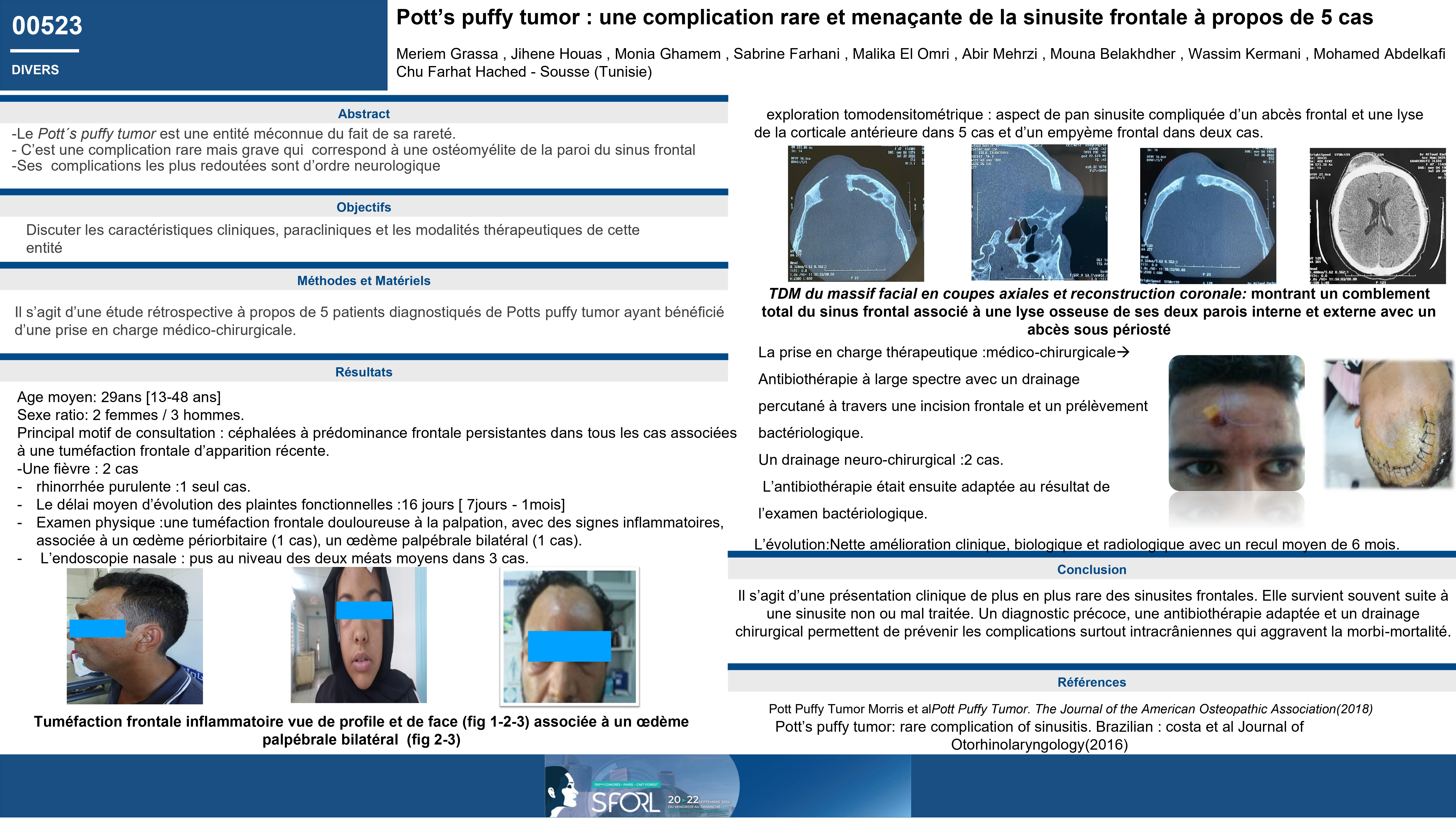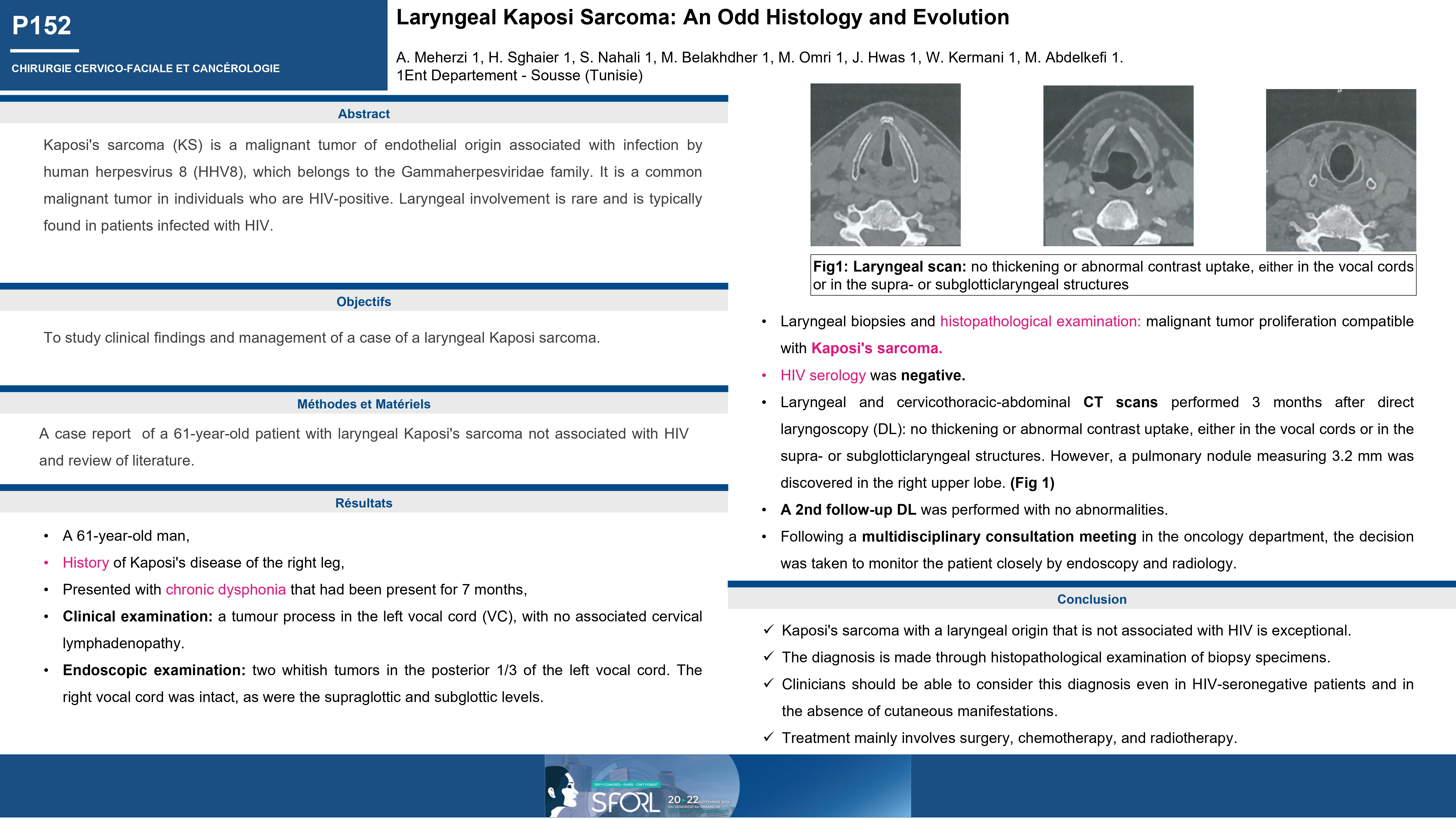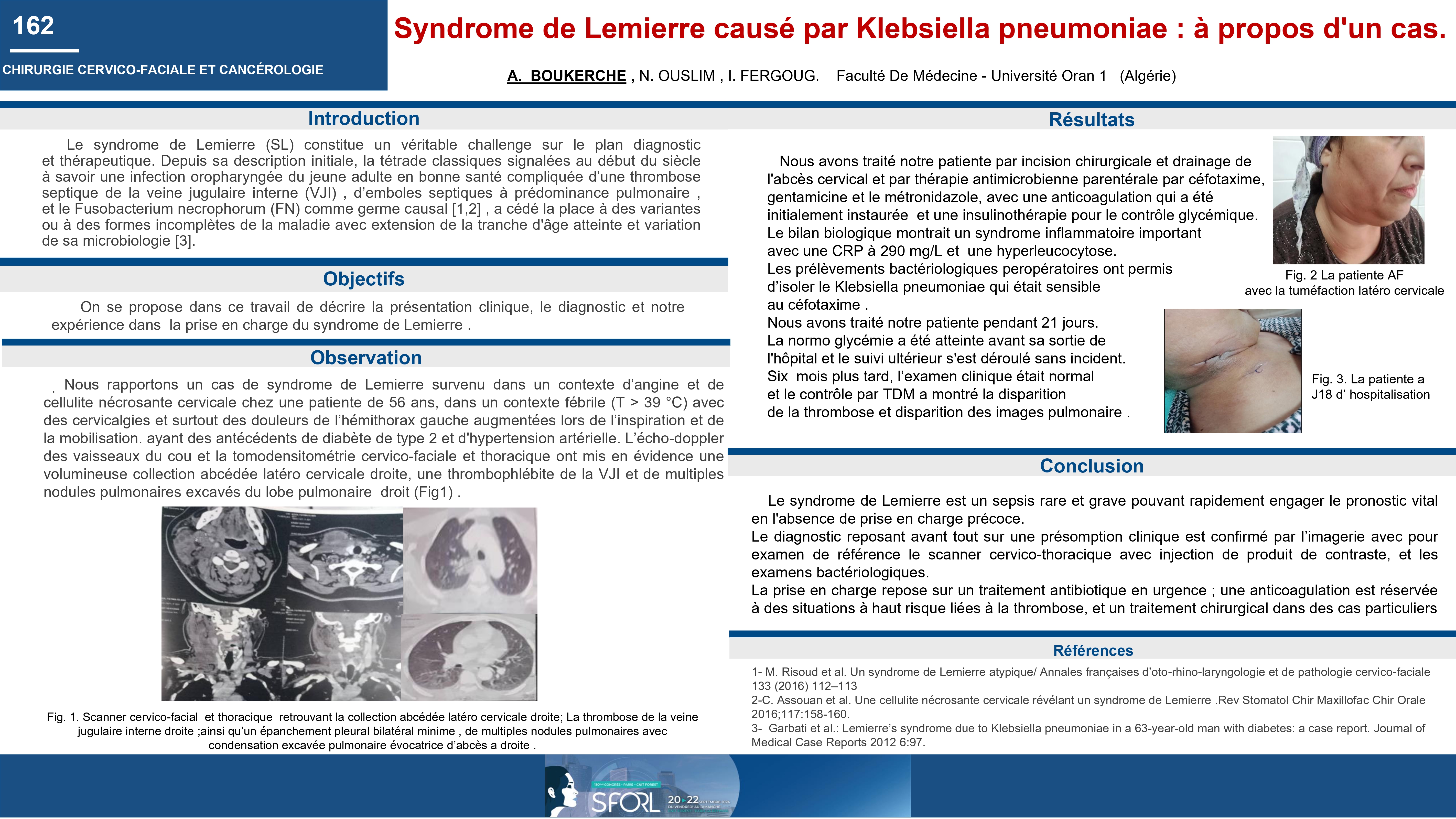| P040 – Exceptional association complicating a peritonsillar abscess: Lemierre syndrome and cavernous sinus thrombosis | Chirurgie cervico-faciale et Cancérologie | chirurgie-cervico-faciale-et-cancerologie | |