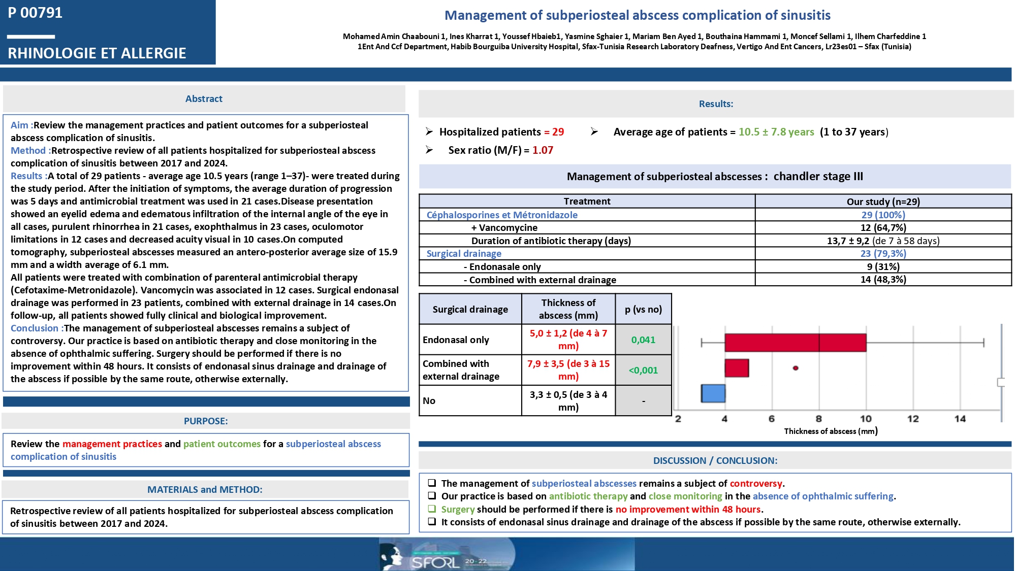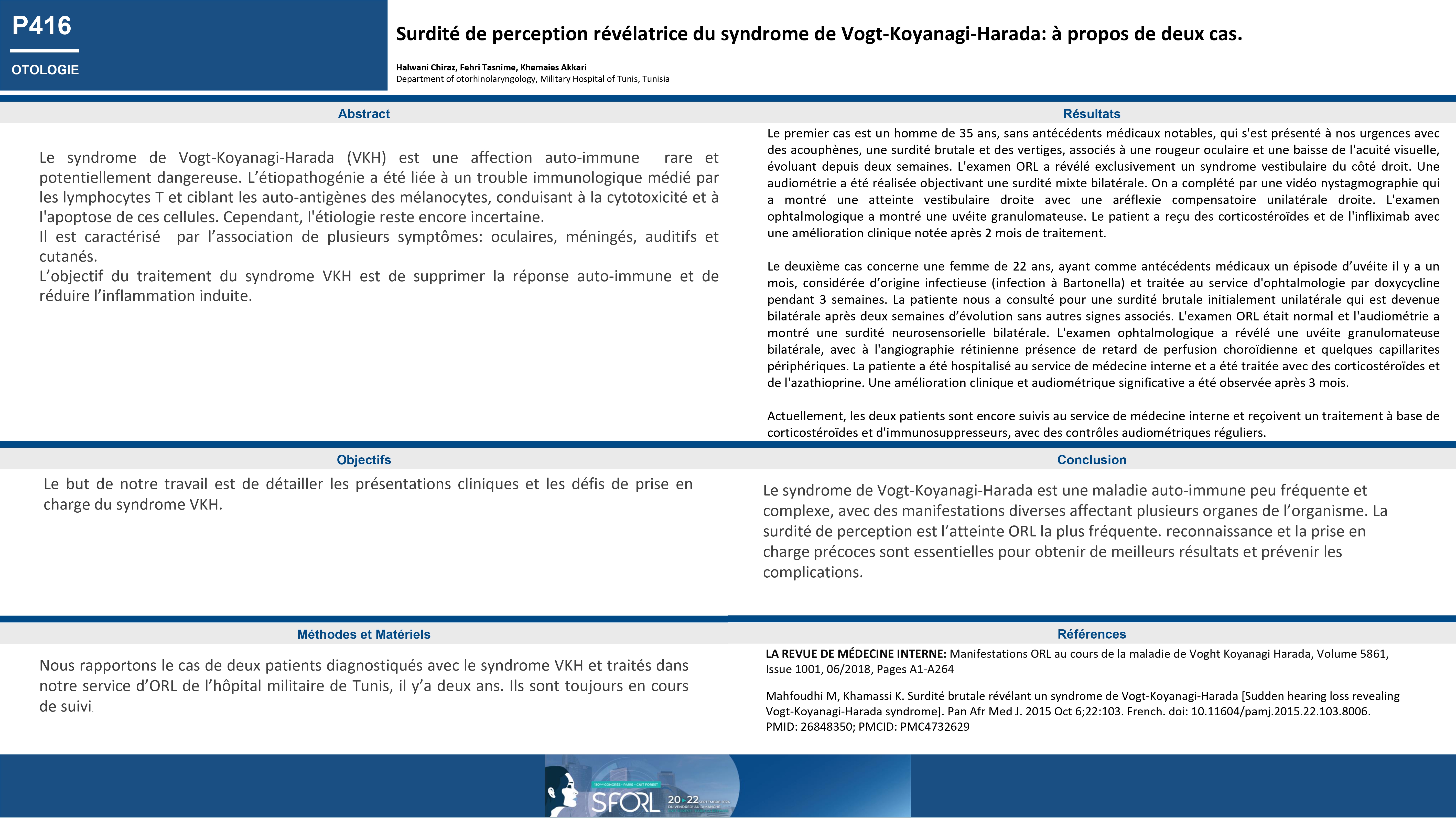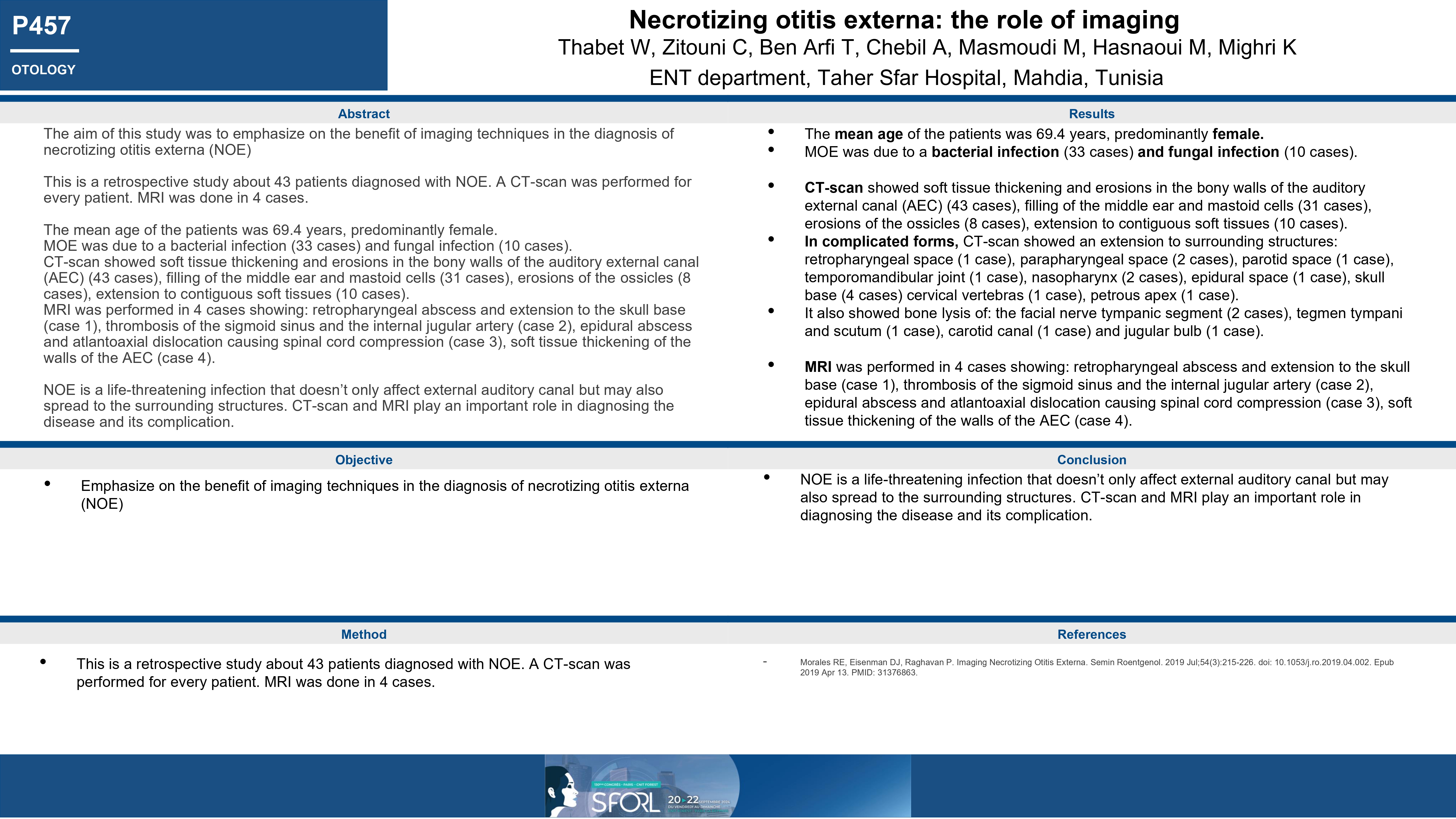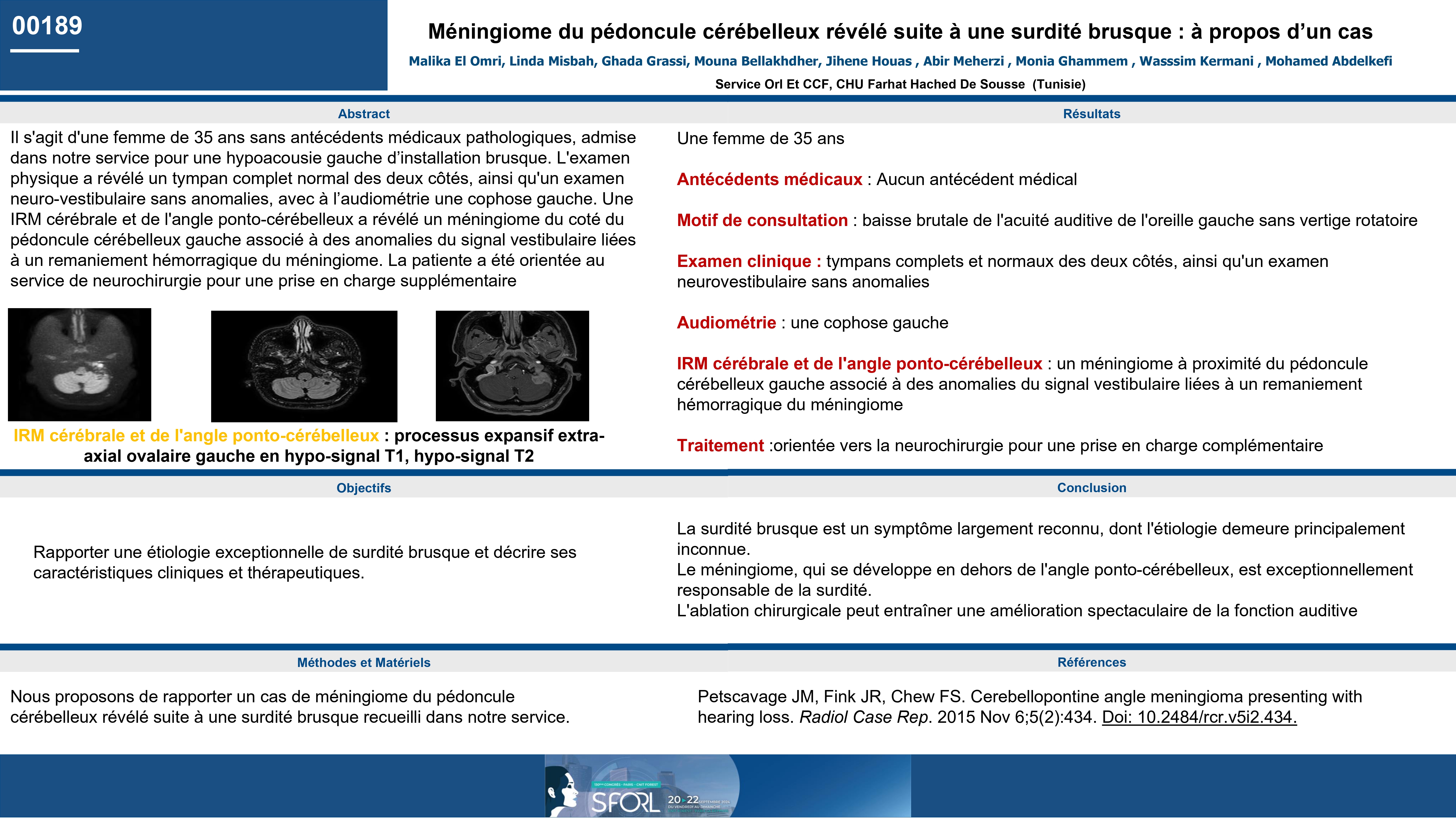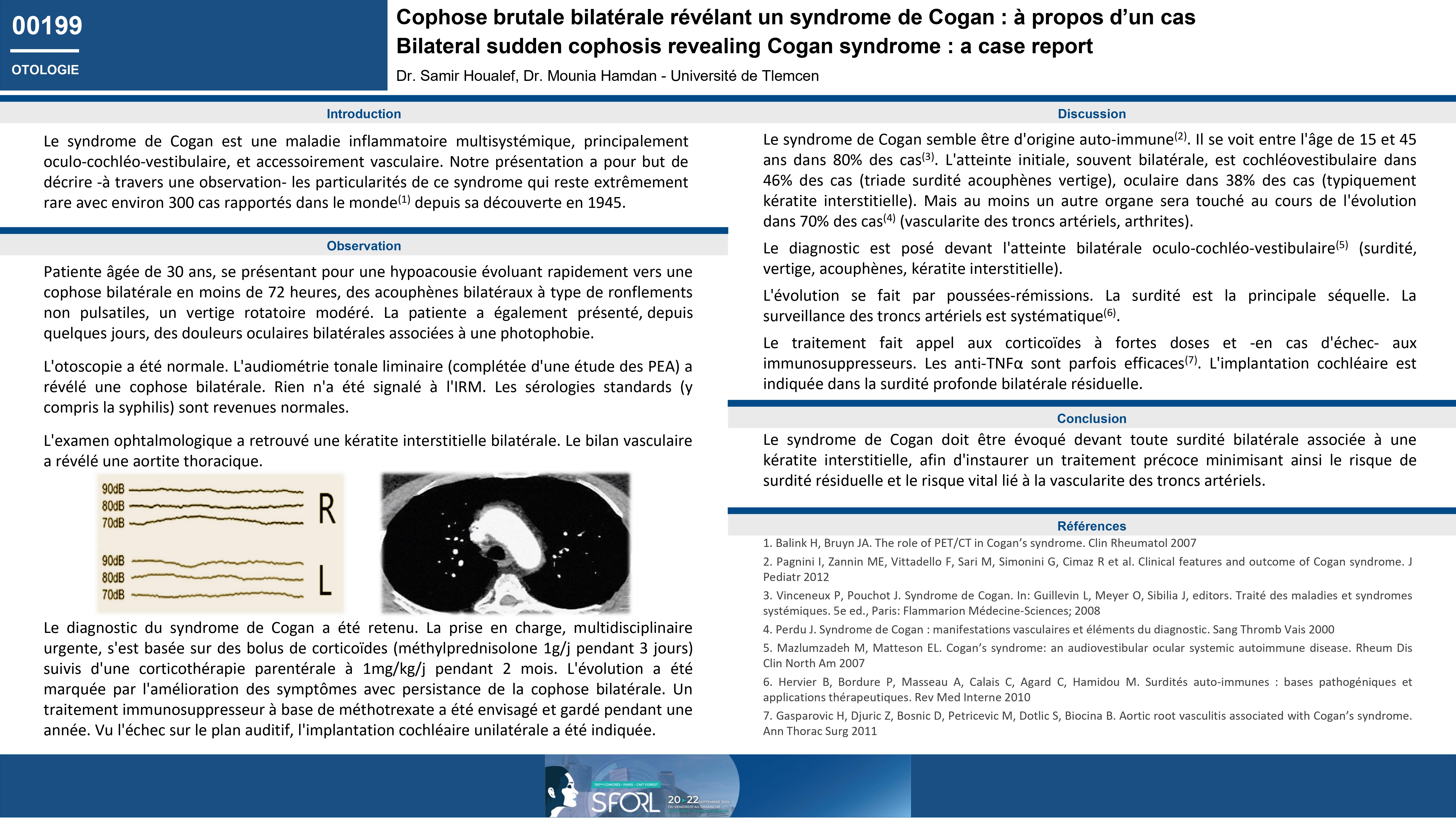 | P040 – Exceptional association complicating a peritonsillar abscess: Lemierre syndrome and cavernous sinus thrombosis | Chirurgie cervico-faciale et Cancérologie | chirurgie-cervico-faciale-et-cancerologie | |