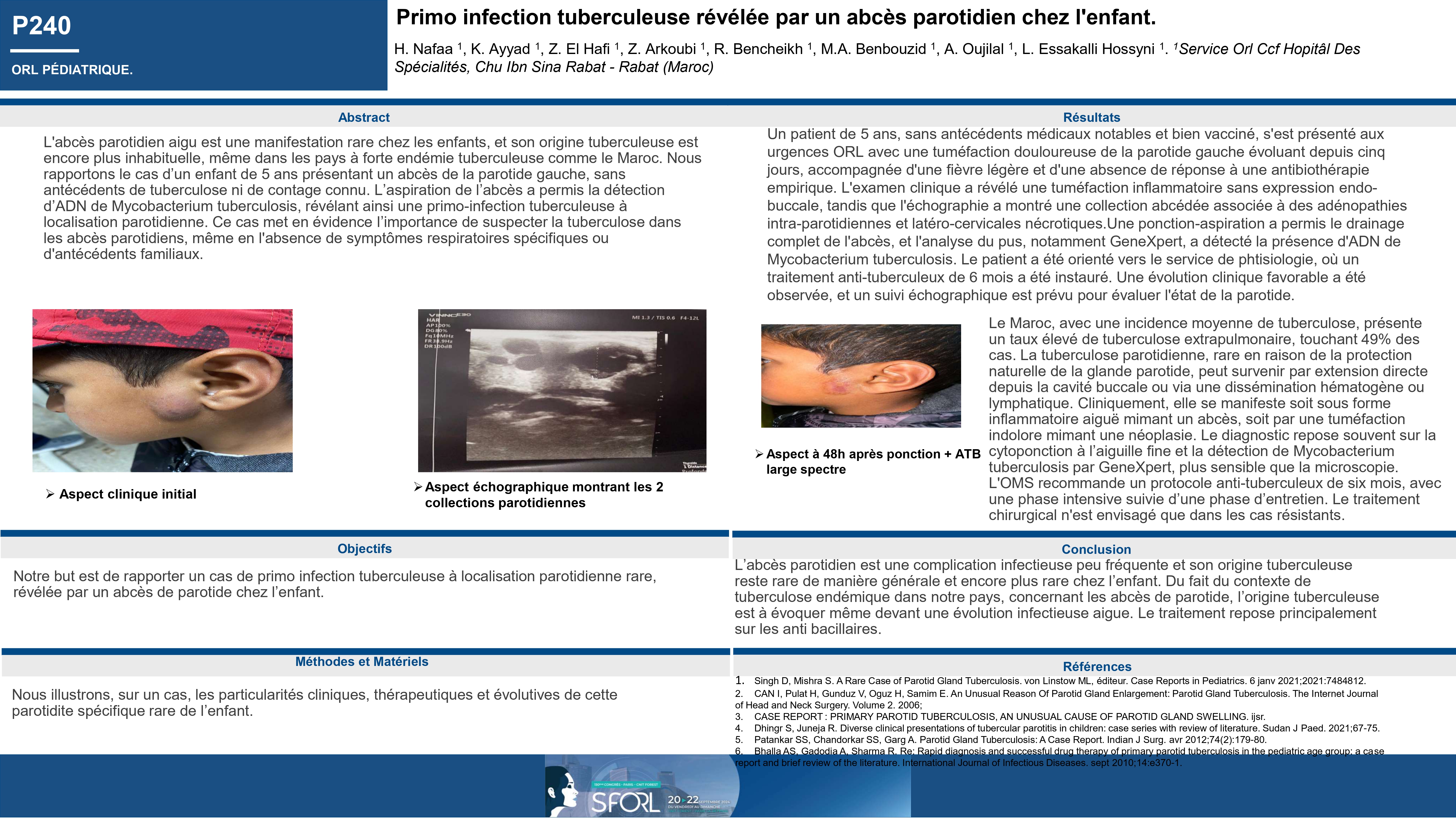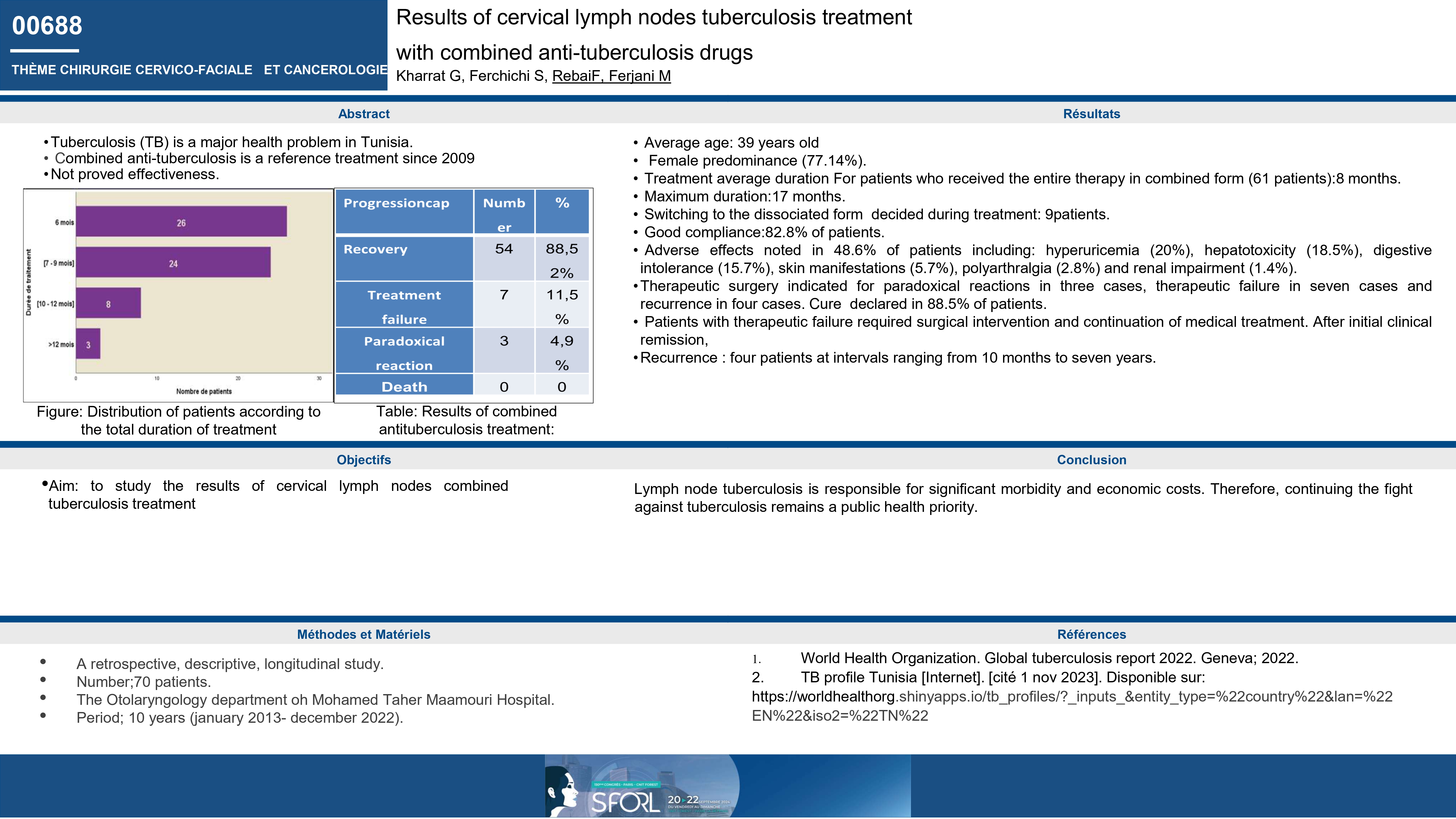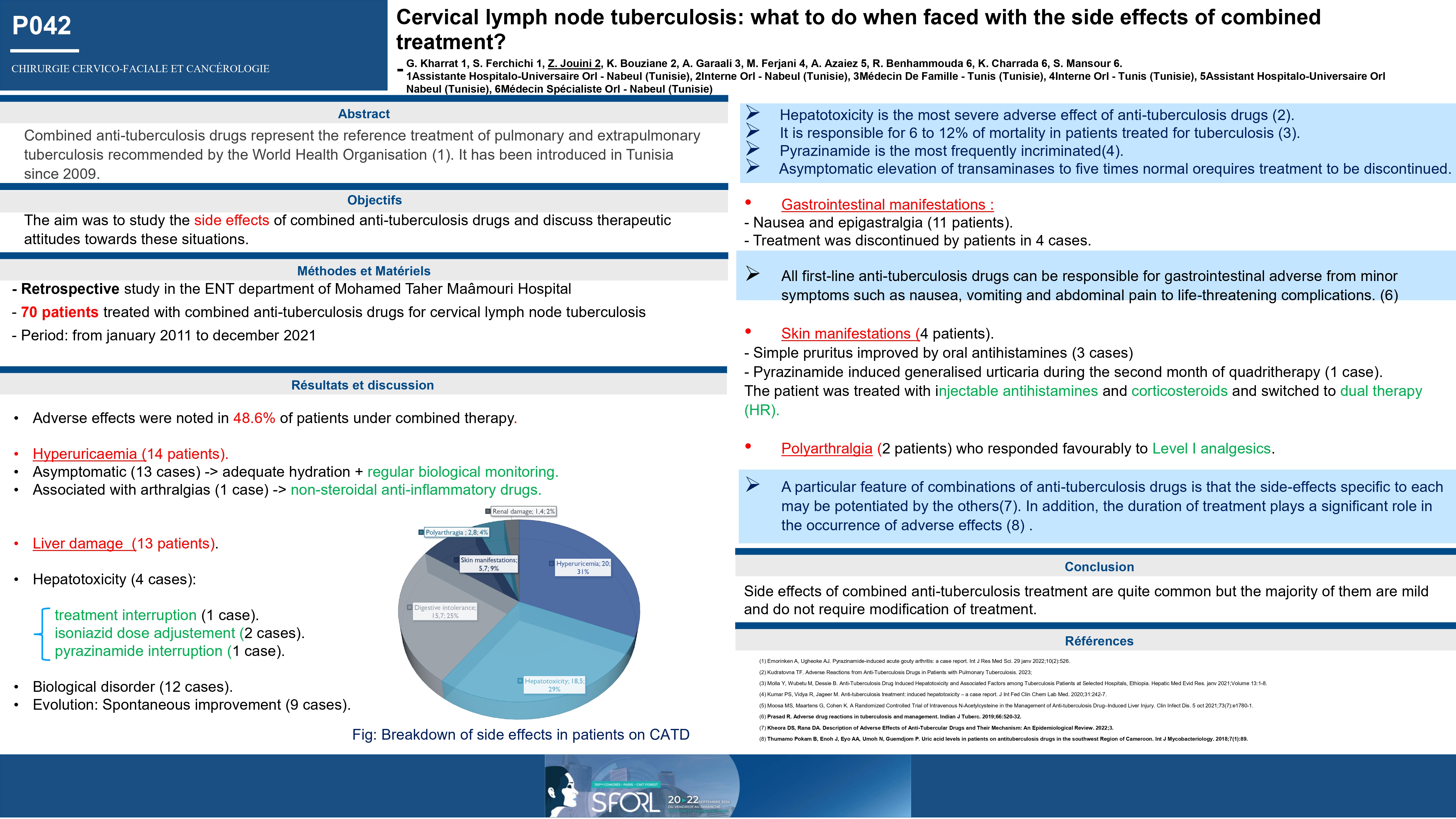 | P042 – Cervical lymph node tuberculosis: what to do when faced with the side effects of combined treatment? | Chirurgie cervico-faciale et Cancérologie | chirurgie-cervico-faciale-et-cancerologie | |