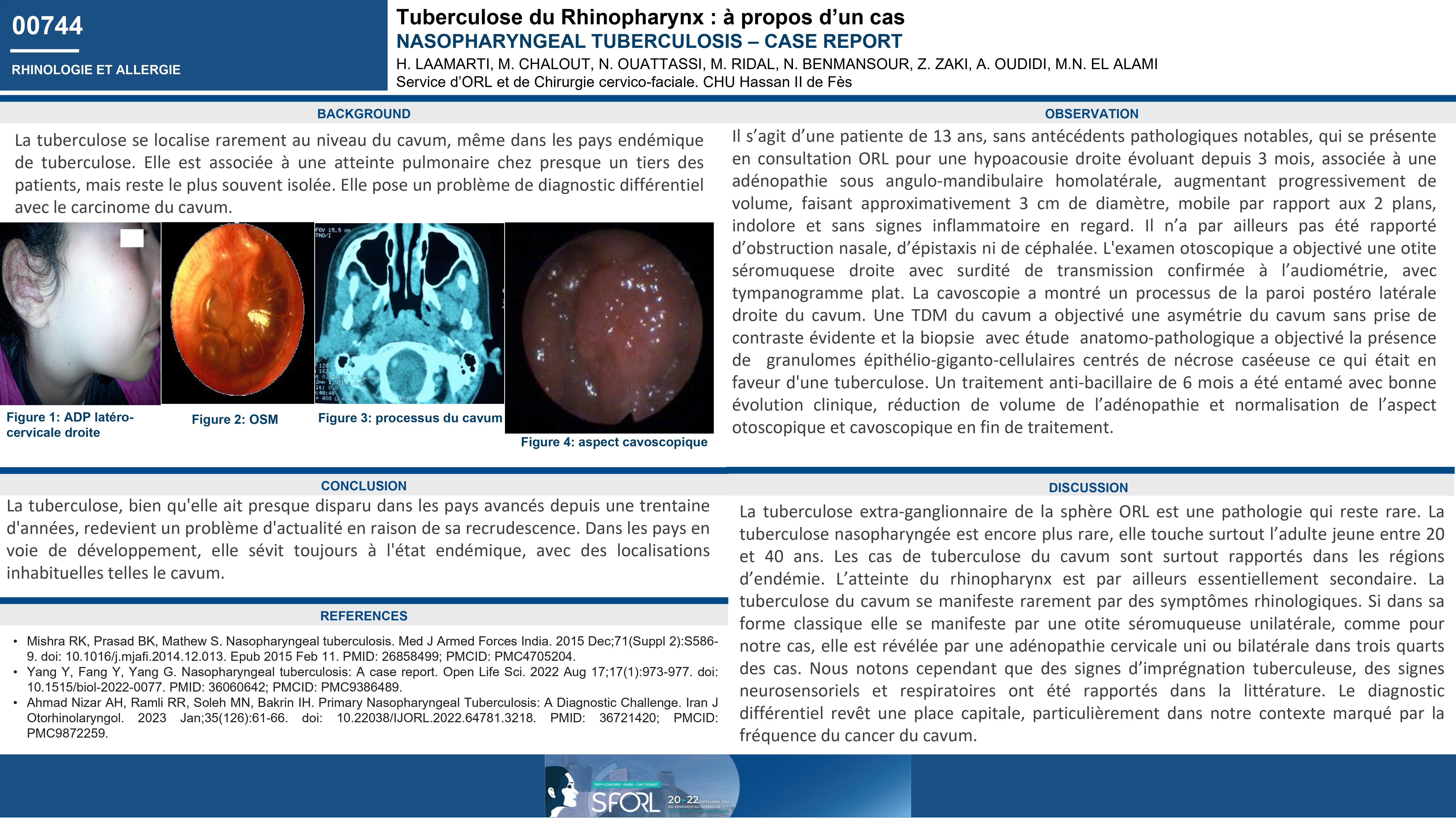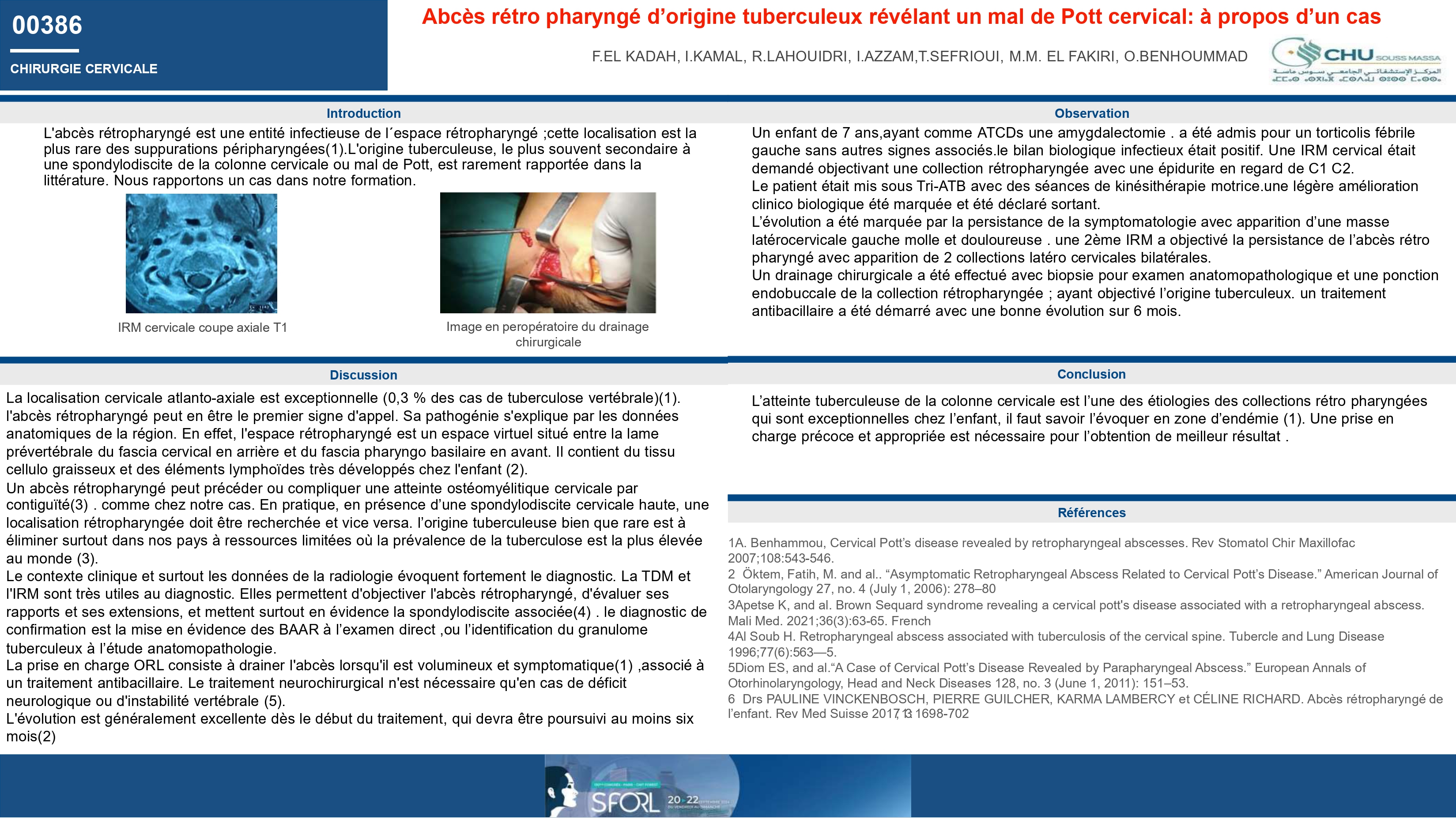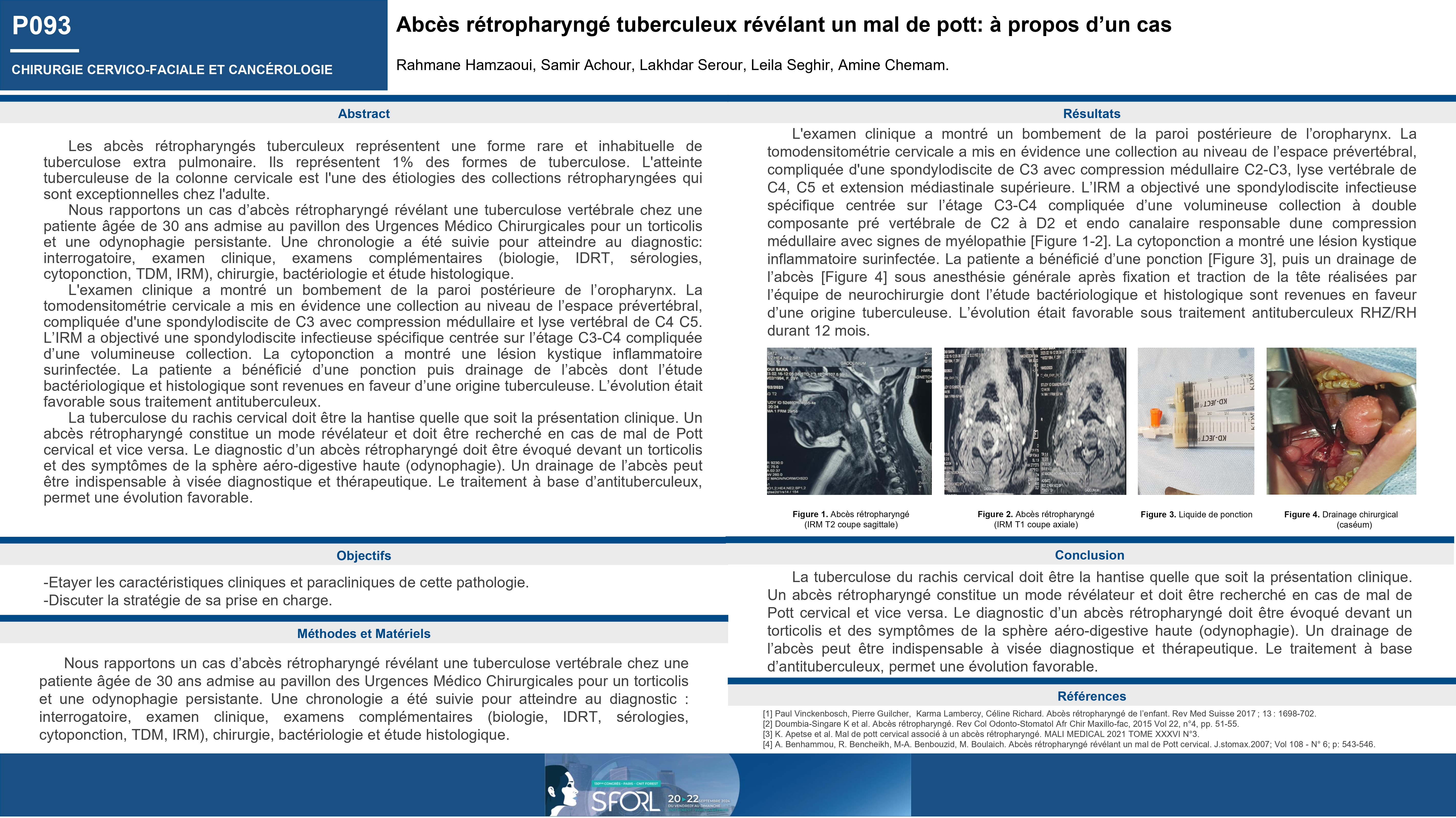 | P042 – Cervical lymph node tuberculosis: what to do when faced with the side effects of combined treatment? | Chirurgie cervico-faciale et Cancérologie | chirurgie-cervico-faciale-et-cancerologie | |