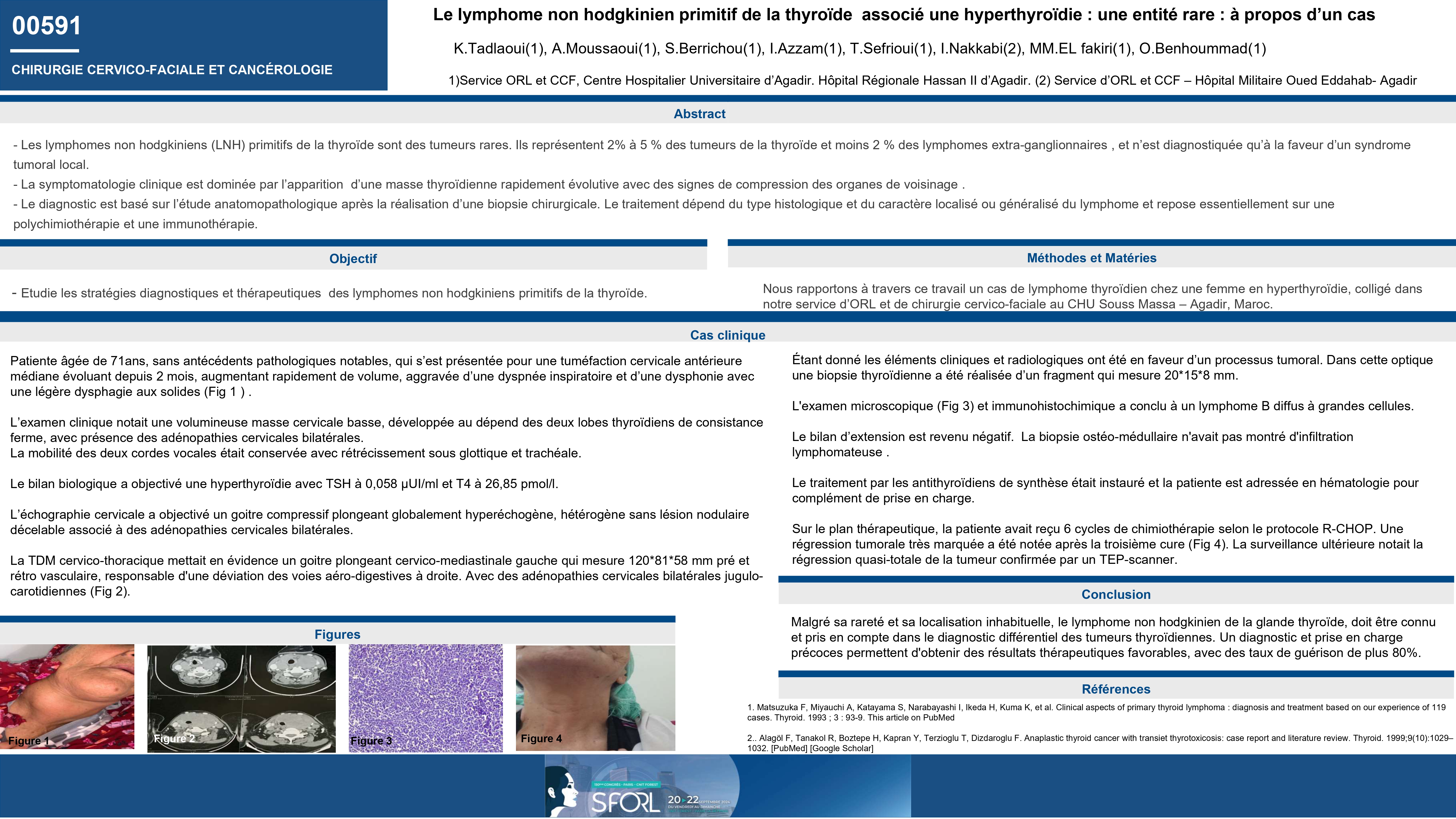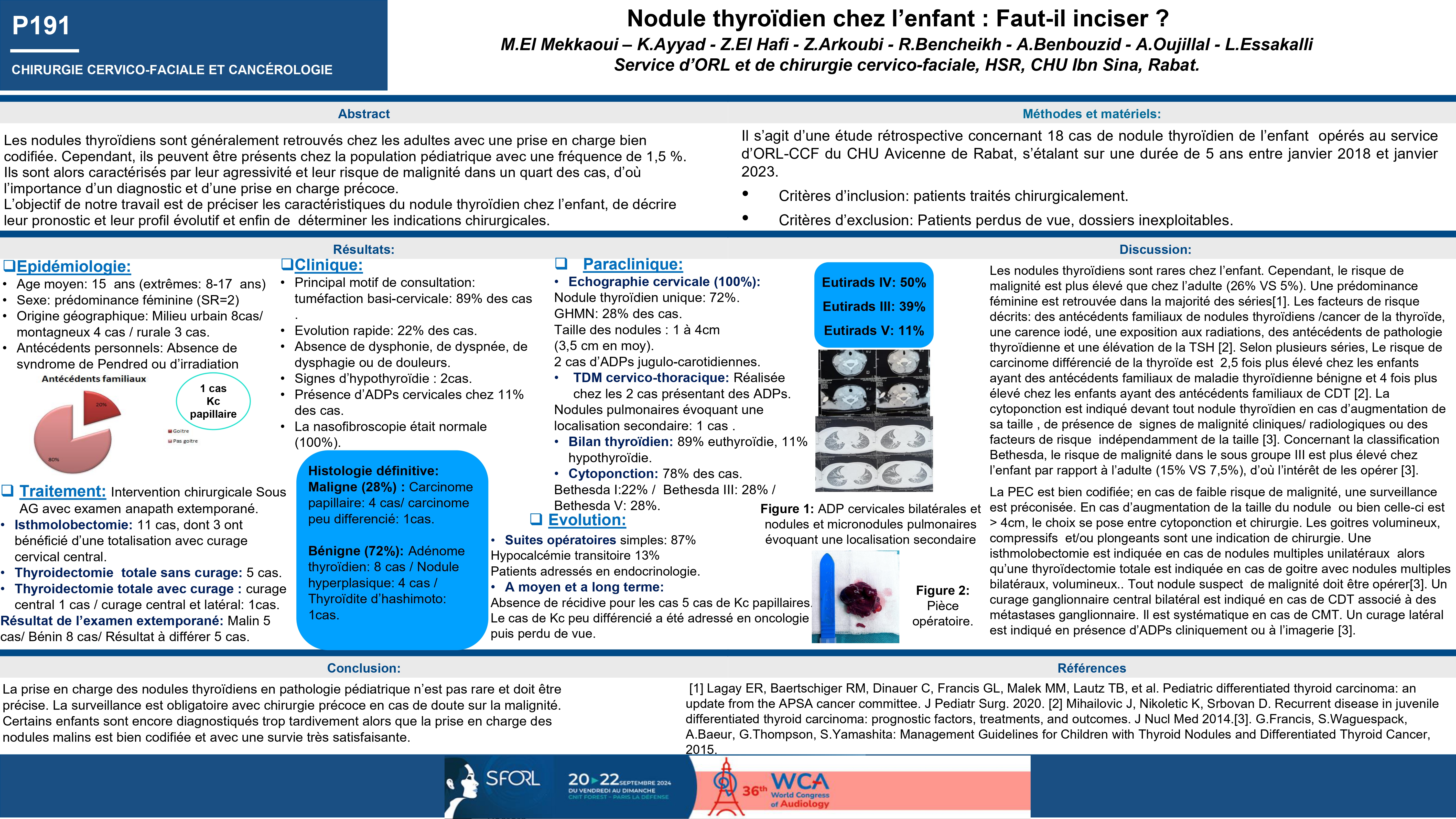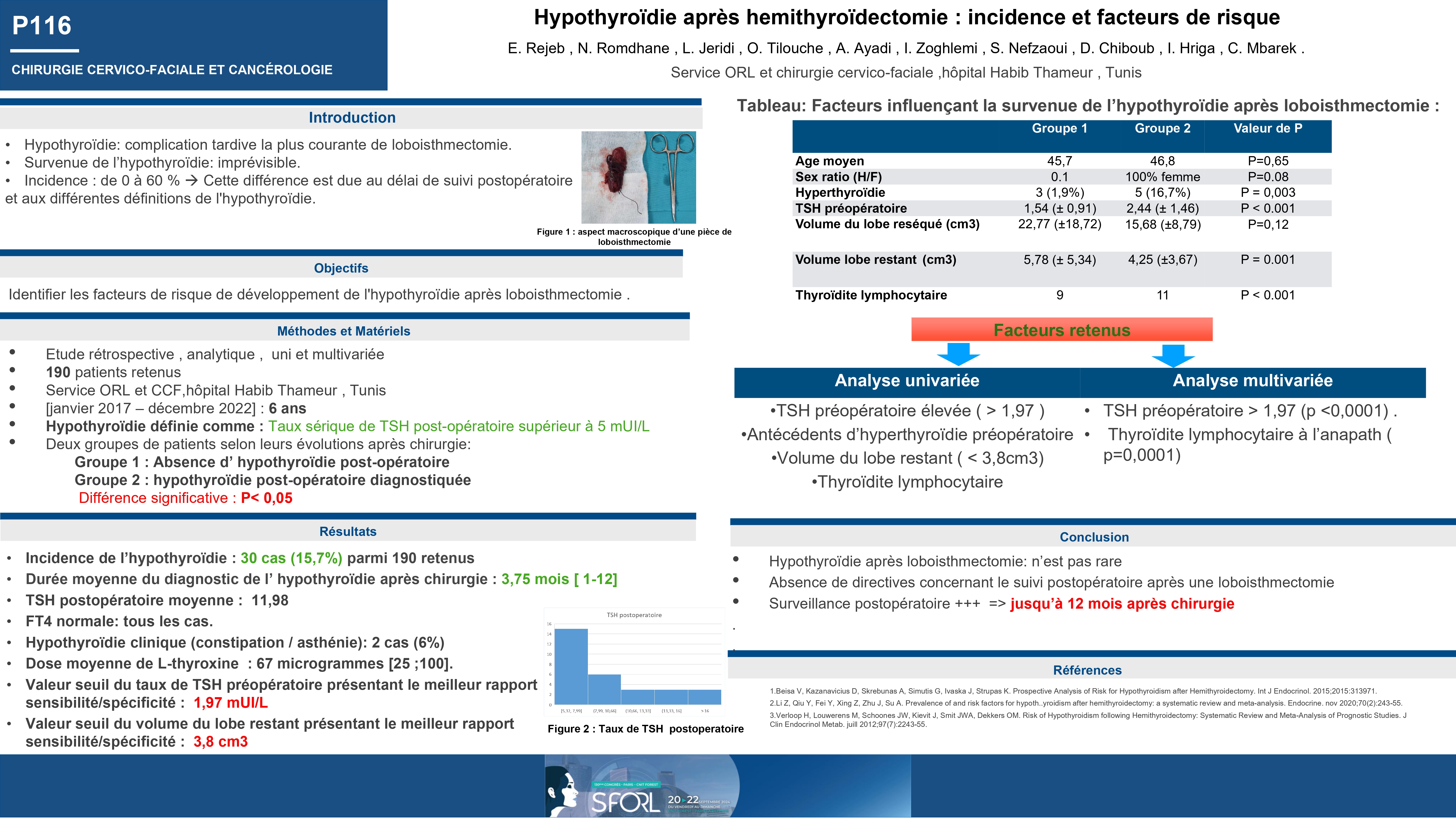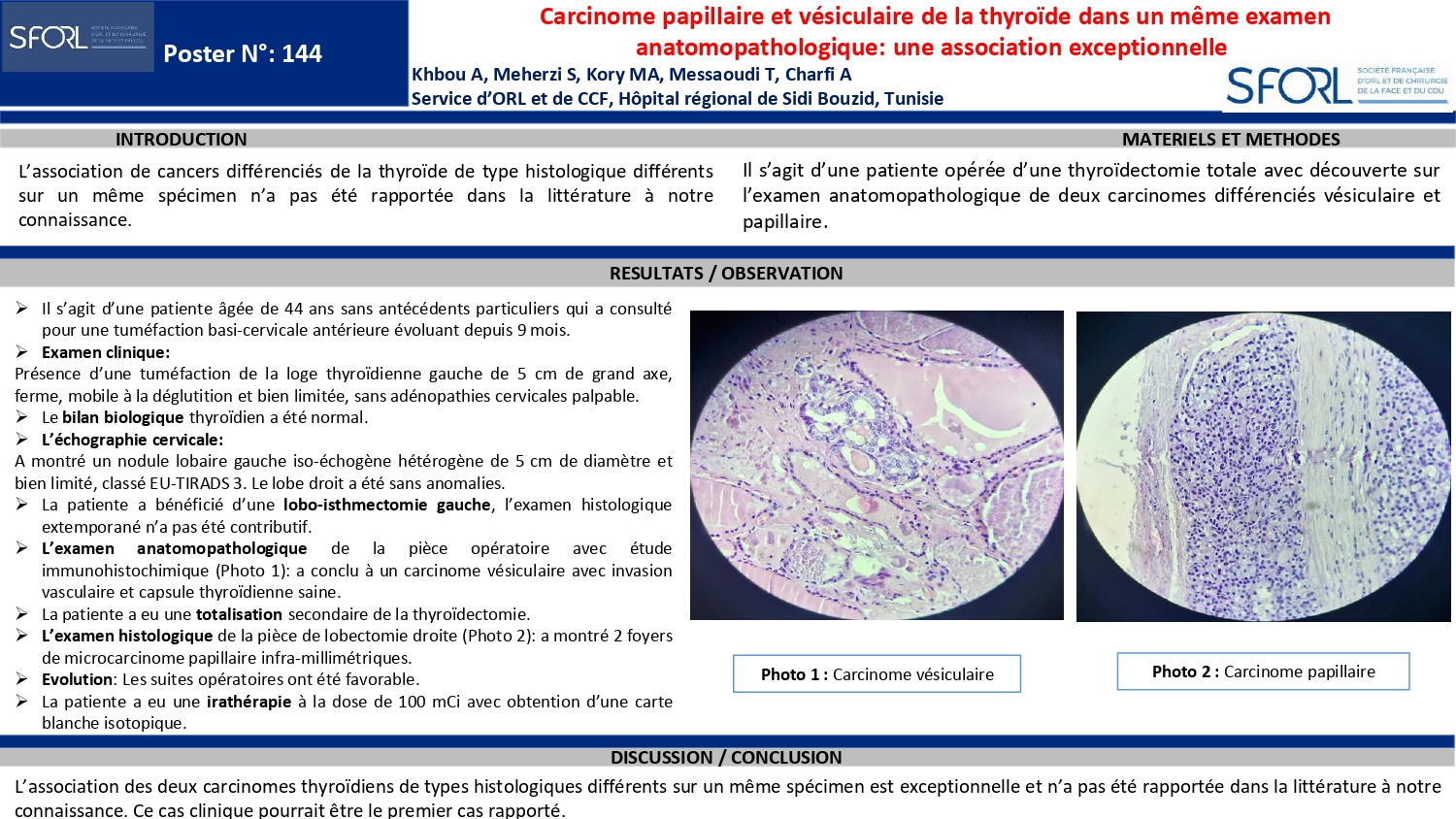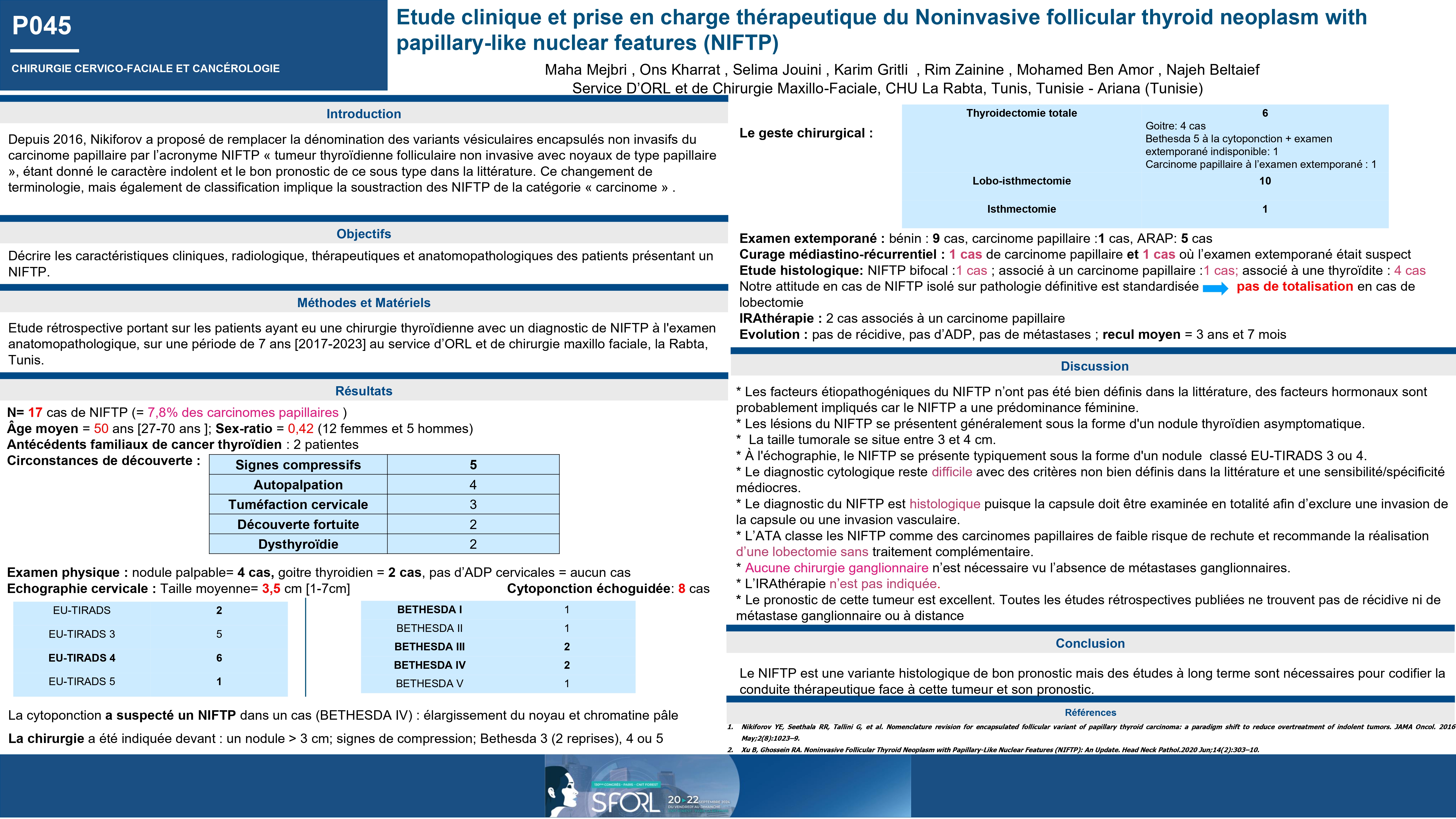 | P045 – Etude clinique et prise en charge thérapeutique du Noninvasive follicular thyroid neoplasm with papillary-like nuclear features (NIFTP) | Chirurgie cervico-faciale et Cancérologie | chirurgie-cervico-faciale-et-cancerologie | |