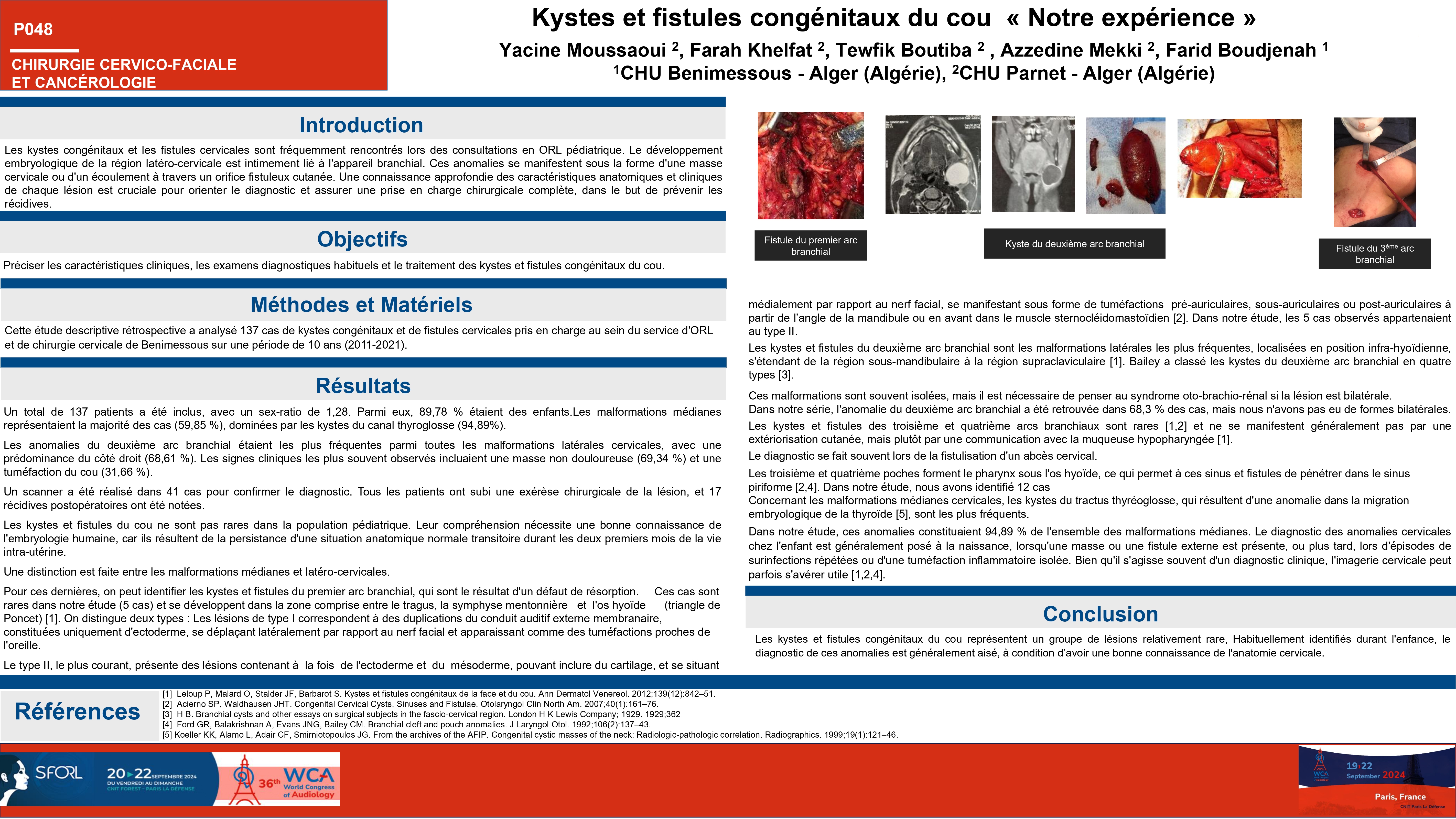 | P048 – Kystes et fistules congénitaux du cou . Notre expérience | Chirurgie cervico-faciale et Cancérologie | chirurgie-cervico-faciale-et-cancerologie | |
